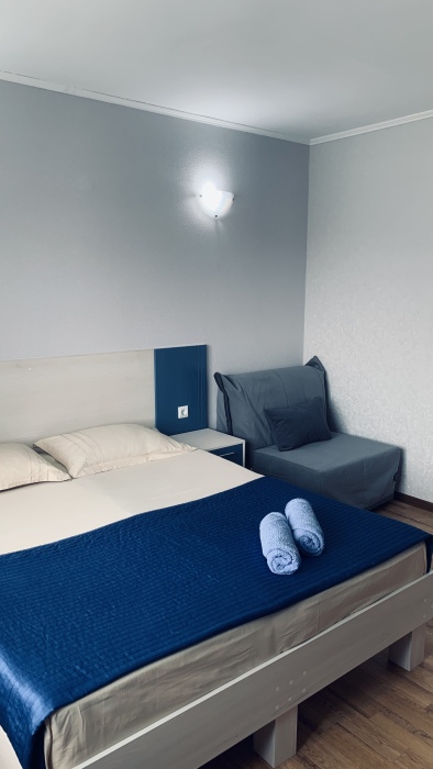 Светлый просторный номер подойдет семейной паре с ребенком либо супружеской паре. Номер оснощен всем необходимым для комфортного отдыха : кондиционер, холодильник, телевизор, чайник и чайные принадлежности , санузел,
