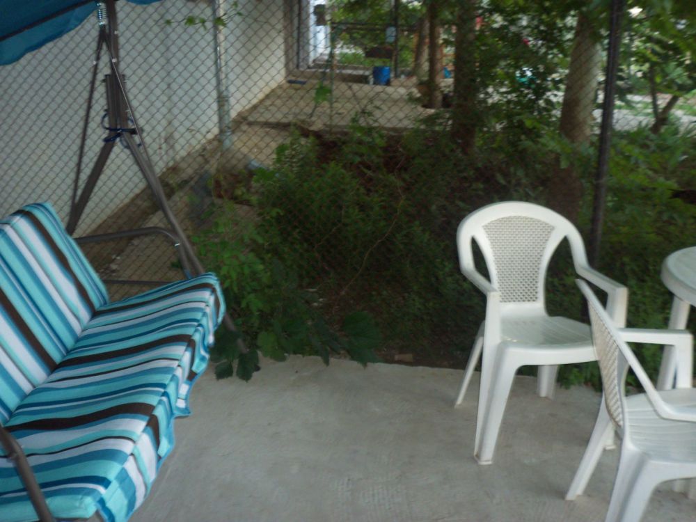 Выход на задний двор, есть мангал и принадлежности(шампура и решетки), пластиковая садовая мебель.