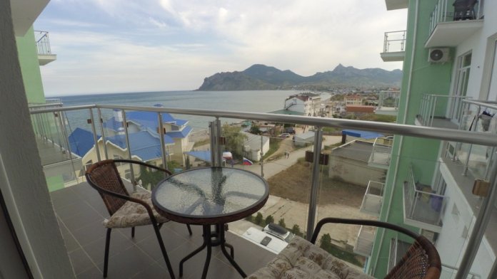 Квартира расположена на 5-м этаже 7-ми этажного нового дома, в 80 м от пляжа Черного моря. С окна и балкона открывается вид на Черное море, гору Кара-Даг и пос. Коктебель.