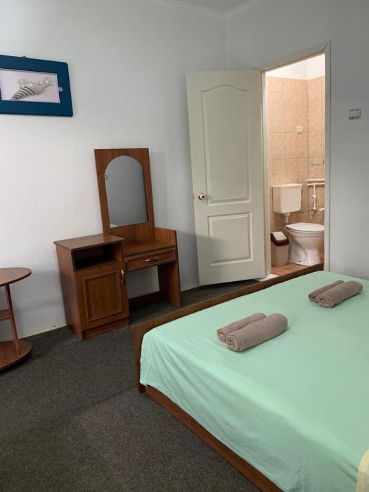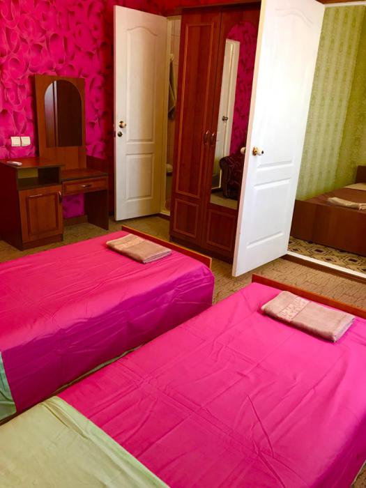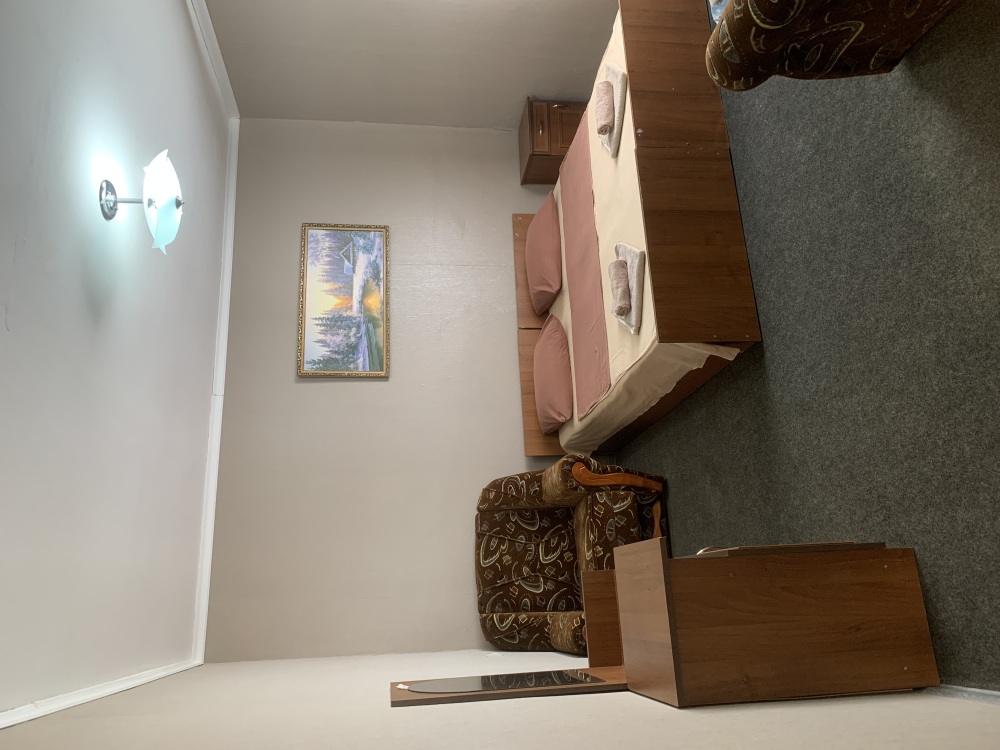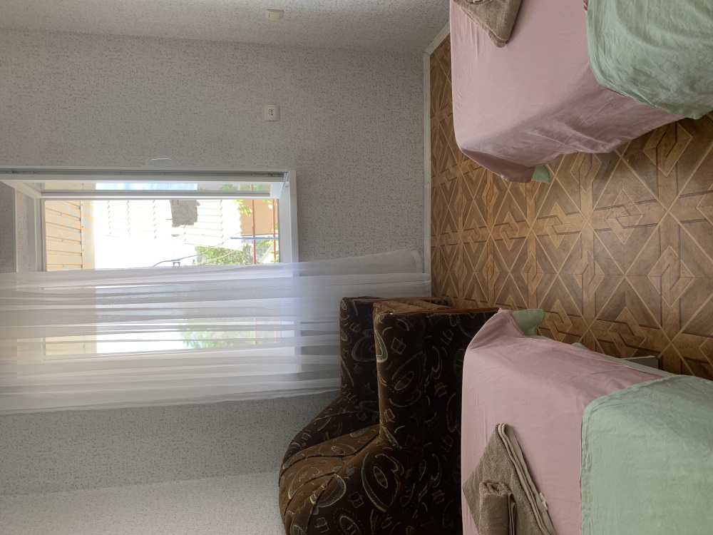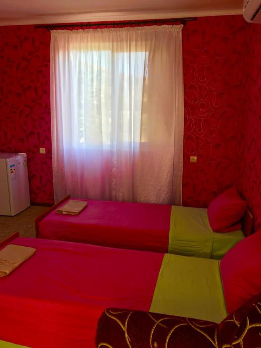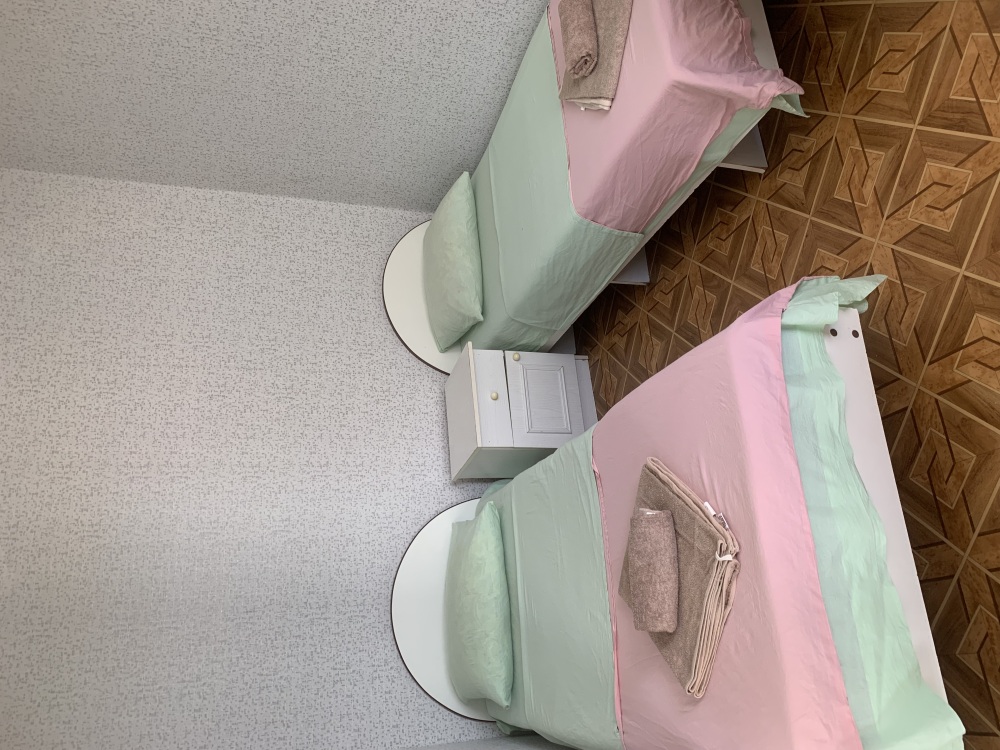 в номере одна двух спальная кровать,шкаф,тумбочка,кондиционер,холодильник,телевизор, санузел (холодная и горячая вода постоянно) , интернет.