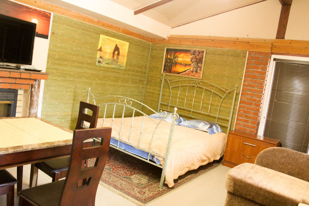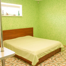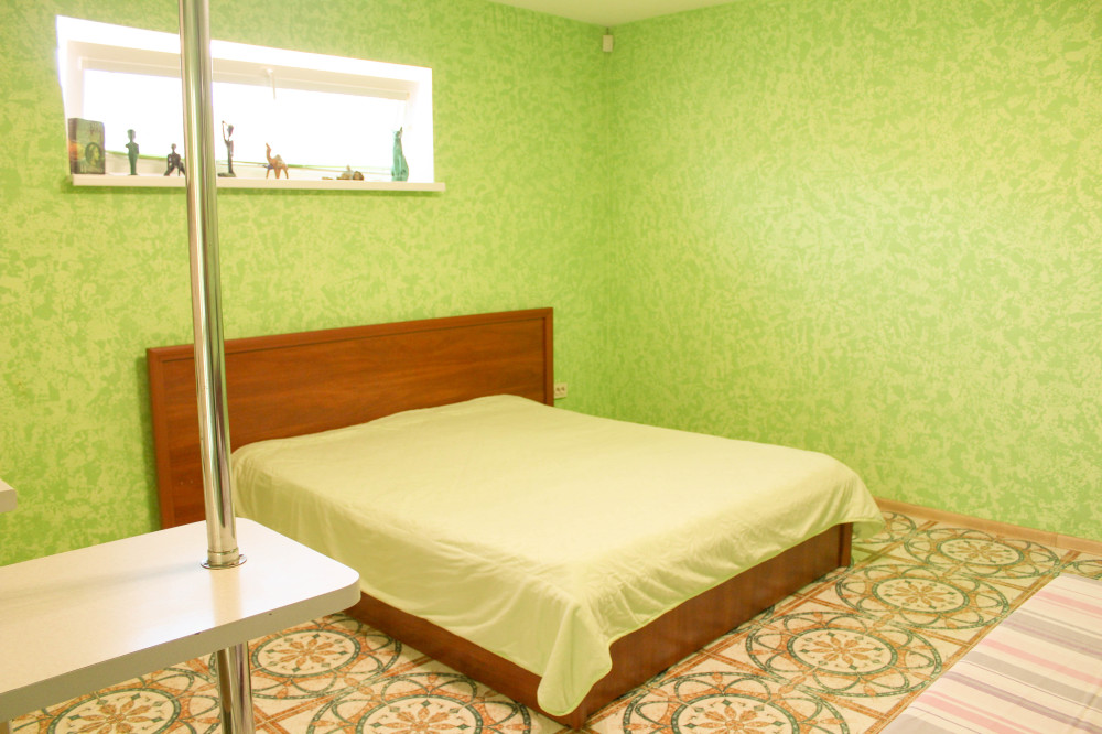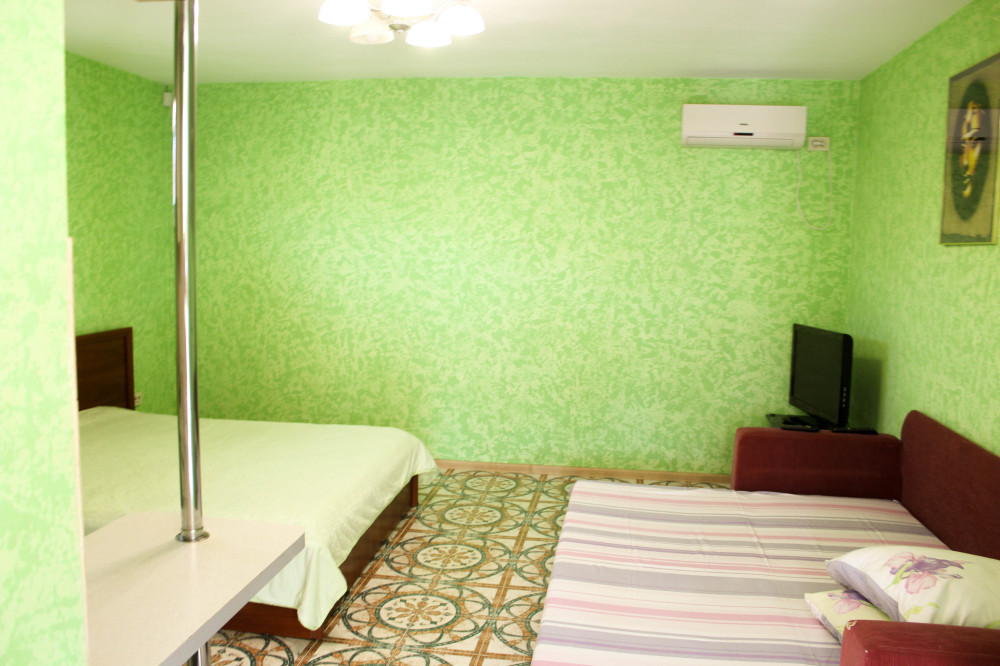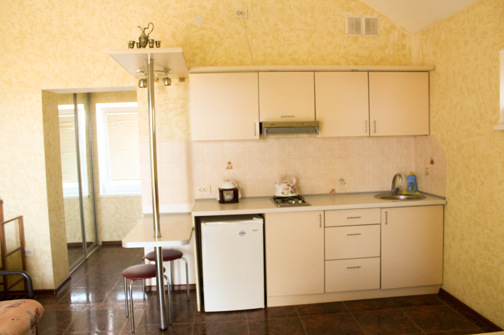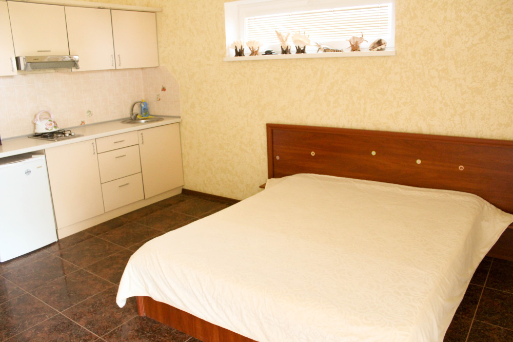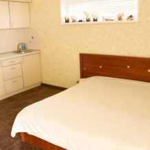 Номер-студия на первом этаже. В номере: двуспальная кровать, двуспальный диван, собственная кухня, ванная комната. Есть отдельный вход.
