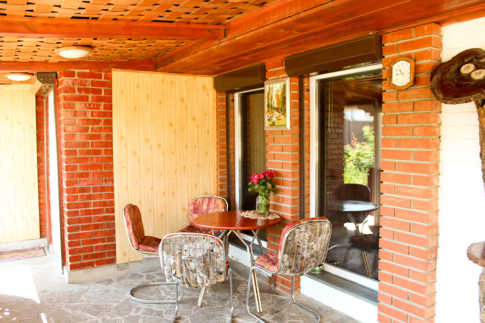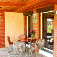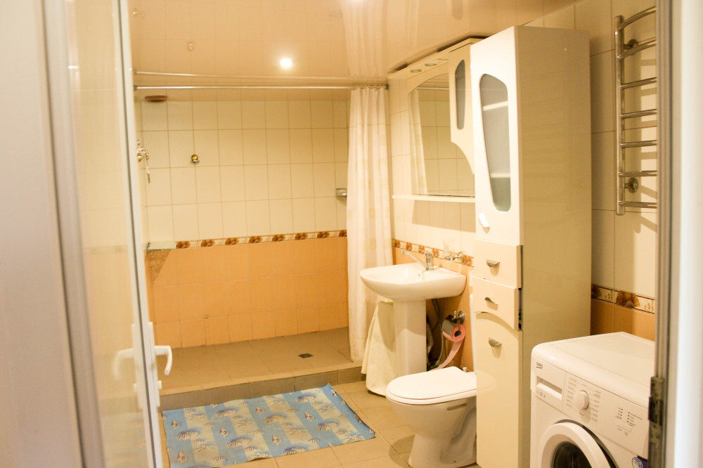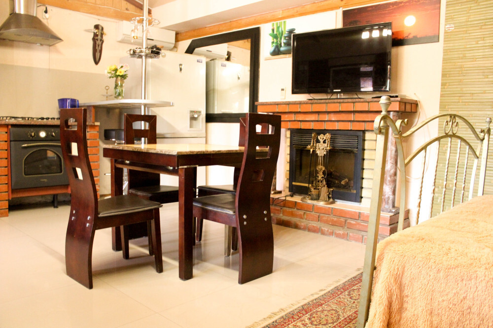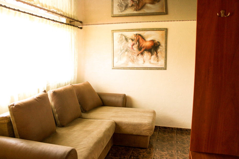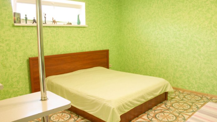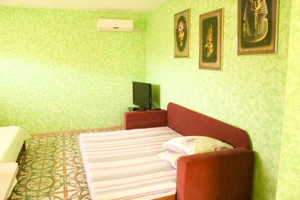 Номер-студия на первом этаже. В номере: двуспальная кровать, двуспальный диван, собственная кухня, ванная комната. Есть отдельный вход.