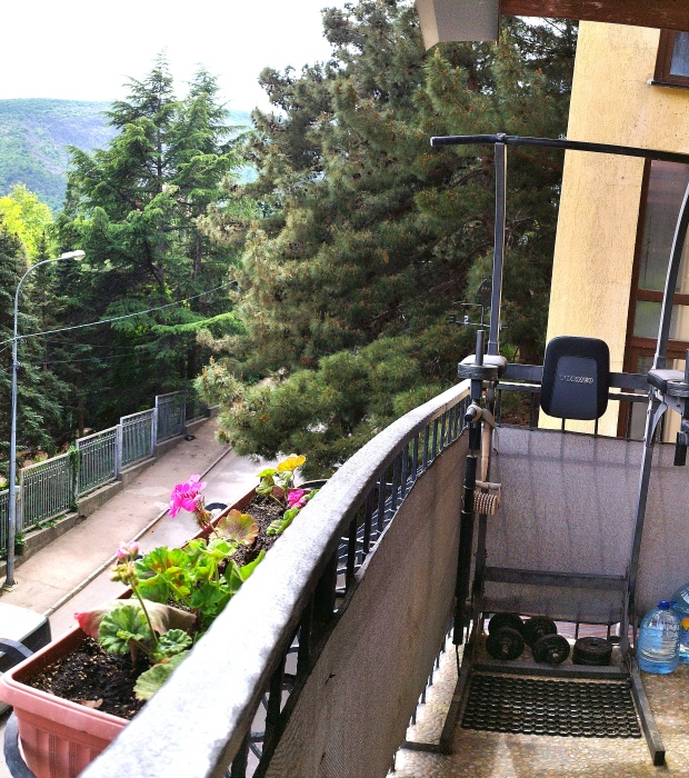 На балконе: зона отдыха (стол, 2 кресла, лежак), спорт площадка, инвентарь, сушилка для белья.