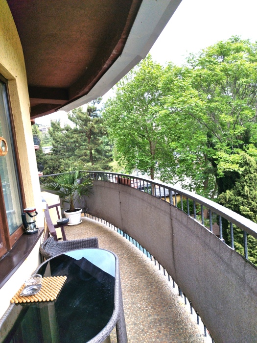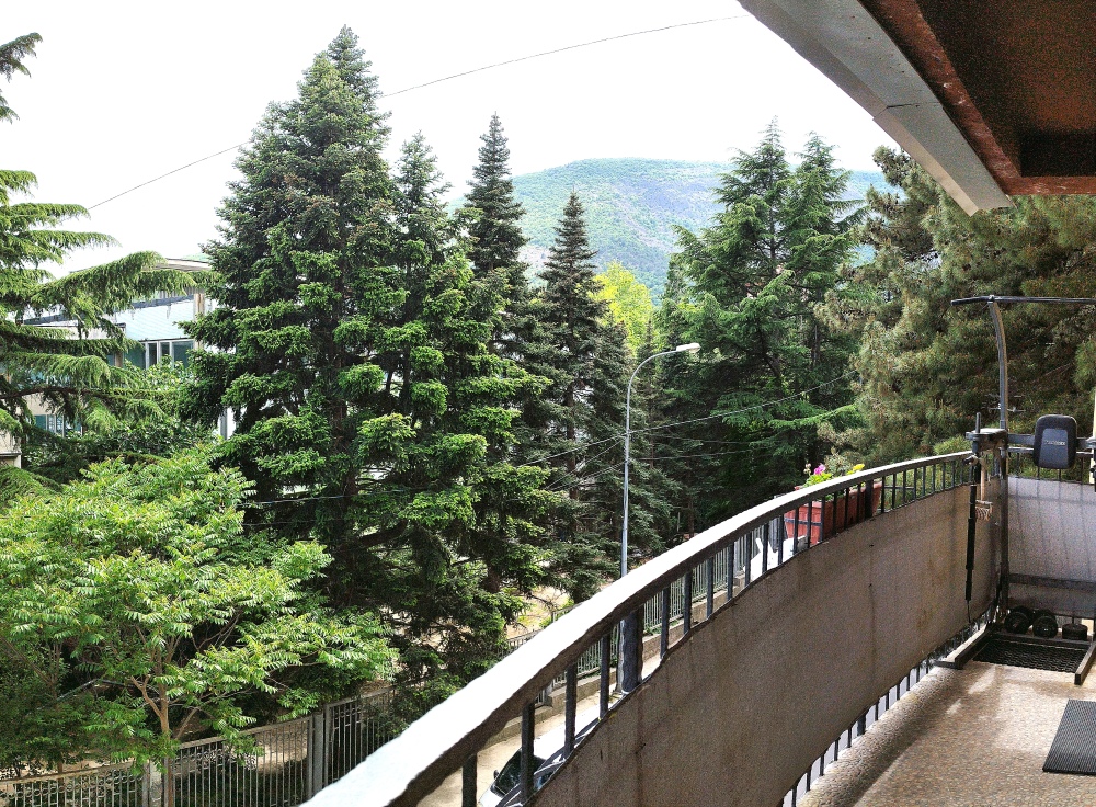 Окна и балкон-терраса (авторское решение архитектора - 20 метров длиной) выходят на море, парк санатория и Медведь-гору (АЮ-ДАГ). Есть лифт, видеонаблюдение по периметру дома. Бесплатная автостоянка.