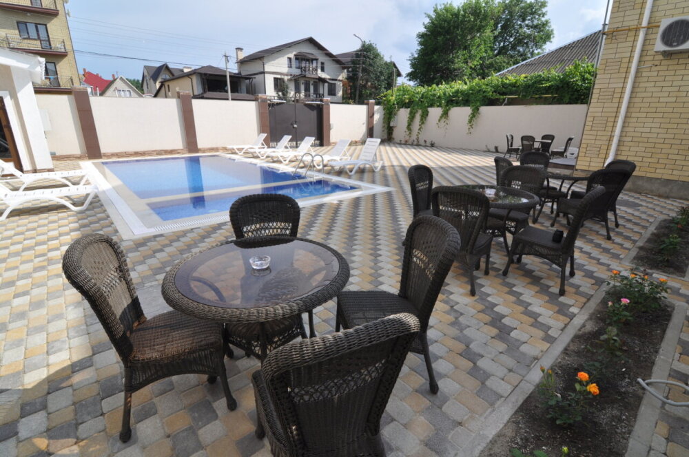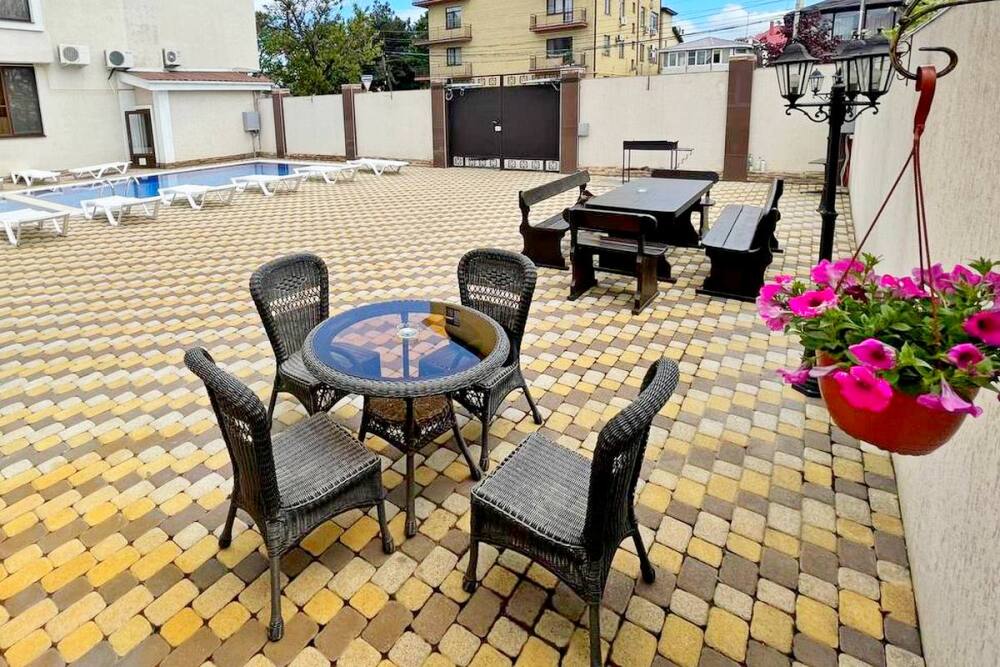 На закрытой территории отеля есть уютный зеленый дворик. Все здесь предусмотрено для комфортного отдыха. Вы можете удобно расположиться за столиками, устроить обед и даже разжечь мангал! Все необходимое для барбекю есть в отеле.