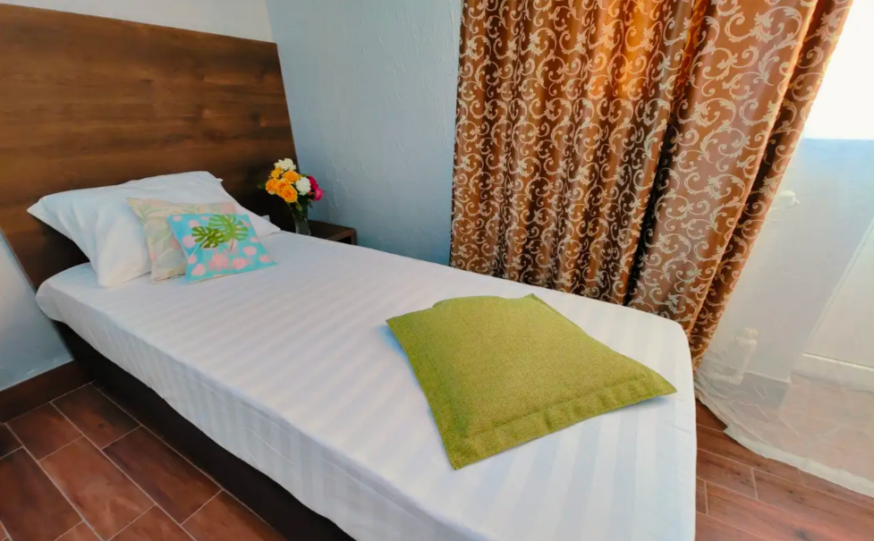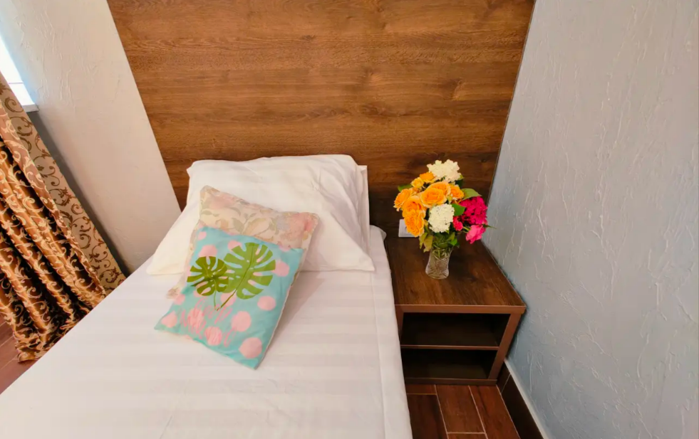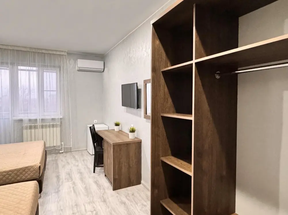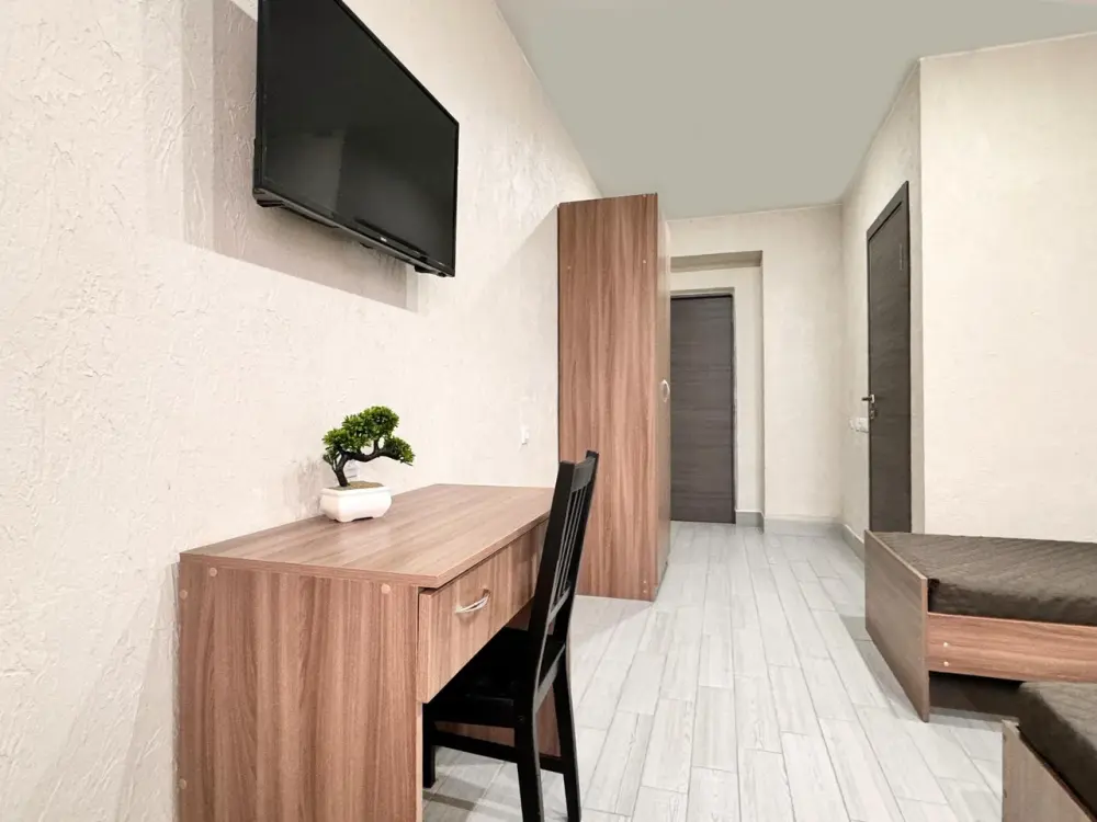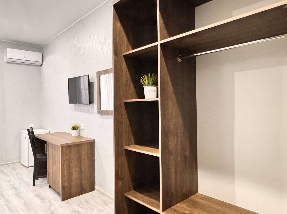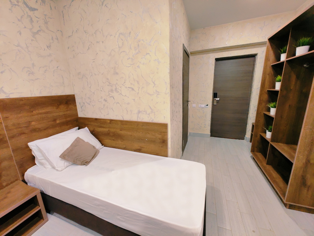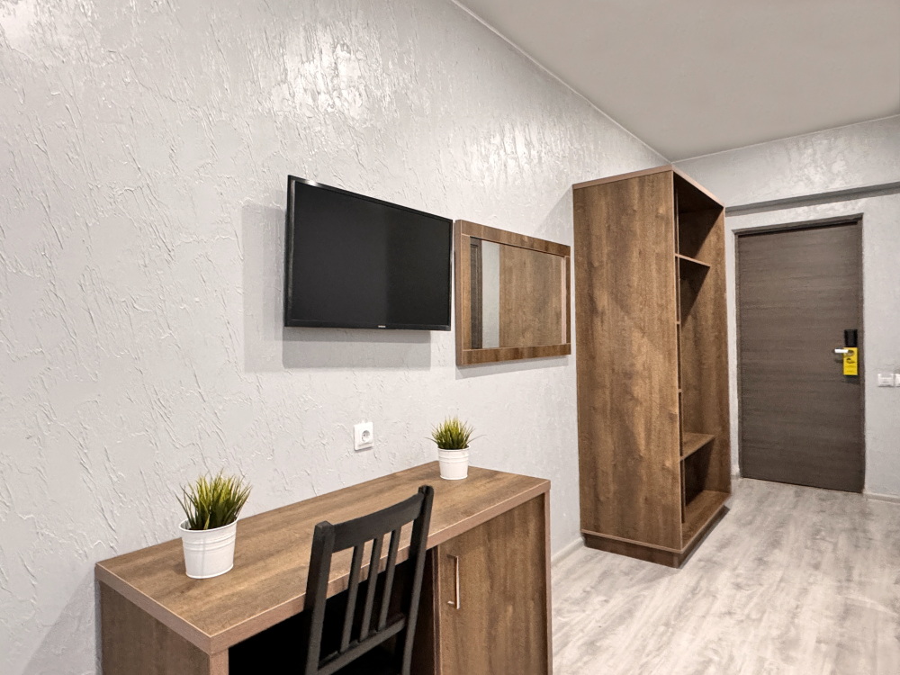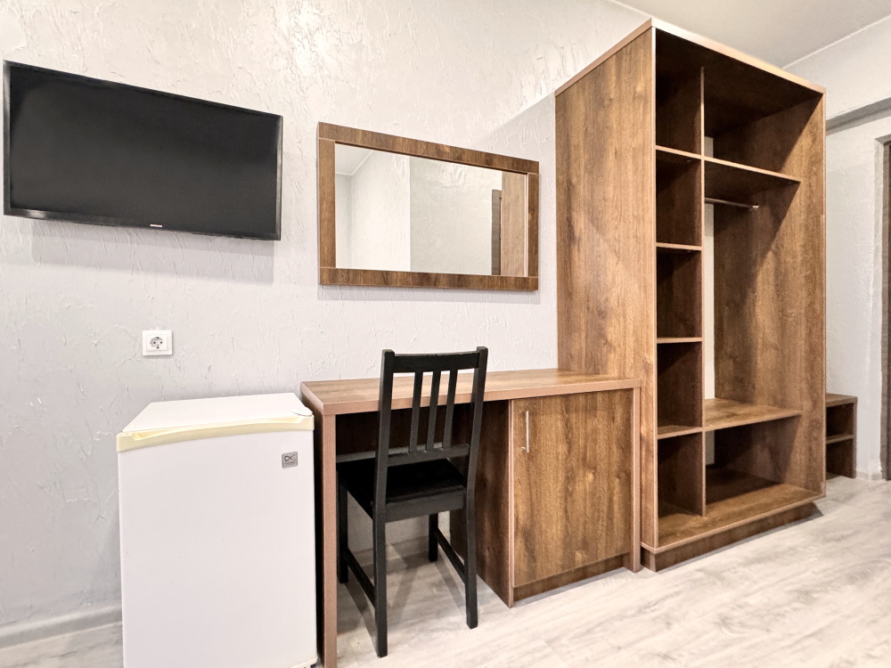 Уютный стандартный номер идеально подходит для комфортного проживания одного гостя. Номер оснащен: односпальной кроватью, телевизором, мини-холодильником, кондиционером, wi-fi, столом и стульями, шкафом для хранения вещей. Санузлом и душем в номере. Номер без балкона. Небольшое окно.