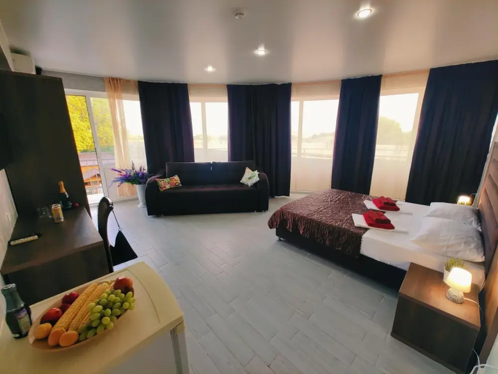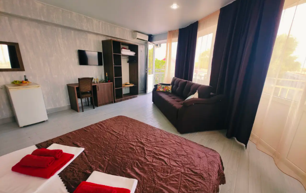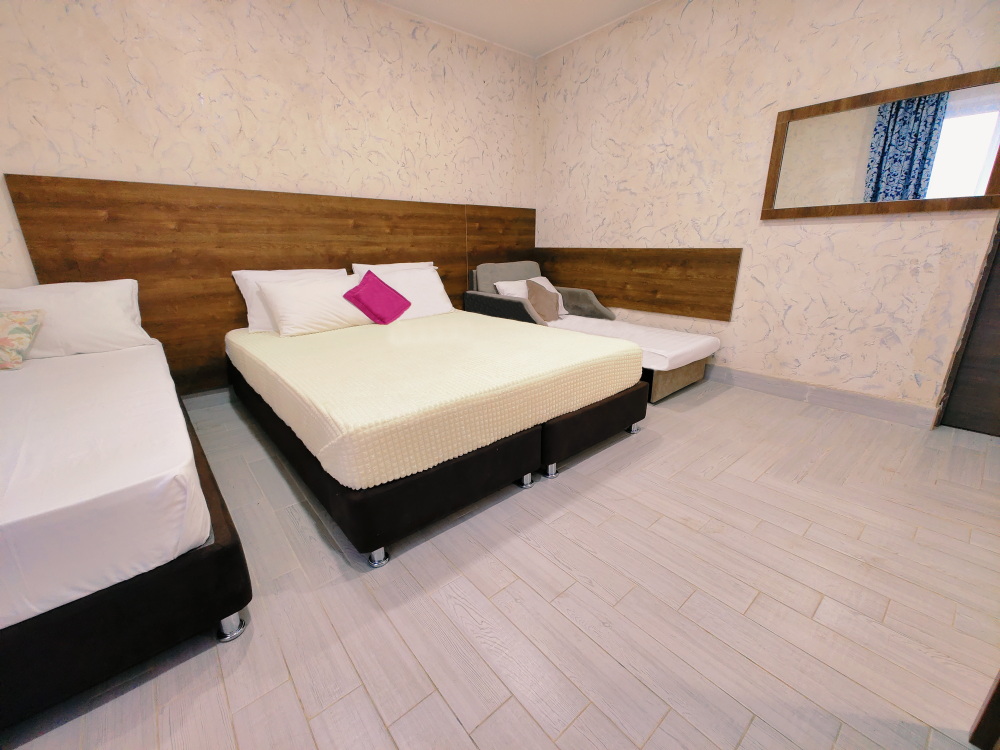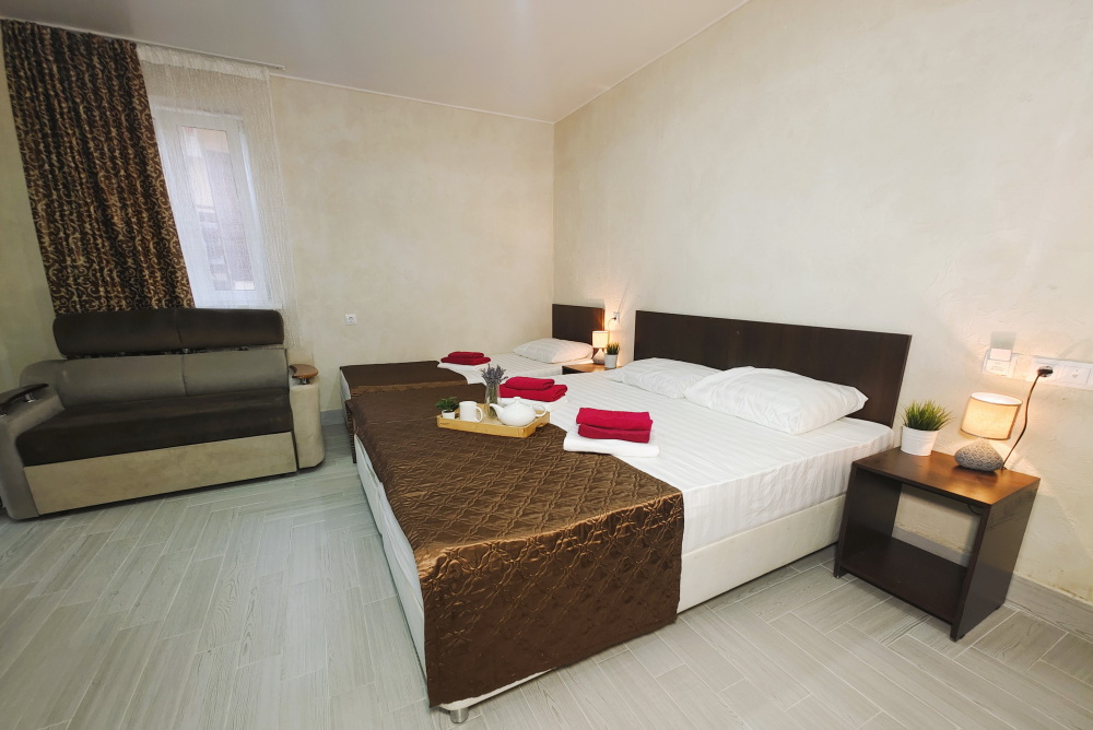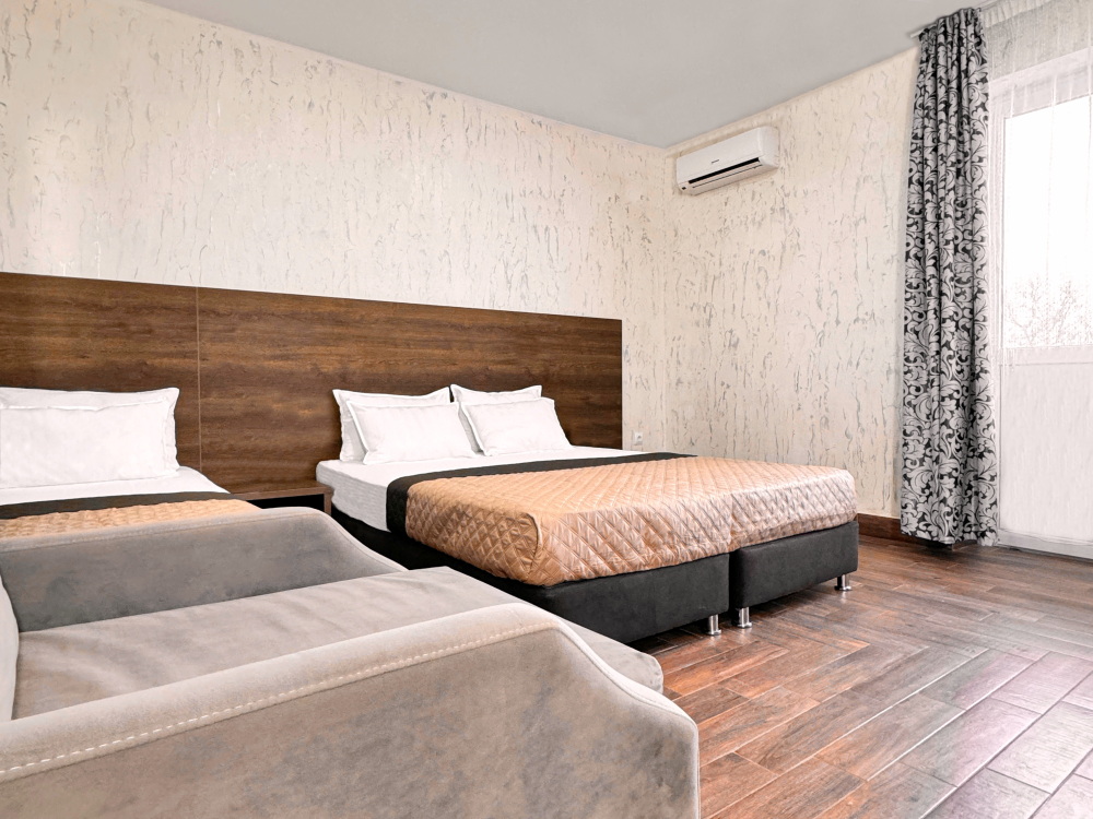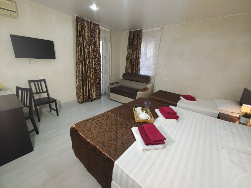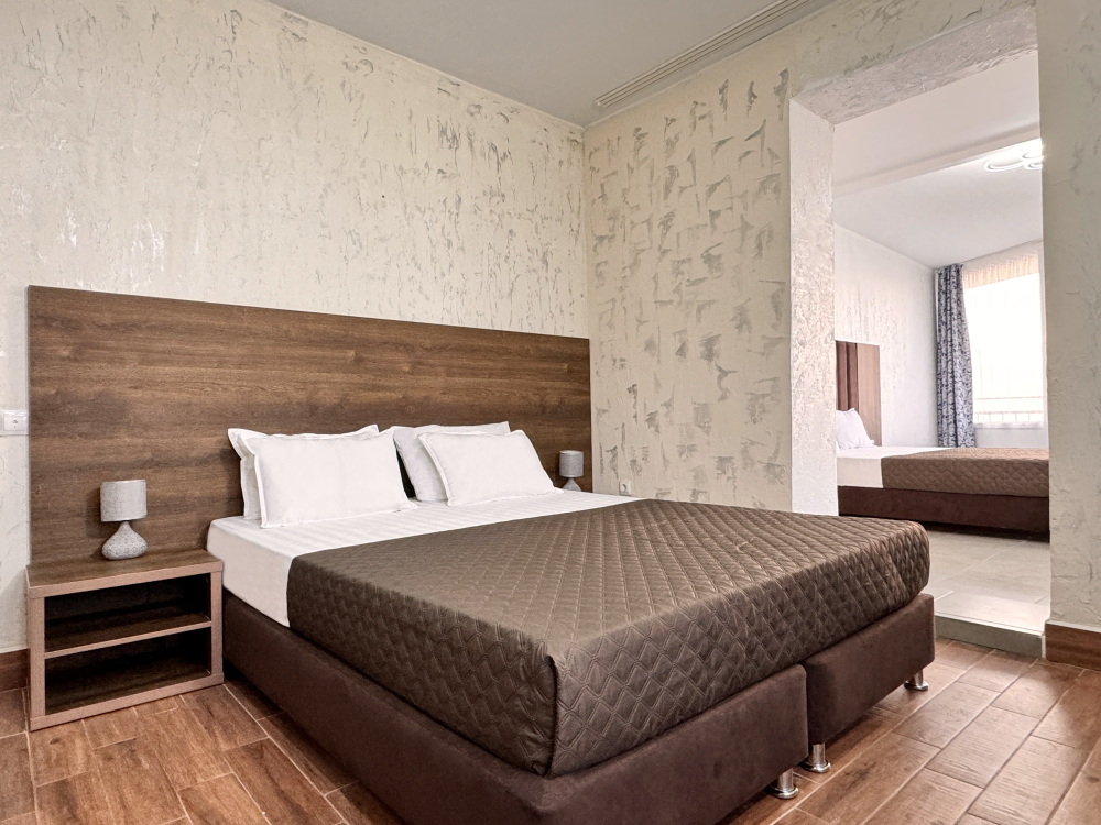 Комфортабельный и уютный двухкомнатный Люкс оснащен: двумя двуспальными кроватями и двуспальным диваном, кондиционером, шкафом для одежды и всей необходимой мебелью. Также в номере есть мини-холодильник, телевизор и Wi-Fi. Имеется просторный балкон для отдыха на свежем воздухе. Проведите незабываемое время в нашем отеле и наслаждайтесь комфортом.