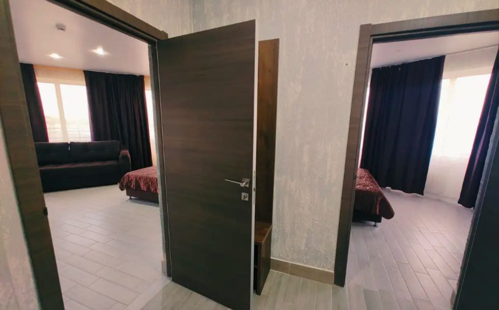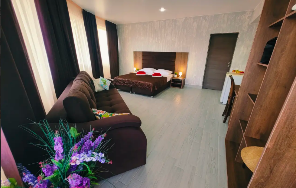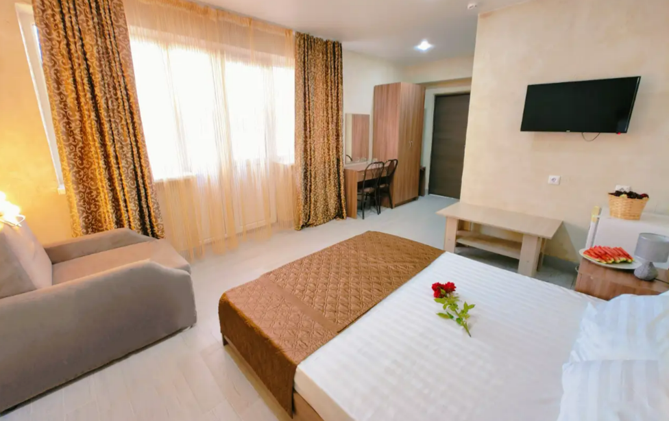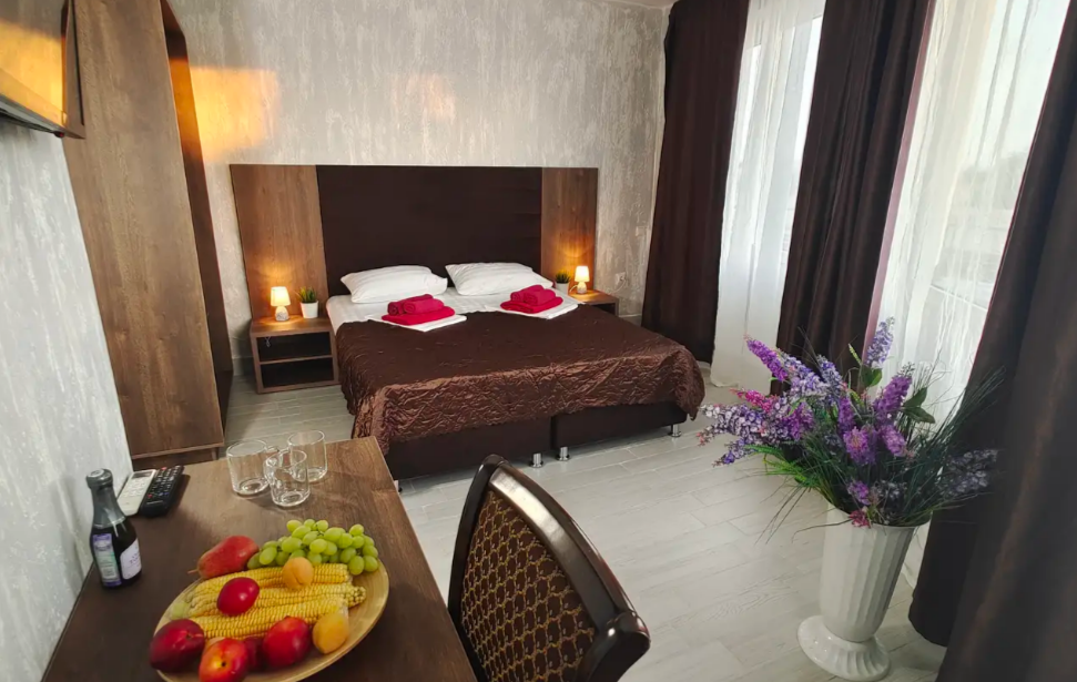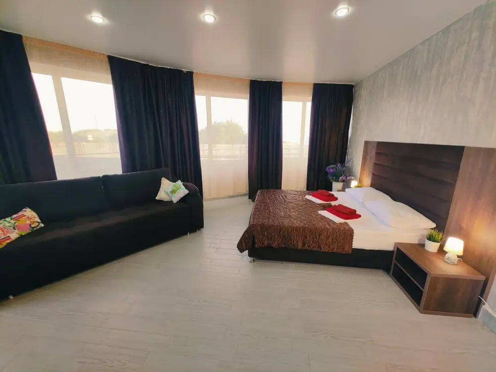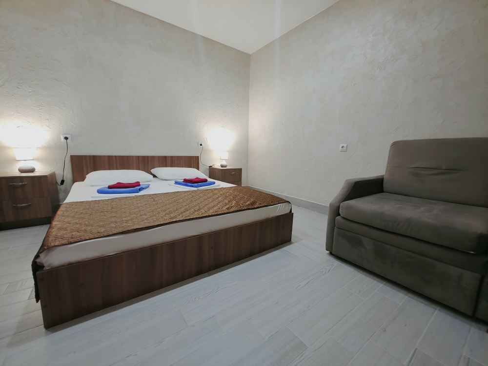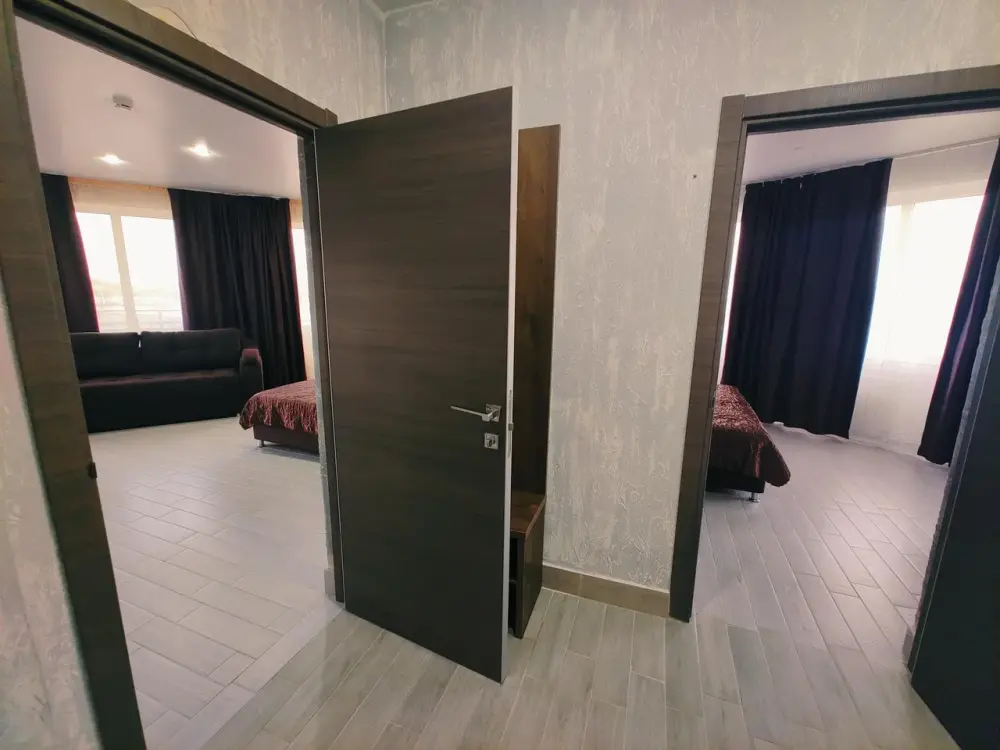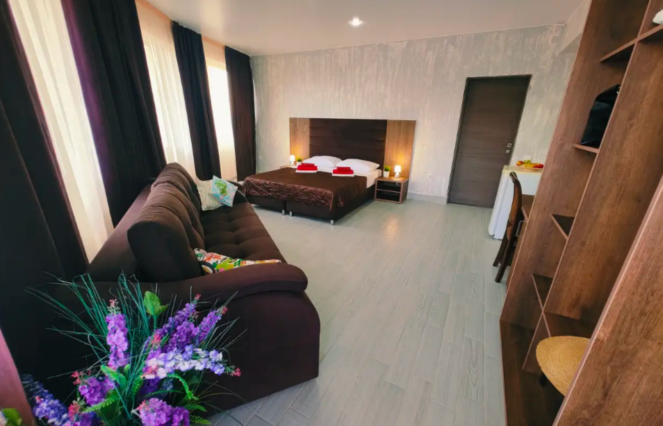 Комфортабельный и уютный двухкомнатный Люкс оснащен: двумя двуспальными кроватями и двуспальным диваном, кондиционером, шкафом для одежды и всей необходимой мебелью. Также в номере есть мини-холодильник, телевизор и Wi-Fi. Имеется просторный балкон для отдыха на свежем воздухе. Проведите незабываемое время в нашем отеле и наслаждайтесь комфортом.