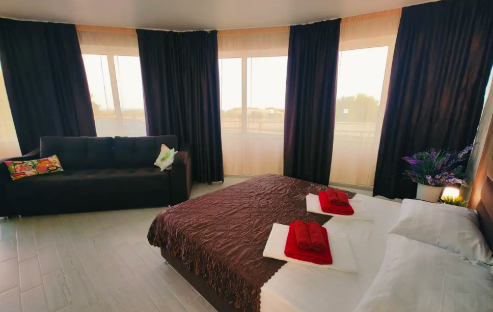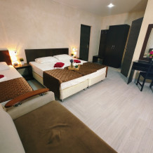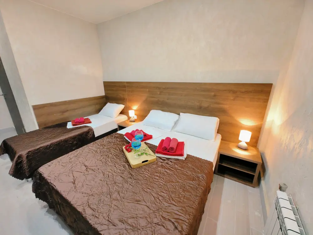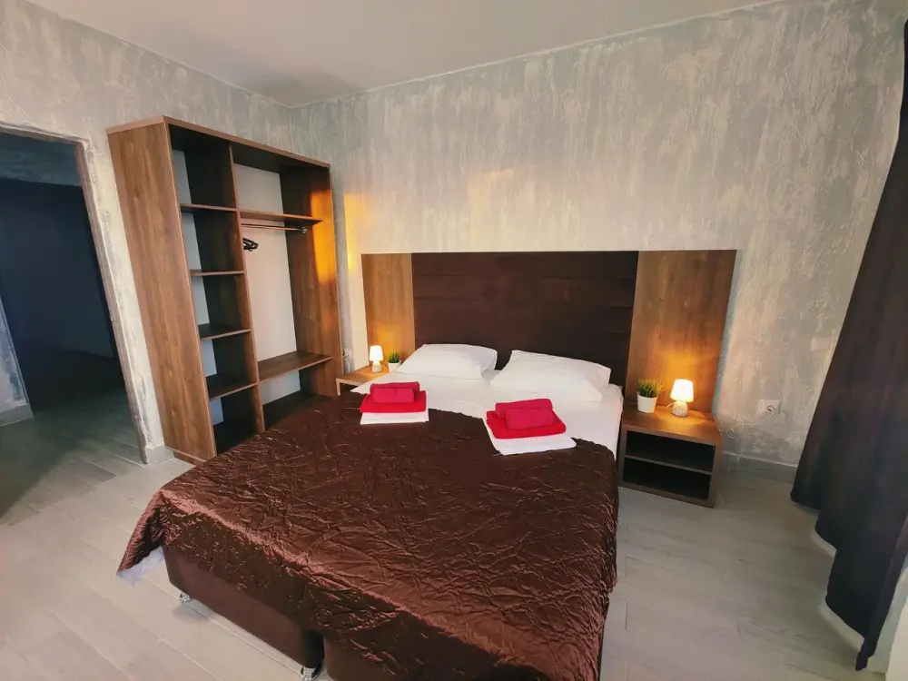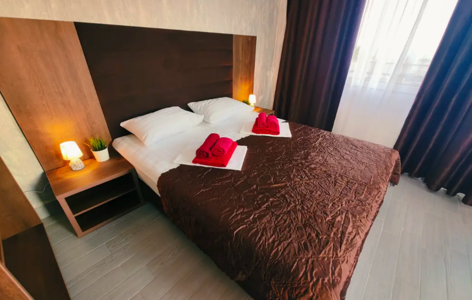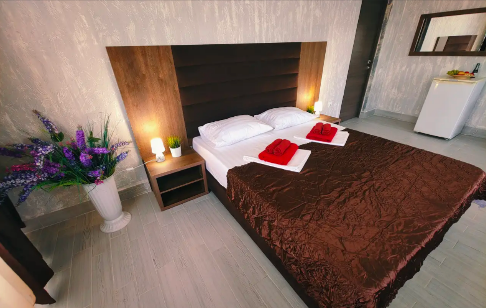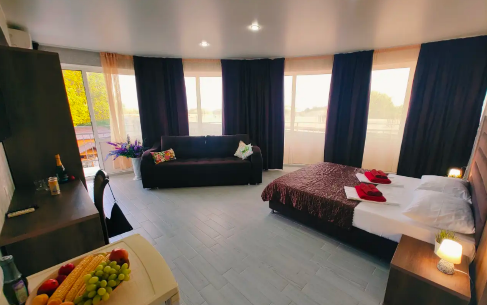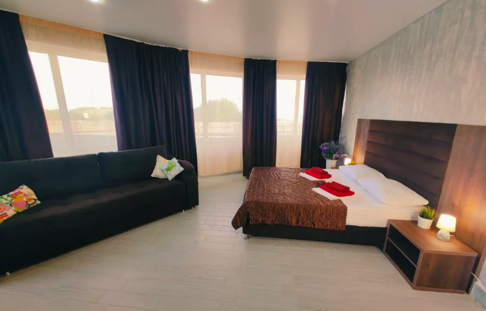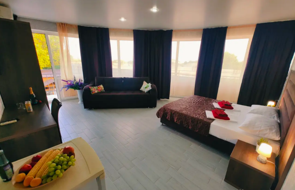 Комфортабельный и уютный двухкомнатный Люкс оснащен: двумя двуспальными кроватями и двуспальным диваном, кондиционером, шкафом для одежды и всей необходимой мебелью. Также в номере есть мини-холодильник, телевизор и Wi-Fi. Имеется просторный балкон для отдыха на свежем воздухе. Проведите незабываемое время в нашем отеле и наслаждайтесь комфортом.