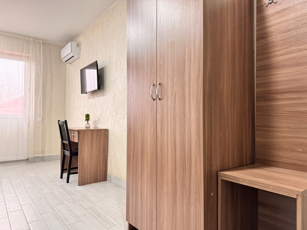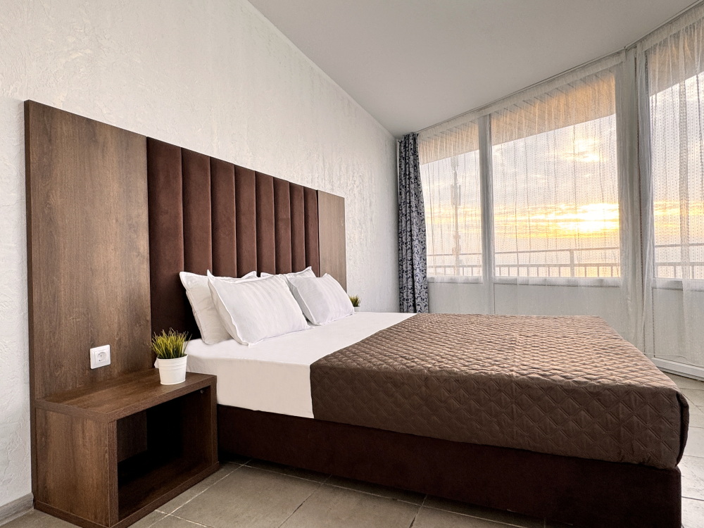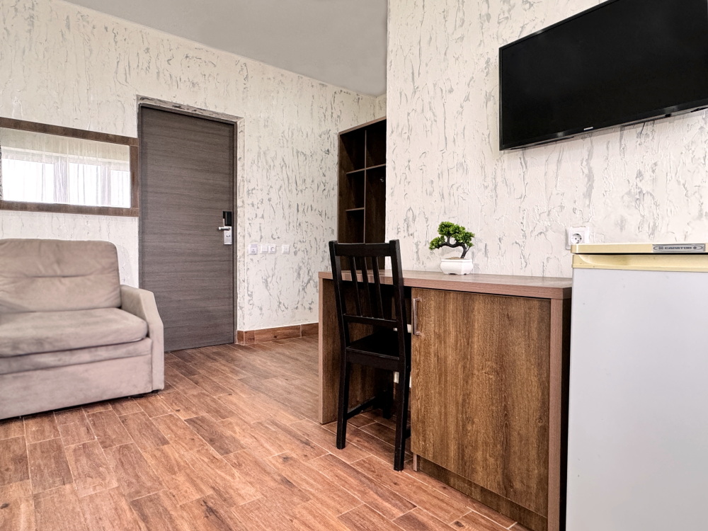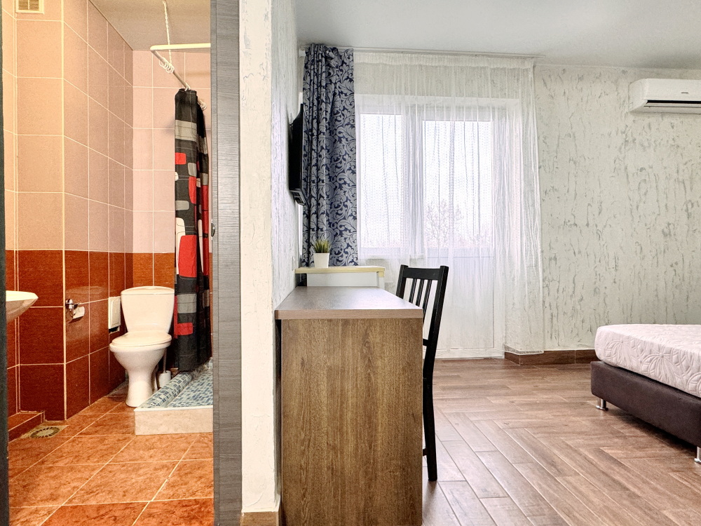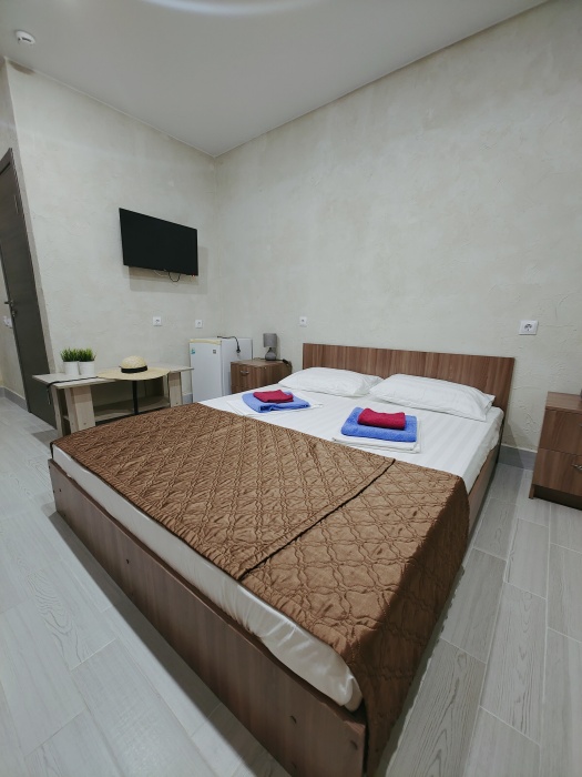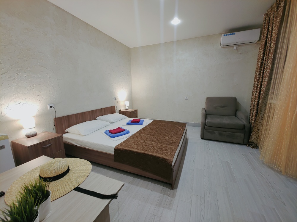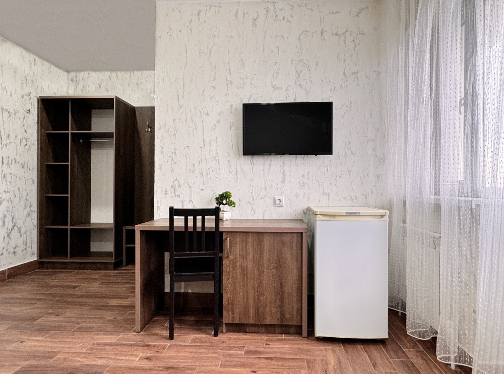 Для вашего комфортного и незабываемого отдыха мы рады предложить прекрасный однокомнатный номер с видом на море. В нем есть все необходимое для вашего отдыха: двуспальная кровать, прикроватные тумбочки, стол, телевизор, мини-холодильник. Также в номере имеется Wi-Fi, для того чтобы вы всегда оставались на связи. Утром вы можете насладиться чашечкой чая или наблюдать за восходом солнца, а вечером отдохнуть на балконе, наслаждаясь морским бризом и потрясающим закатом. Этот номер станет идеальным выбором для романтического уикенда или незабываемого отпуска.