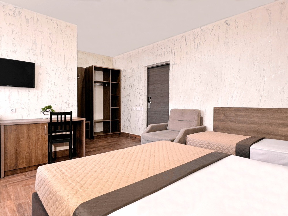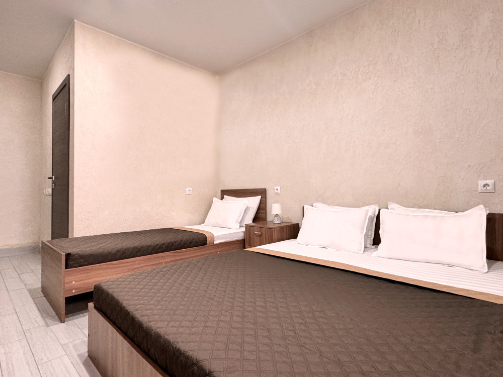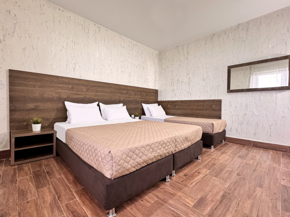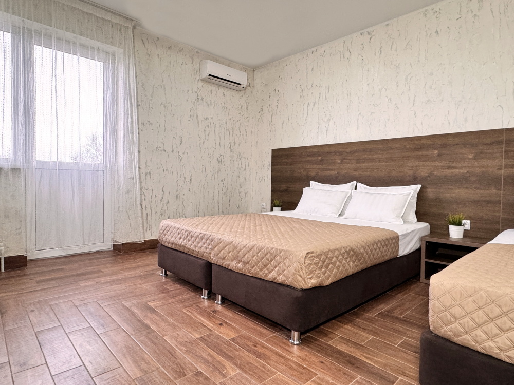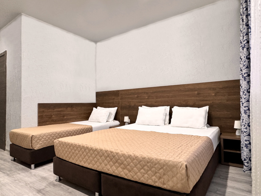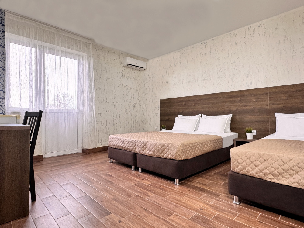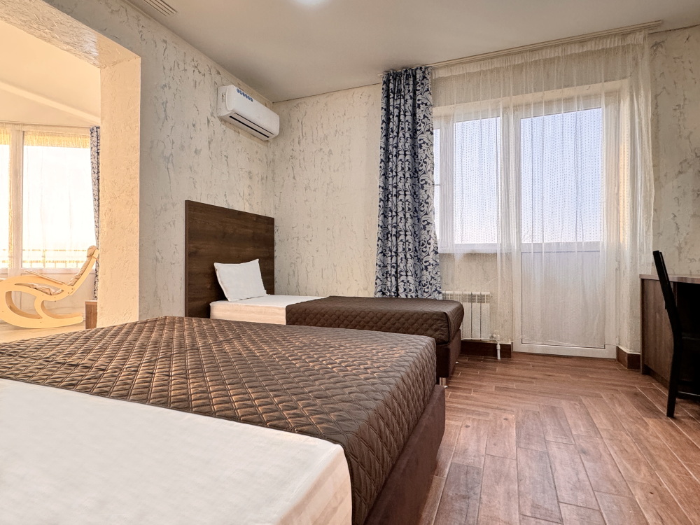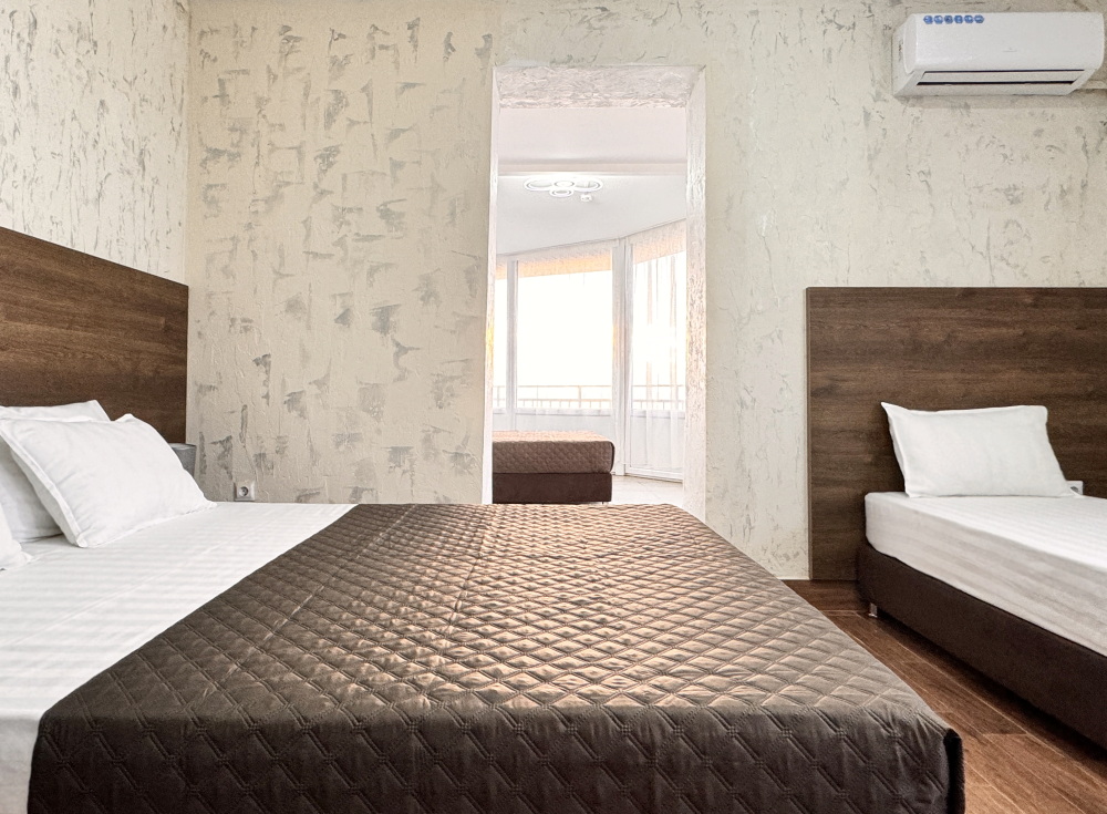 Для тех, кто ценит удобство и комфорт, мы рады предложить номер оснащенный двуспальной и односпальной кроватью и креслом-кроватью. Номер оборудован всем необходимым для комфортного проживания: шкаф для одежды, мини-холодильник, журнальный столик, телевизор и кондиционер, Wi-Fi позволит всегда оставаться на связи. Уютный балкон станет прекрасным местом для утреннего кофе или вечернего отдыха на свежем воздухе. Санузел и душ в номере.