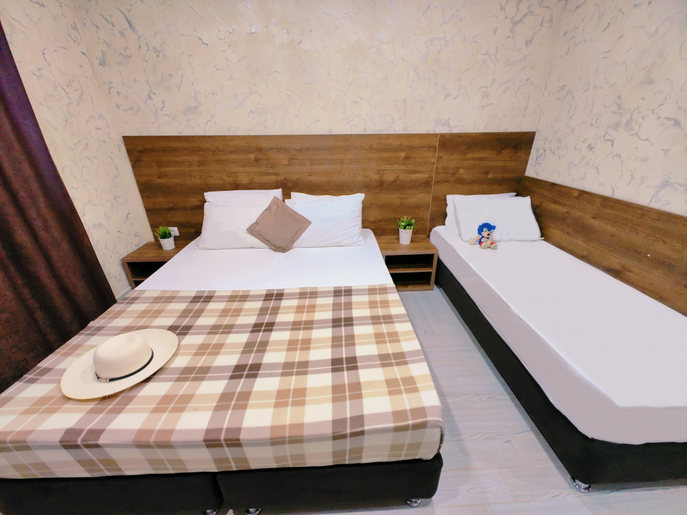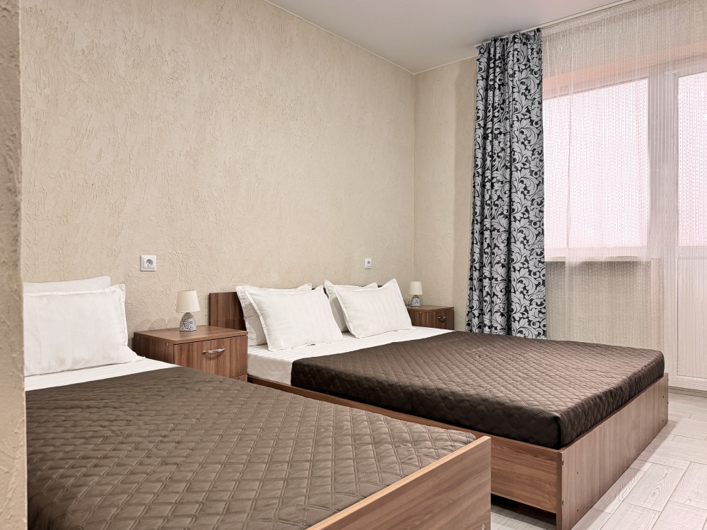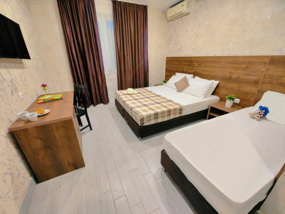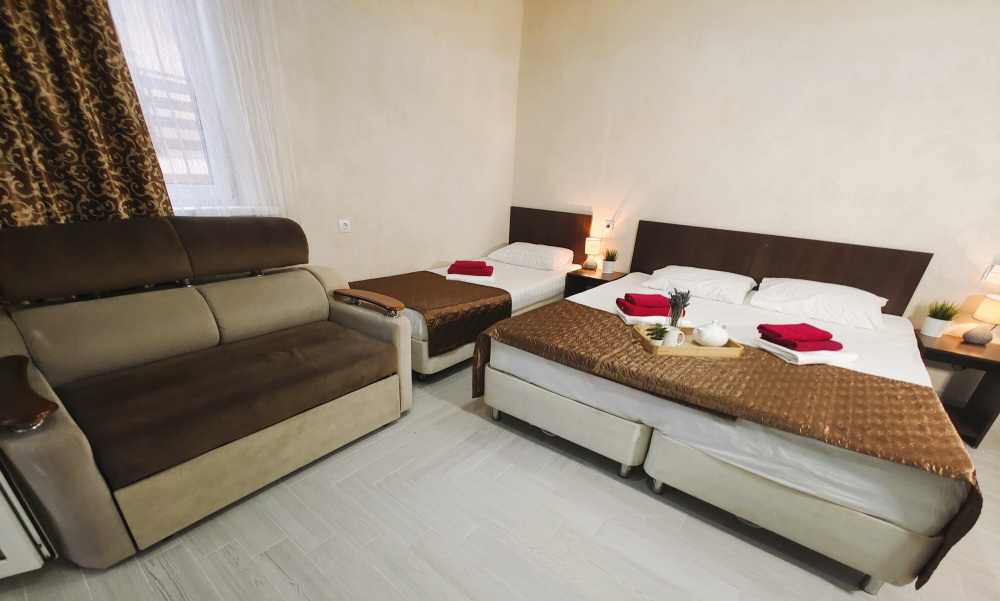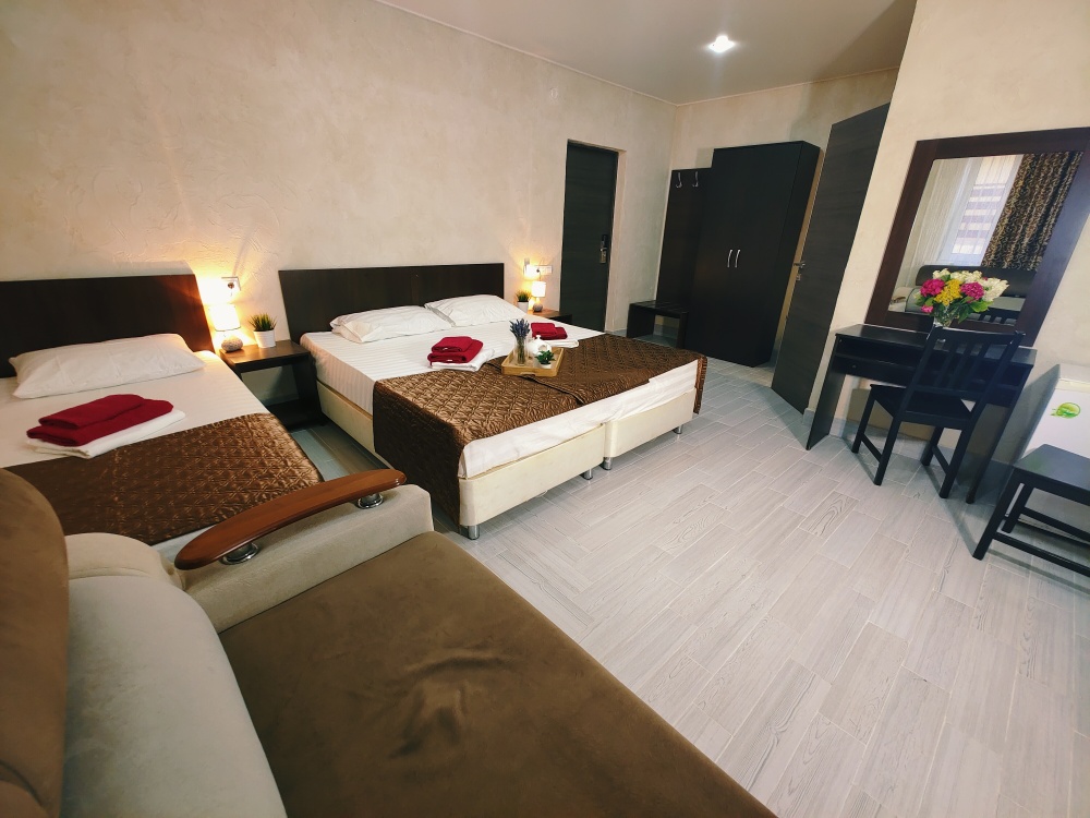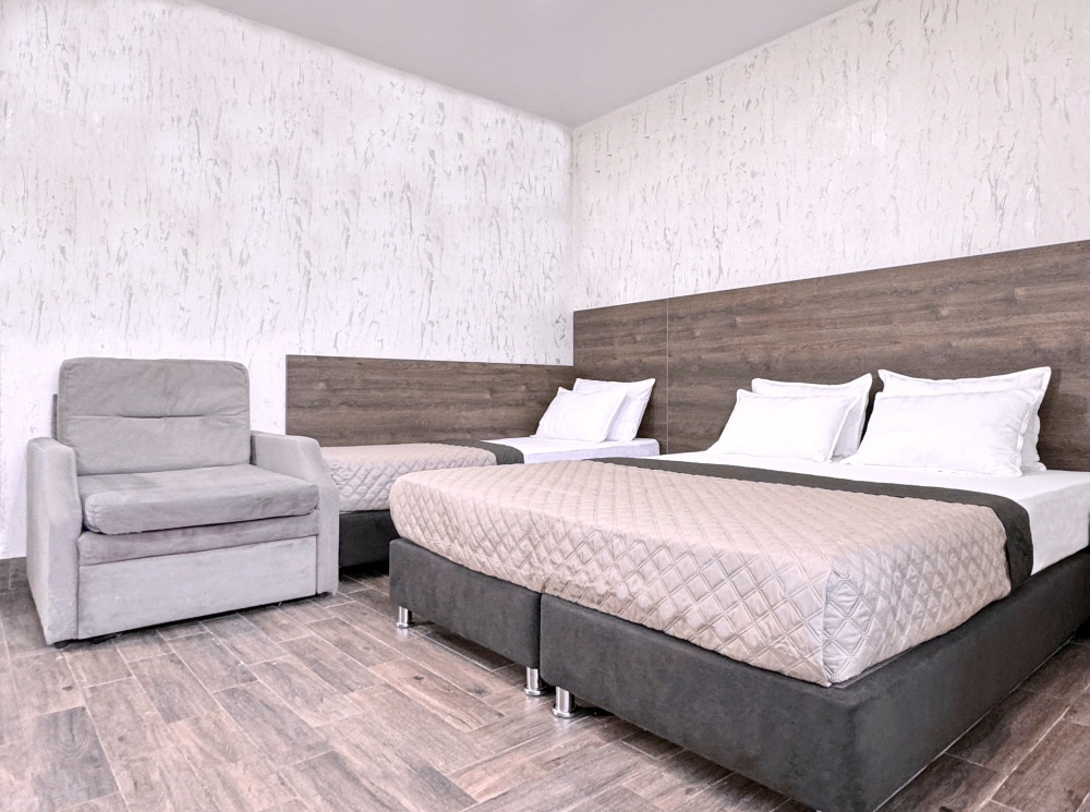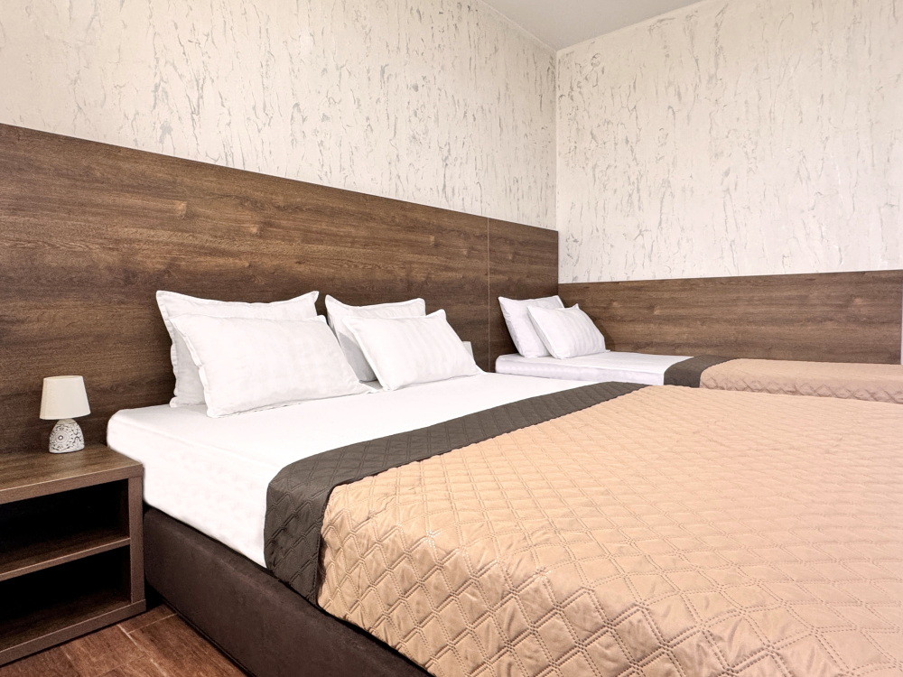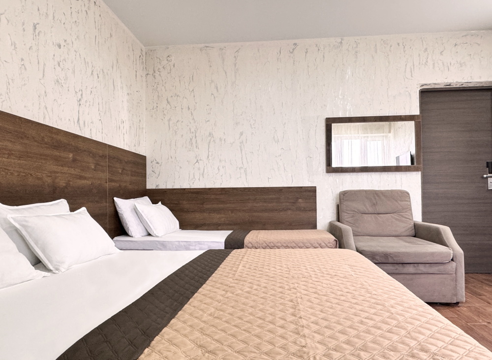 Для тех, кто ценит удобство и комфорт, мы рады предложить номер оснащенный двуспальной и односпальной кроватью и креслом-кроватью. Номер оборудован всем необходимым для комфортного проживания: шкаф для одежды, мини-холодильник, журнальный столик, телевизор и кондиционер, Wi-Fi позволит всегда оставаться на связи. Уютный балкон станет прекрасным местом для утреннего кофе или вечернего отдыха на свежем воздухе. Санузел и душ в номере.