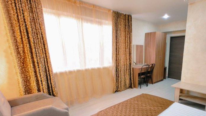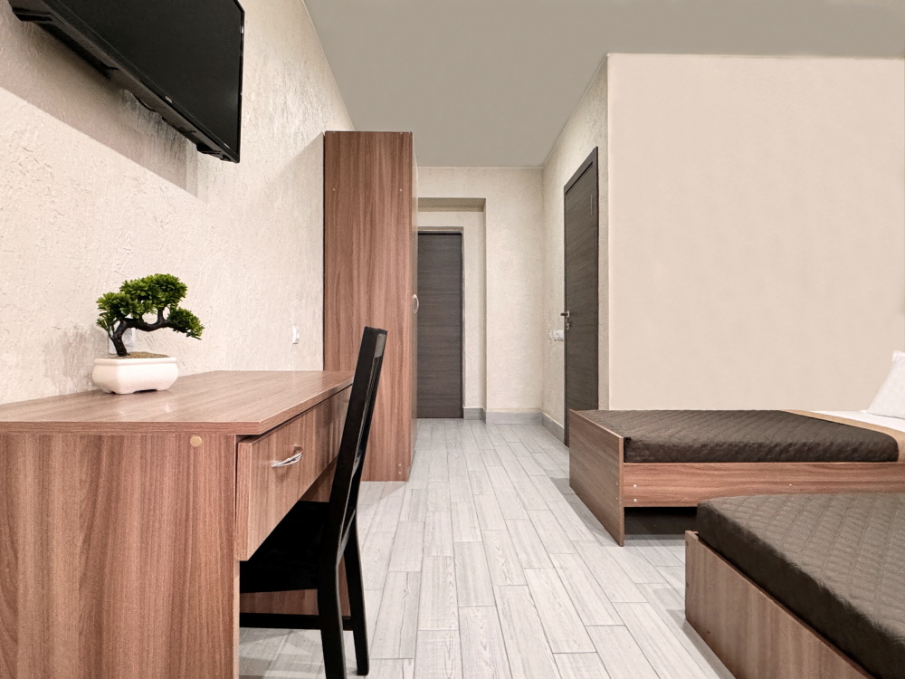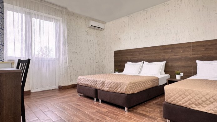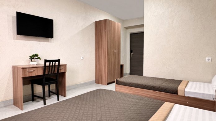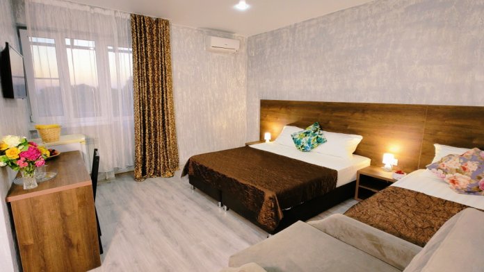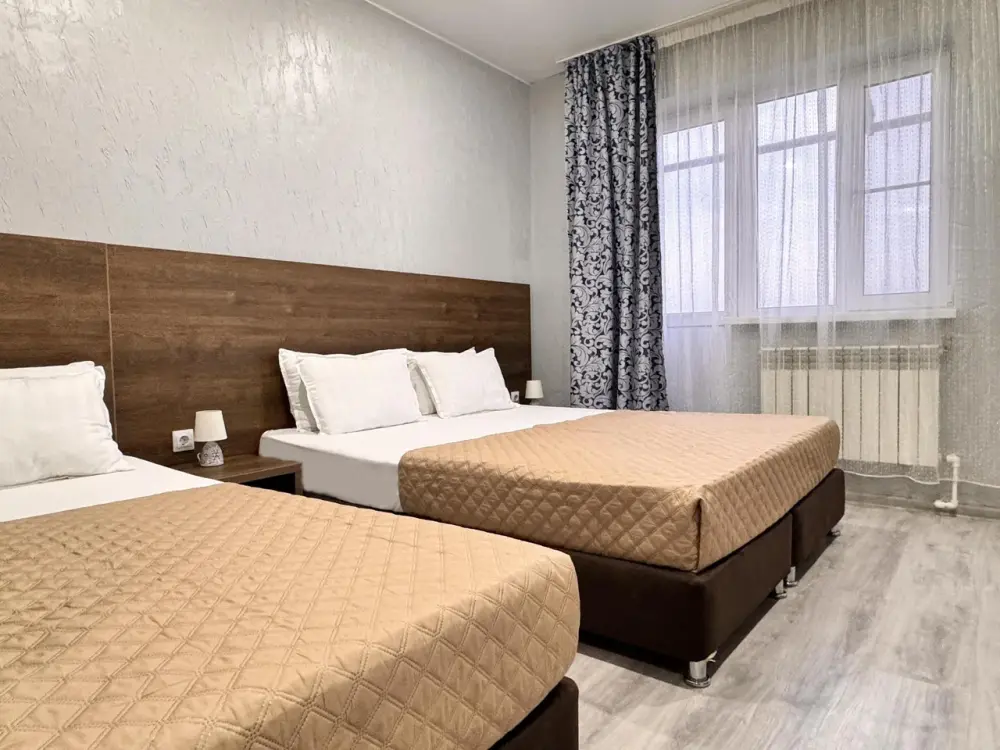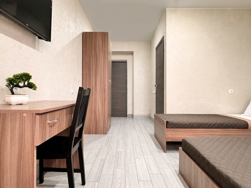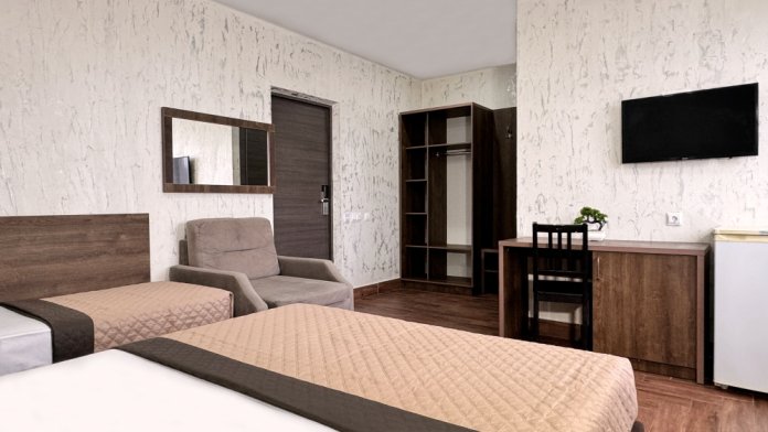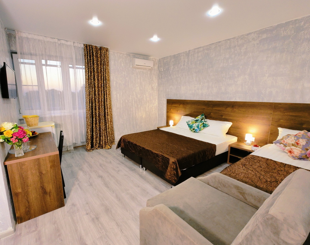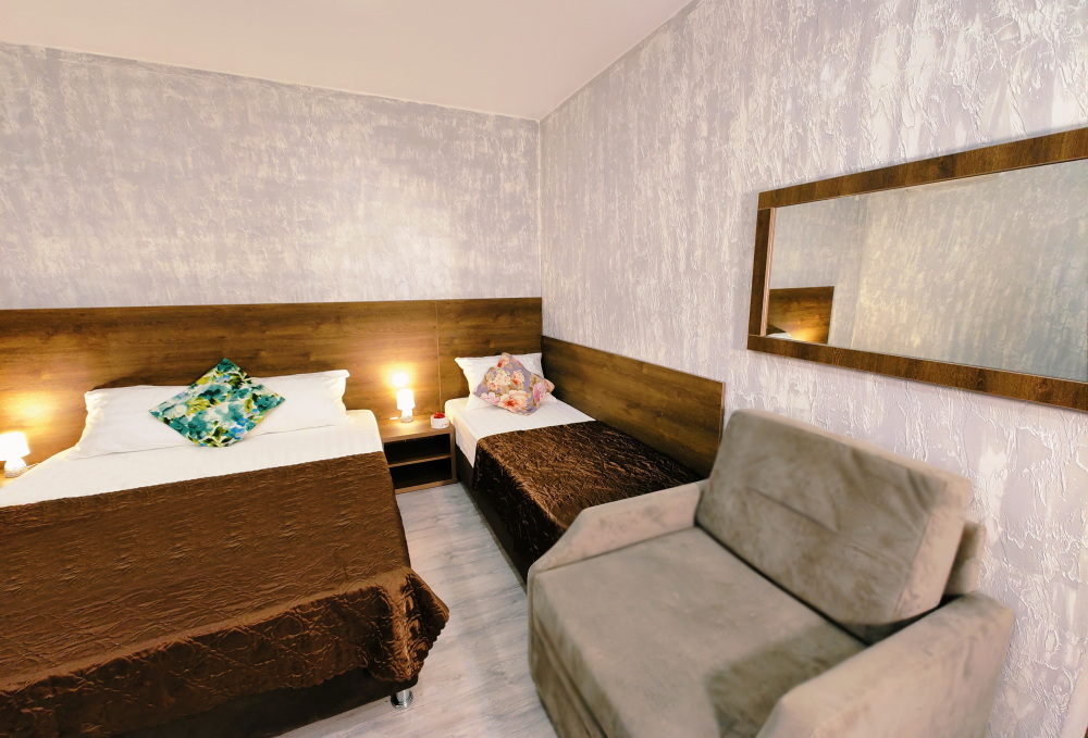 В двухкомнатном номере имеется: две двуспальные кровати и односпальный диван, шкаф для хранения вещей и вся необходимая мебель. Для вашего удобства имеется мини-холодильник, стол, телевизор. Для доступа в интернет предусмотрен Wi-Fi. Просторный балкон станет отличным местом для отдыха на свежем воздухе. В этом номере вы сможете насладиться комфортом и уютом нашего отеля. Собственная ванная комната в номере.