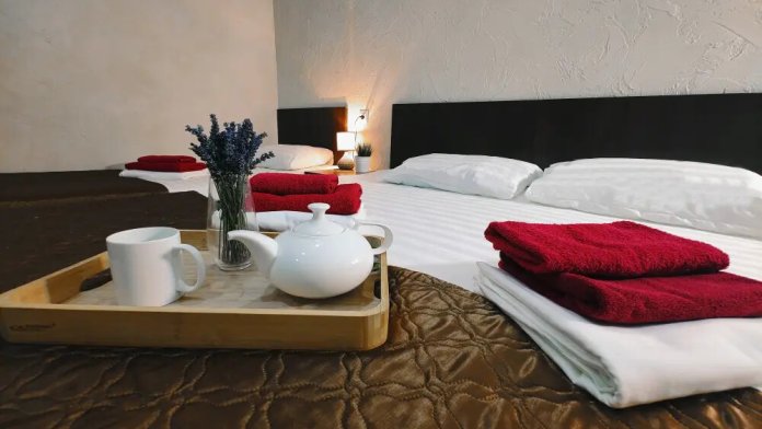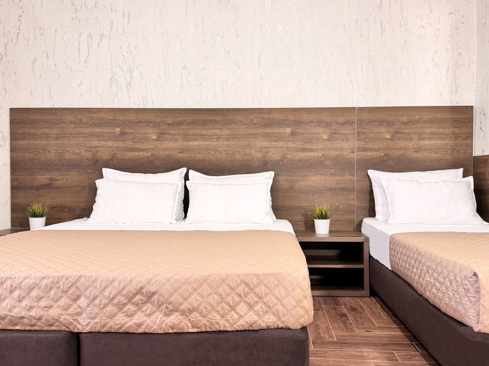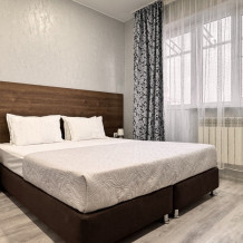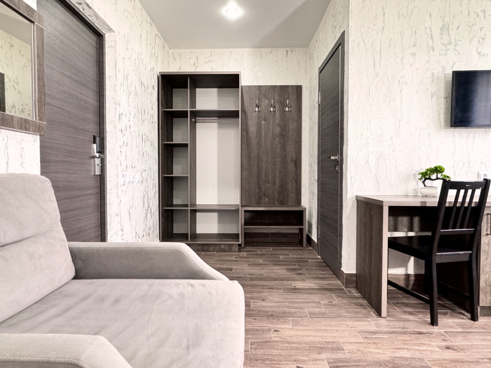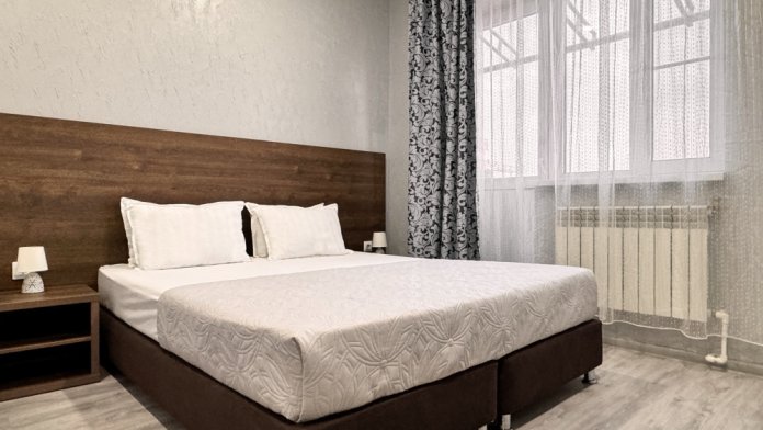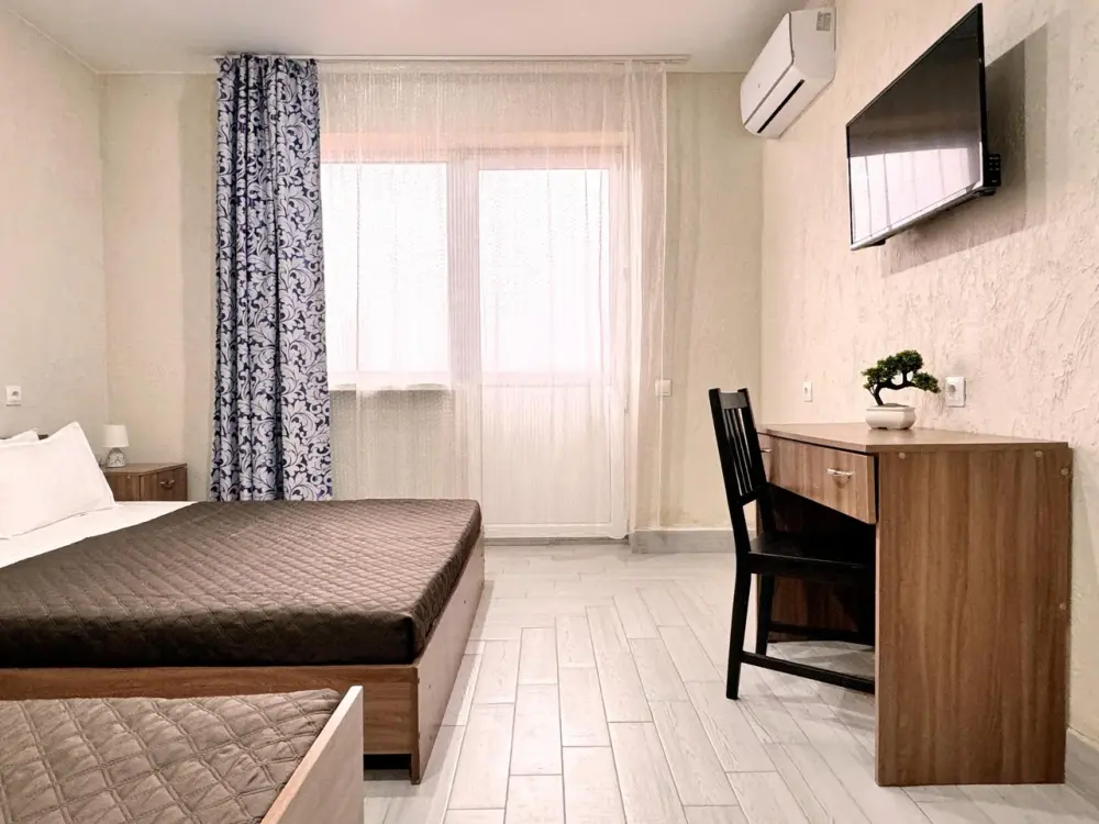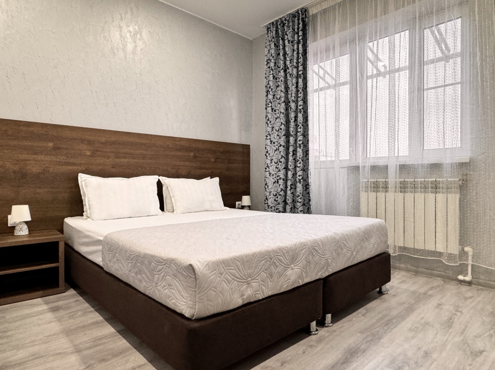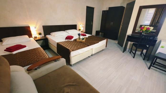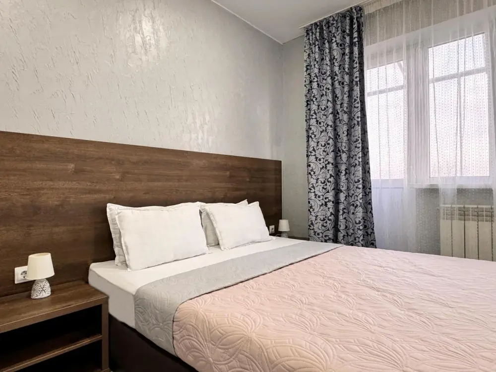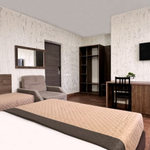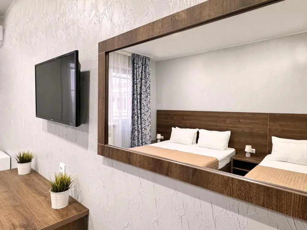 В двухкомнатном номере имеется: две двуспальные кровати и односпальный диван, шкаф для хранения вещей и вся необходимая мебель. Для вашего удобства имеется мини-холодильник, стол, телевизор. Для доступа в интернет предусмотрен Wi-Fi. Просторный балкон станет отличным местом для отдыха на свежем воздухе. В этом номере вы сможете насладиться комфортом и уютом нашего отеля. Собственная ванная комната в номере.