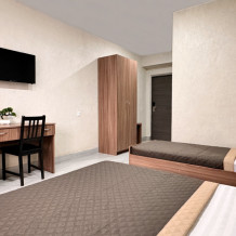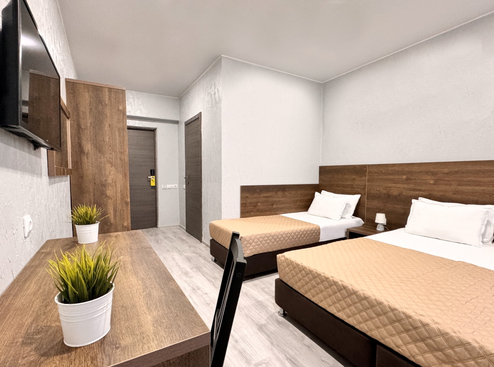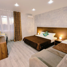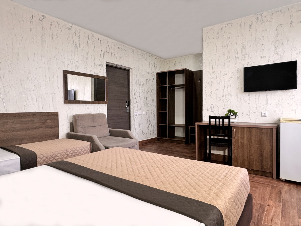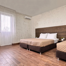 Уютный трехместный номер предлагает комфортное размещение для трех человек или семейной пары с ребенком. Номер оснащен: двуспальной и односпальной кроватью или двуспальной кроватью и креслом-кроватью, прикроватными тумбочками, телевизором, мини-холодильником и кондиционером, wi-fi, столом, стульями. Санузел с душем обеспечивает комфорт для гостей. Небольшое окно. Номер без балкона.