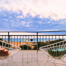 В красивом и просторном однокомнатном номере есть все для комфортного отдыха: двуспальная кровать, односпальная кровать, креслом-кроватью, прикроватные тумбочки, стол, телевизор, мини-холодильник, Wi-Fi. Санузел и душ в номере. Номер с индивидуальным балконом и сказочным видом на море.