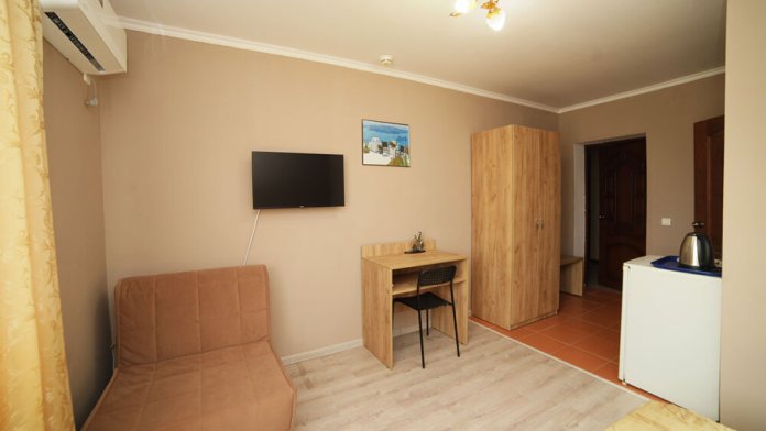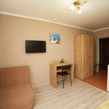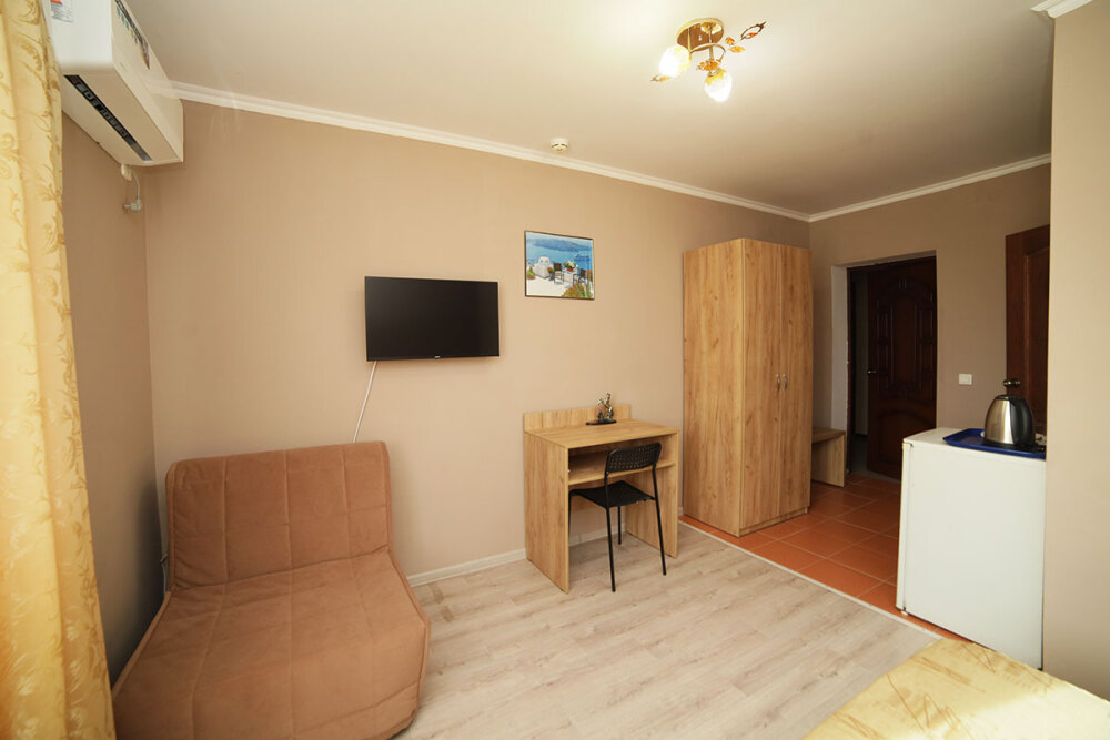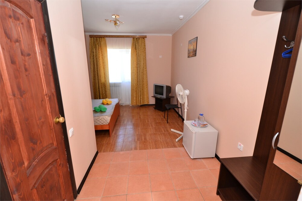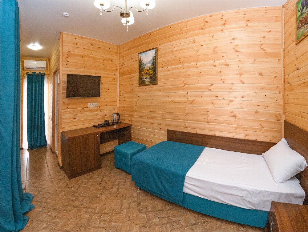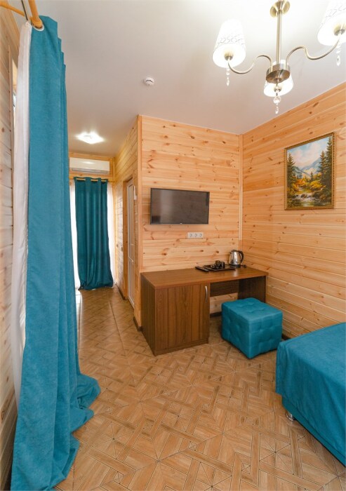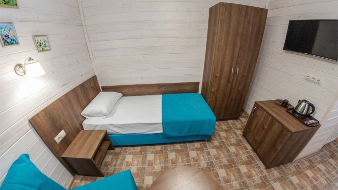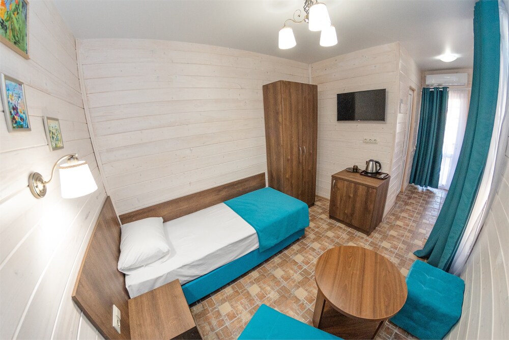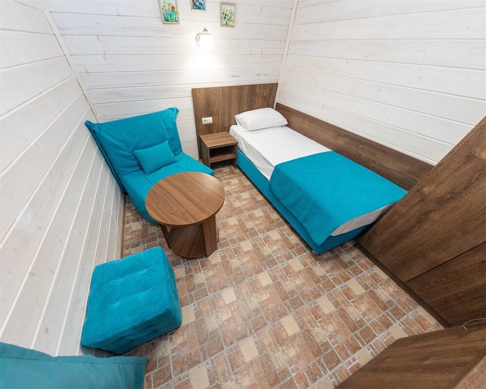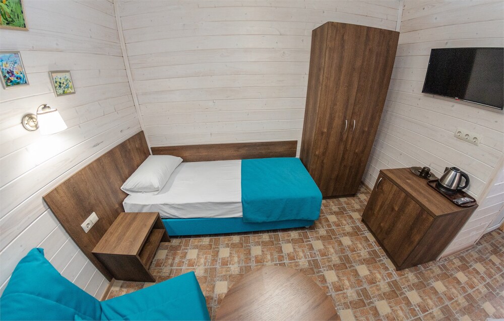 В номере: 1 односпальная кровать, прикроватная тумба, журнальный столик, мягкий пуфик, раскладное кресло-кровать, которое может использоваться в качестве дополнительного спального места для одного гостя до 14 лет, вешалка для одежды и тумба для обуви, жк-телевизор с плоским экраном, холодильник, электрический чайник, сплит-система для создания приятного микроклимата, санузел с душевой кабиной, фен.