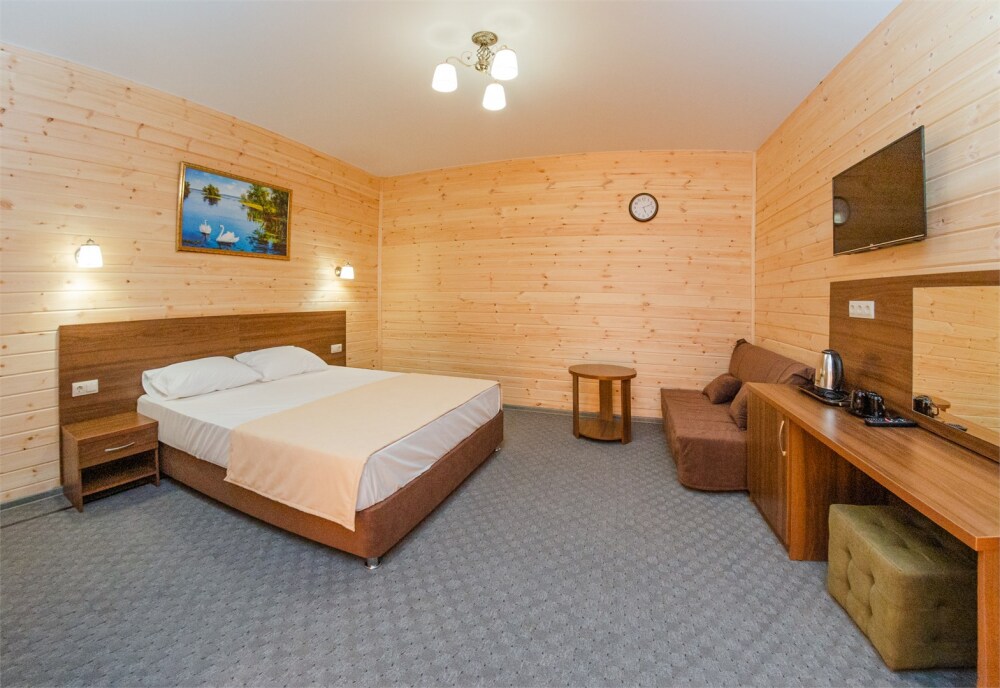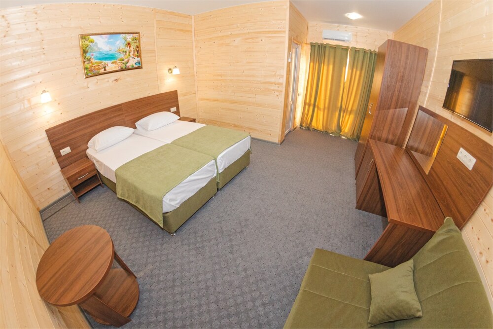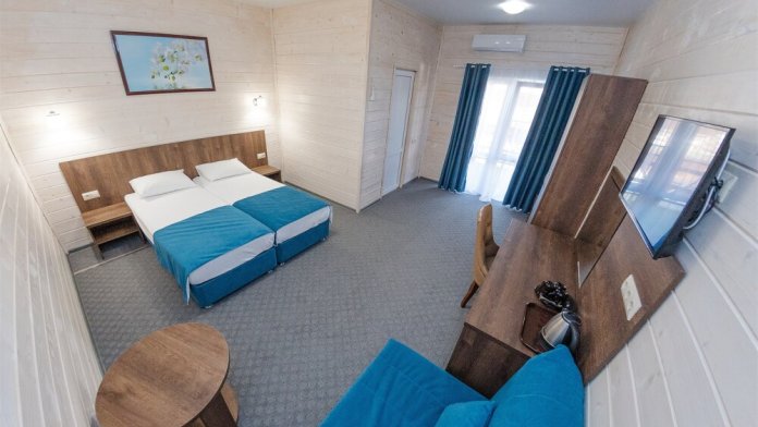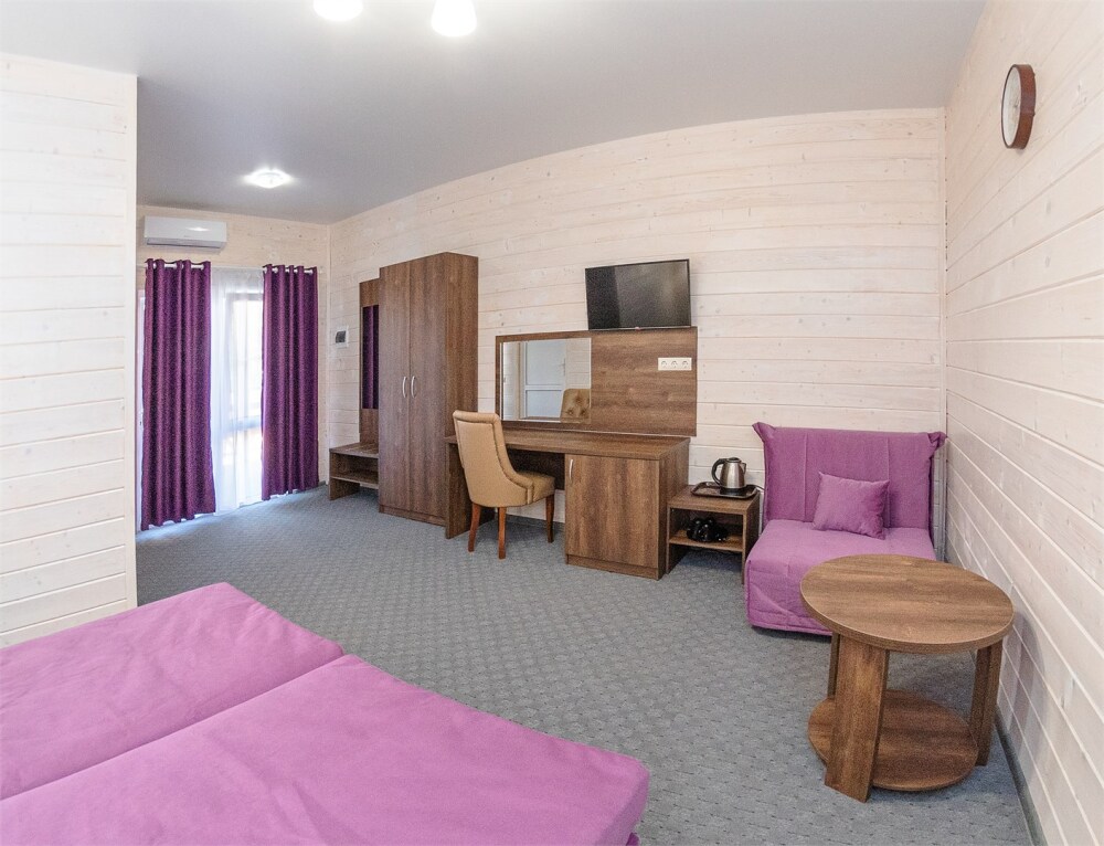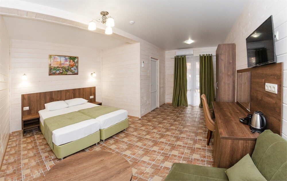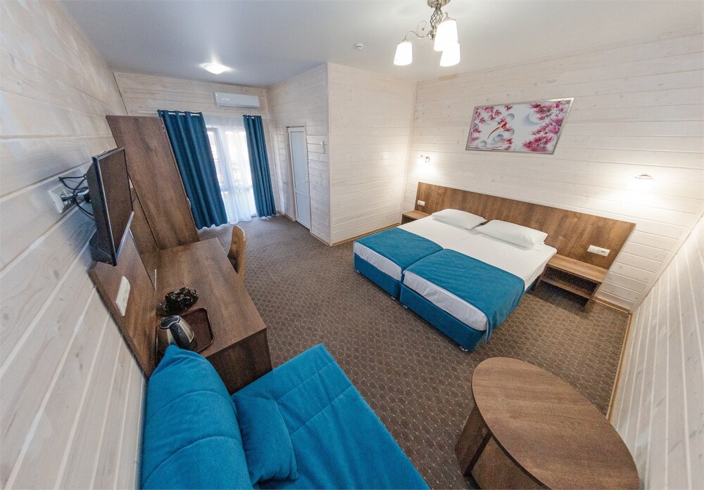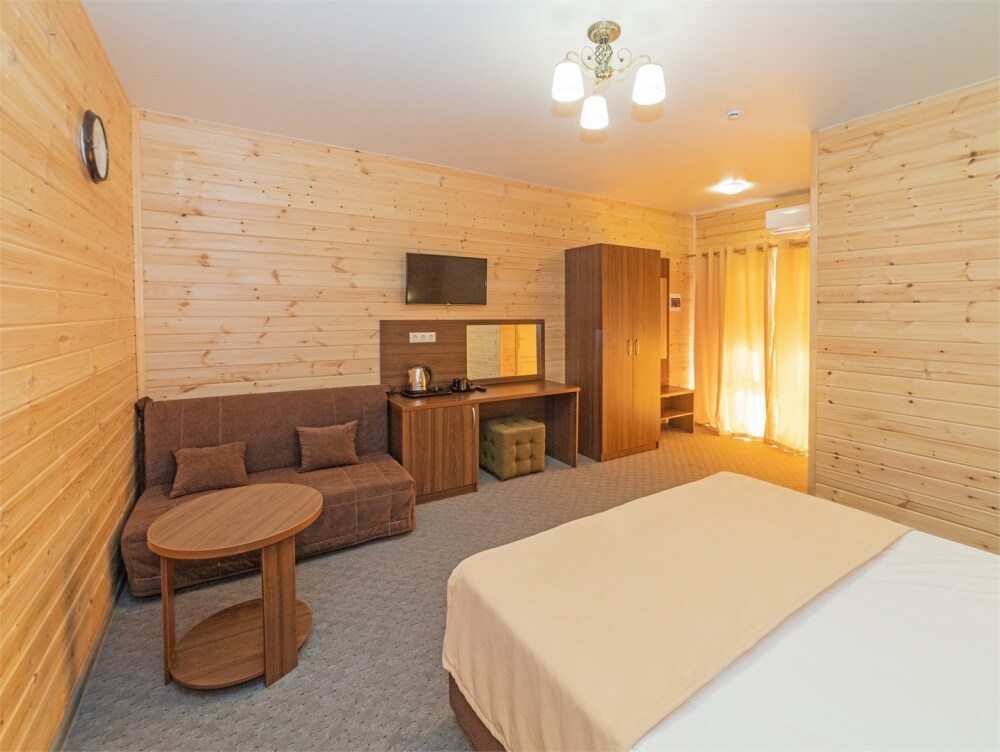 В номере: 1 двуспальная кровать или 2 односпальные кровати (спрингбоксы), 2 прикроватные тумбы, журнальный столик, мягкий пуфик, раскладной диван или раскладное кресло-кровать, вешалка для одежды и тумба для обуви, жк-телевизор с плоским экраном, холодильник, электрический чайник, сплит-система для создания приятного микроклимата, санузел с душевой кабиной, фен.