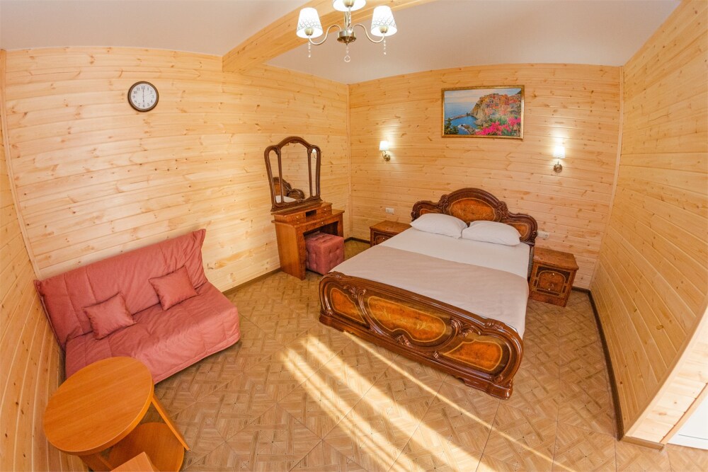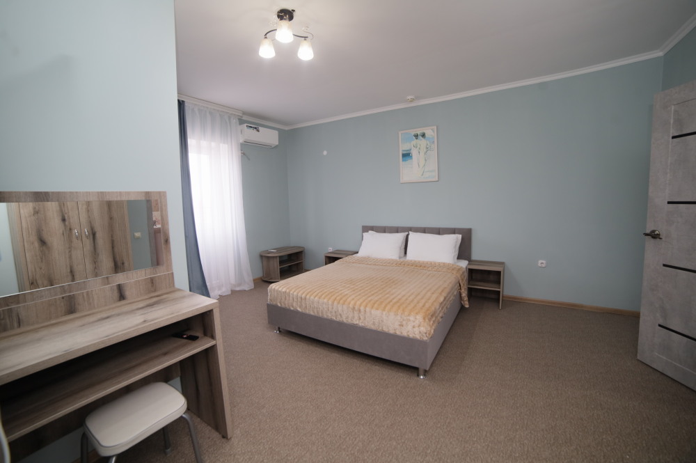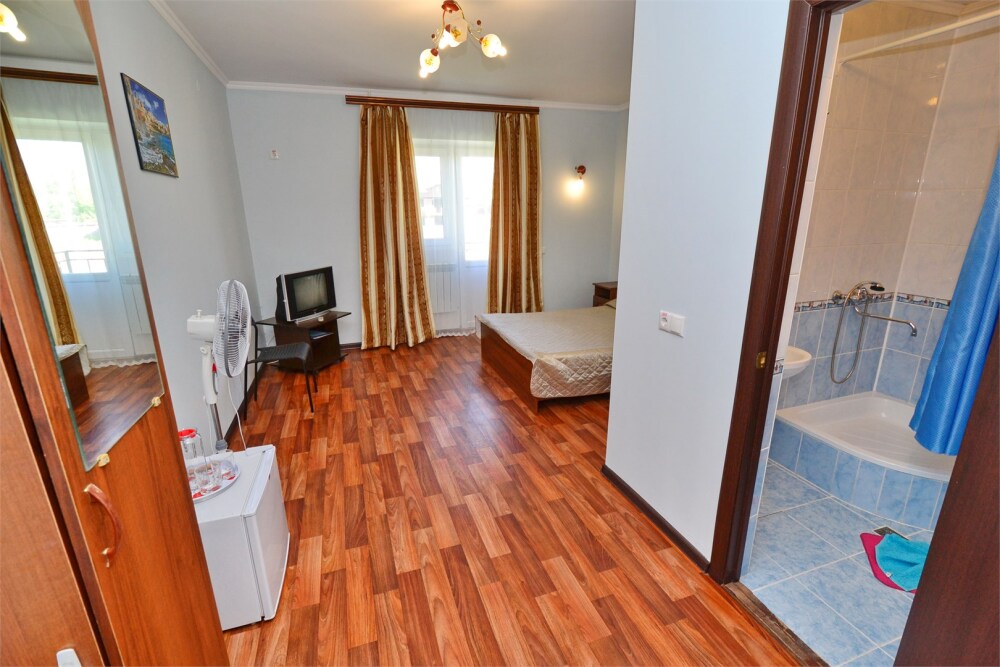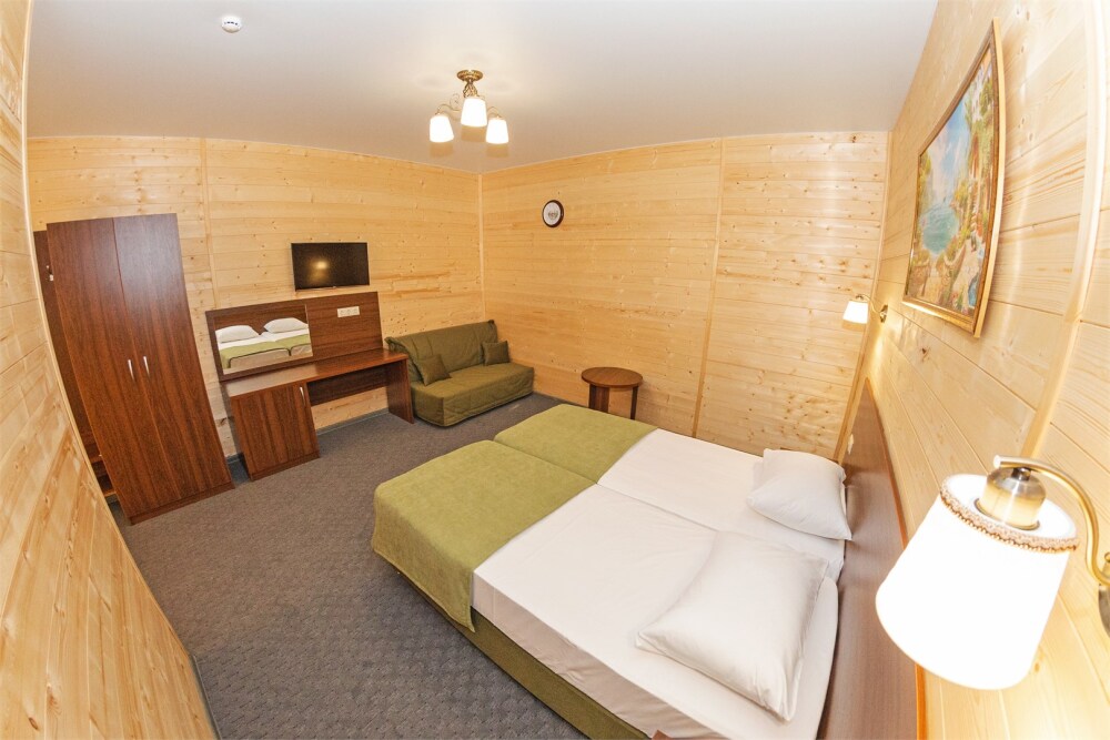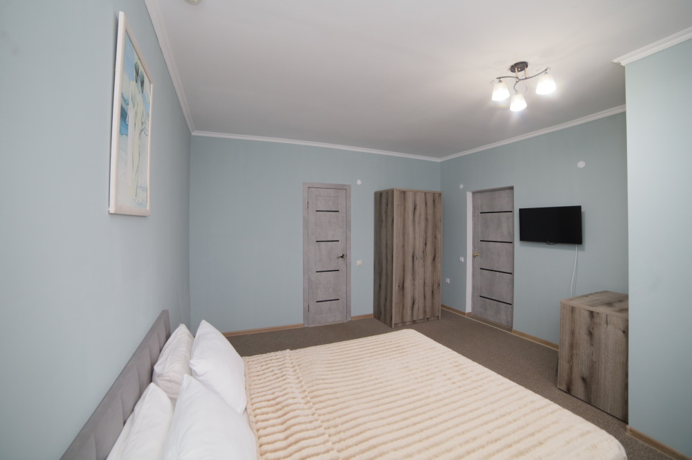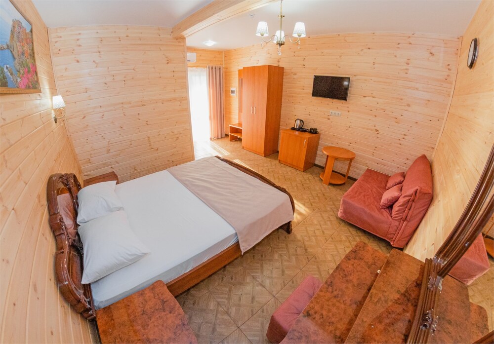 В номере: 1 двуспальная кровать или 2 односпальные кровати (спрингбоксы), 2 прикроватные тумбы, журнальный столик, мягкий пуфик, раскладной диван или раскладное кресло-кровать, вешалка для одежды и тумба для обуви, жк-телевизор с плоским экраном, холодильник, электрический чайник, сплит-система для создания приятного микроклимата, санузел с душевой кабиной, фен.