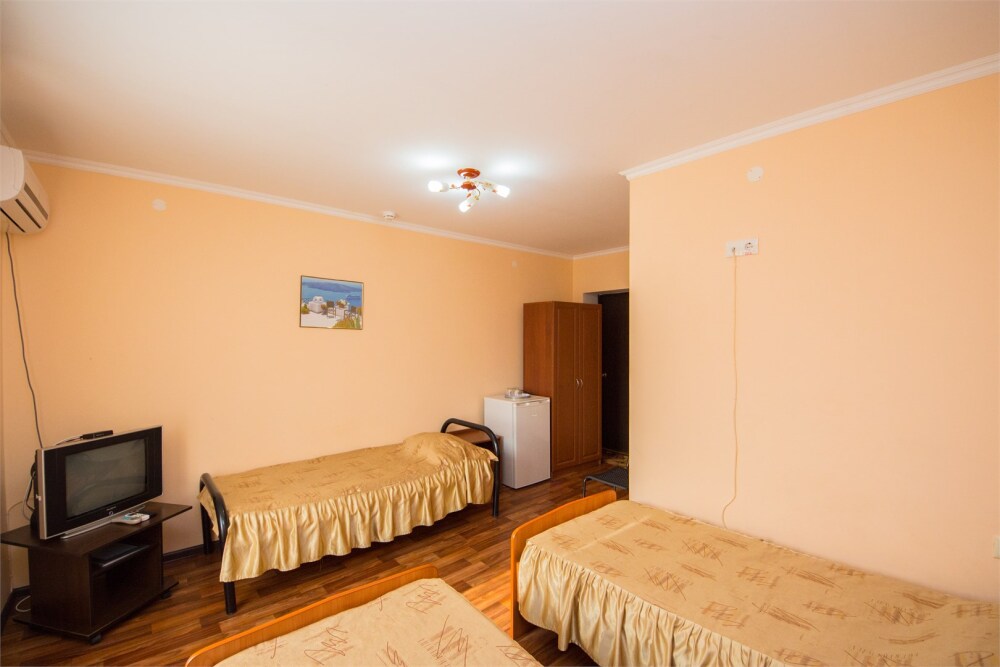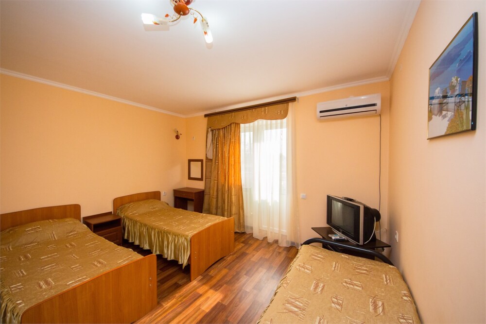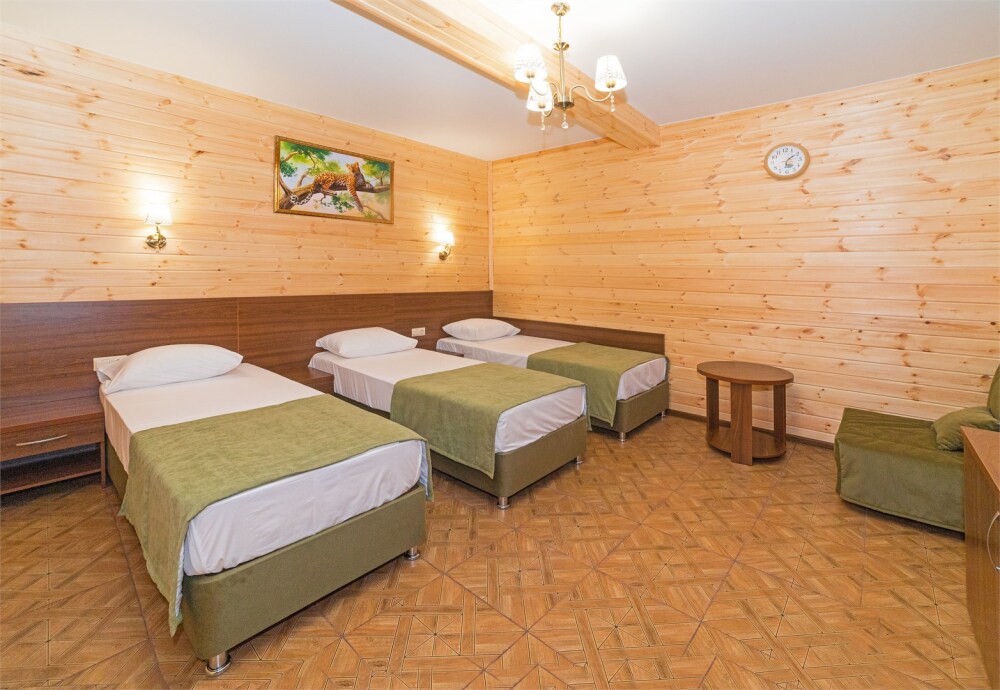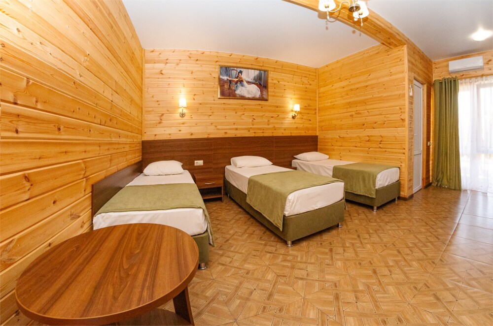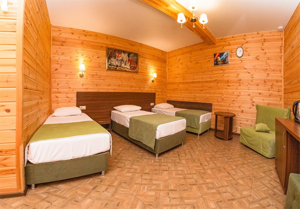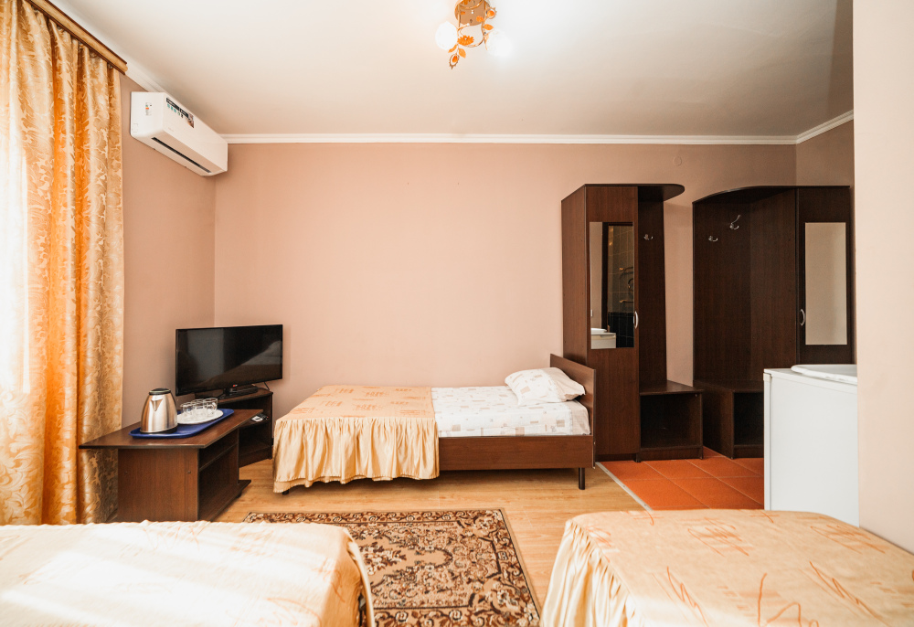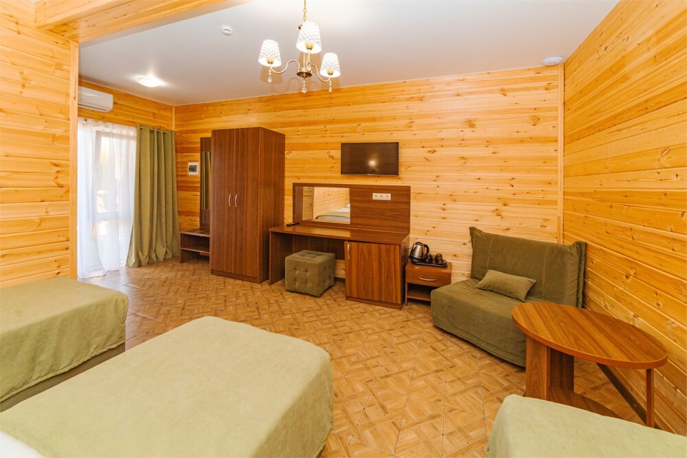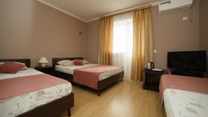 В номере: 3 односпальные кровати (спрингбоксы), прикроватные тумбы, журнальный столик, мягкий пуфик, раскладное кресло-кровать, вешалка для одежды и тумба для обуви, жк-телевизор с плоским экраном, холодильник, электрический чайник, сплит-система для создания приятного микроклимата, санузел с душевой кабиной, фен.