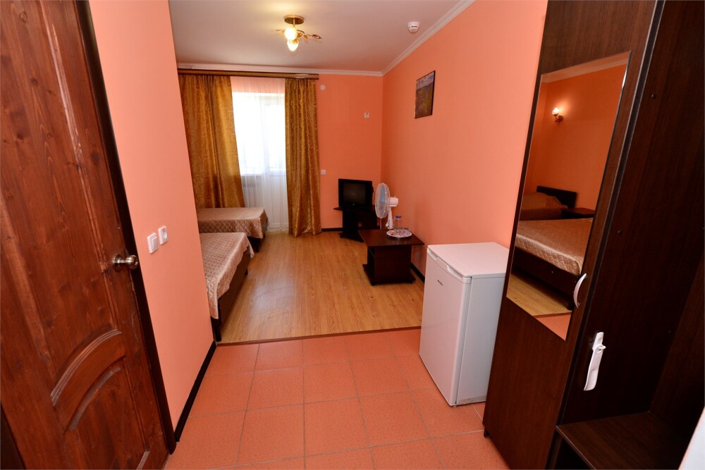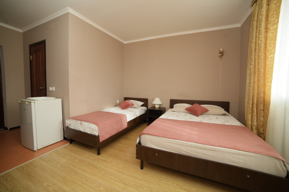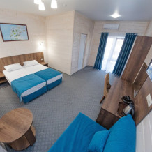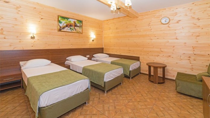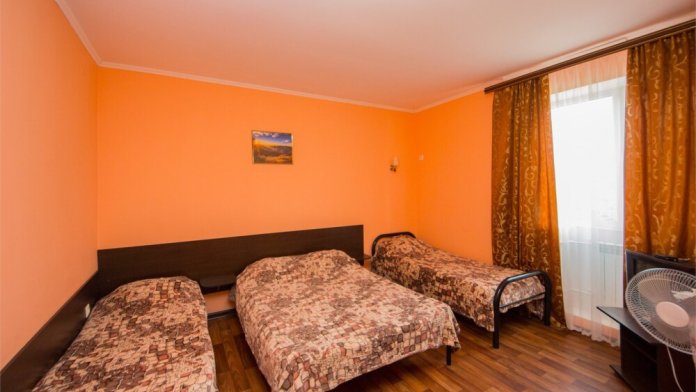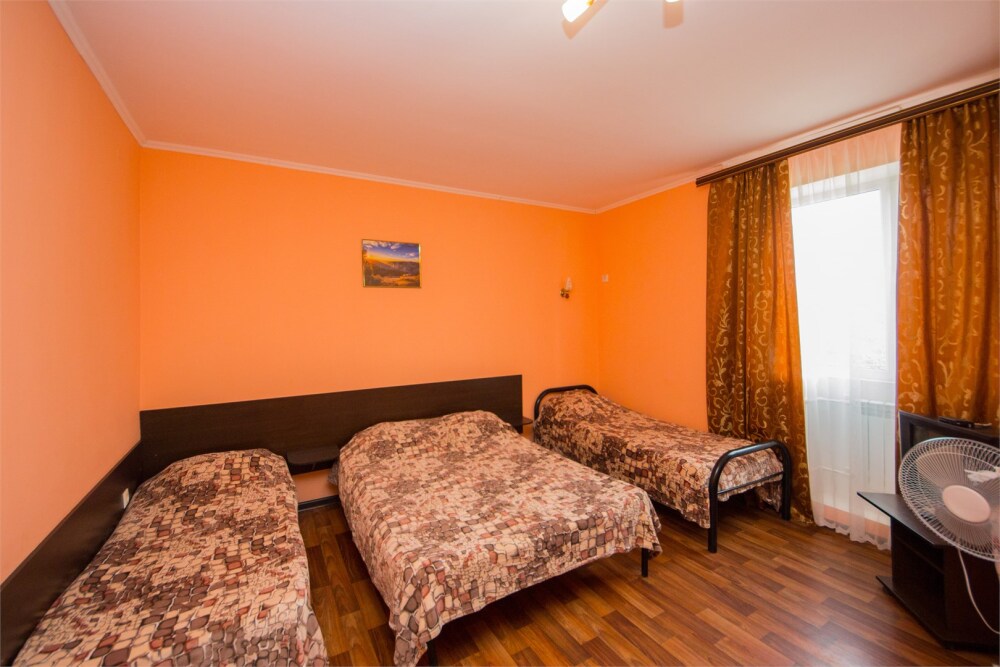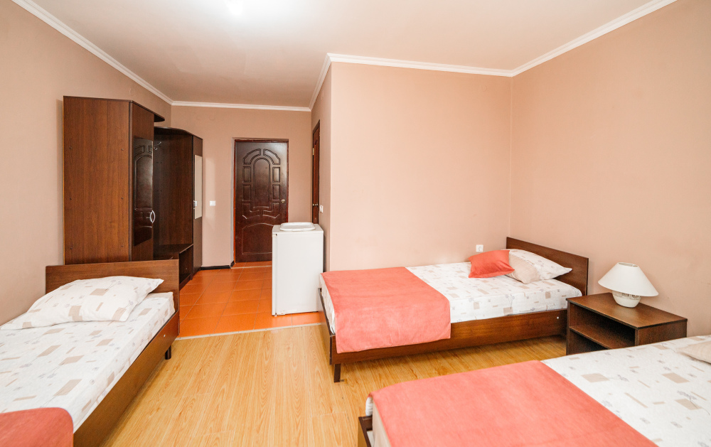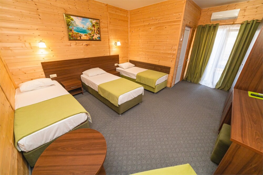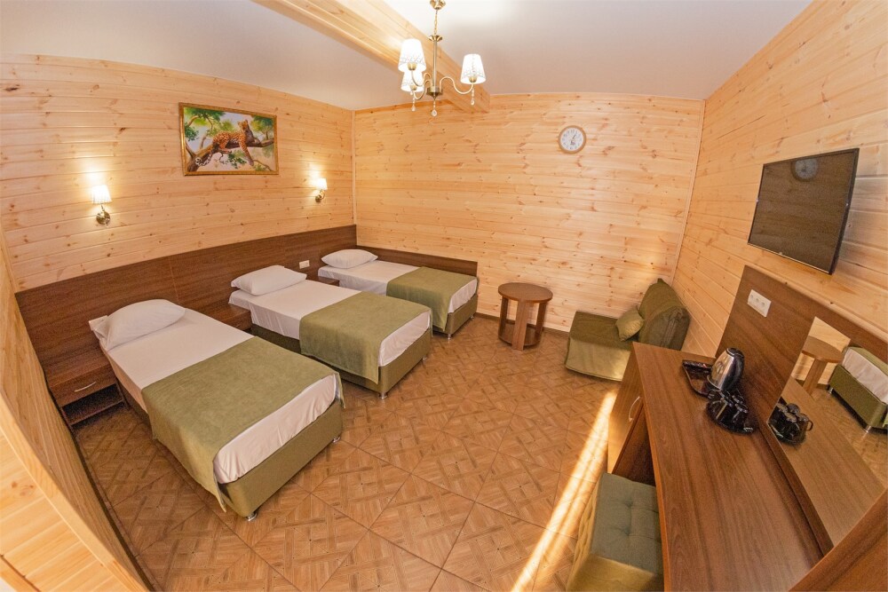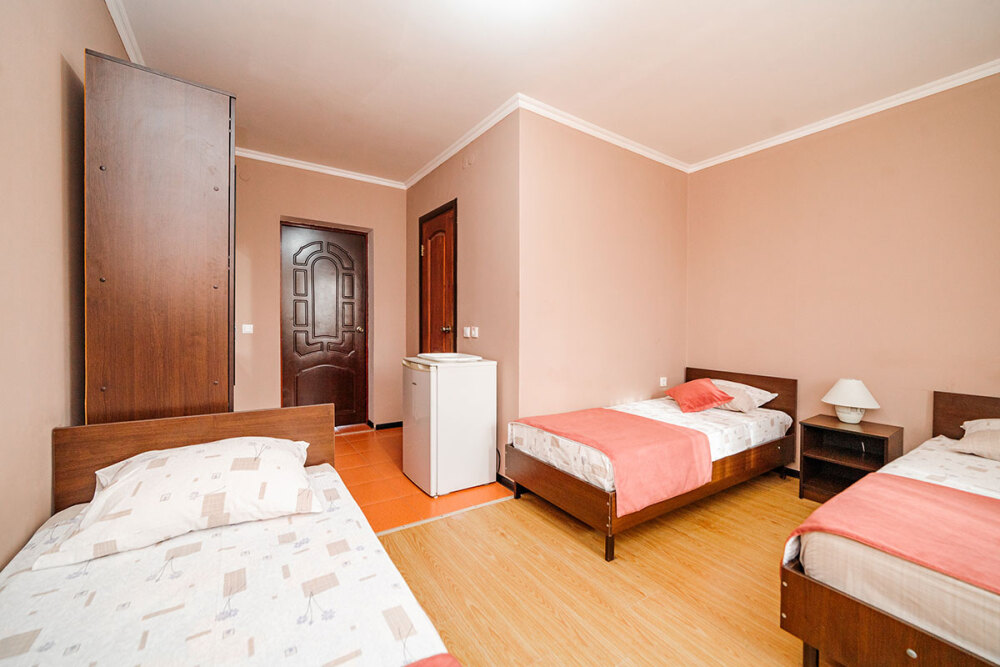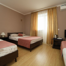 В номере: 3 односпальные кровати (спрингбоксы), прикроватные тумбы, журнальный столик, мягкий пуфик, раскладное кресло-кровать, вешалка для одежды и тумба для обуви, жк-телевизор с плоским экраном, холодильник, электрический чайник, сплит-система для создания приятного микроклимата, санузел с душевой кабиной, фен.