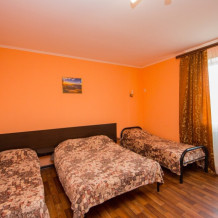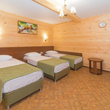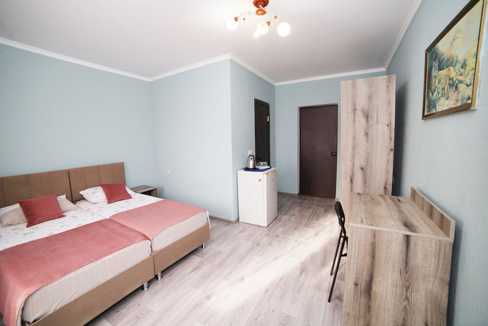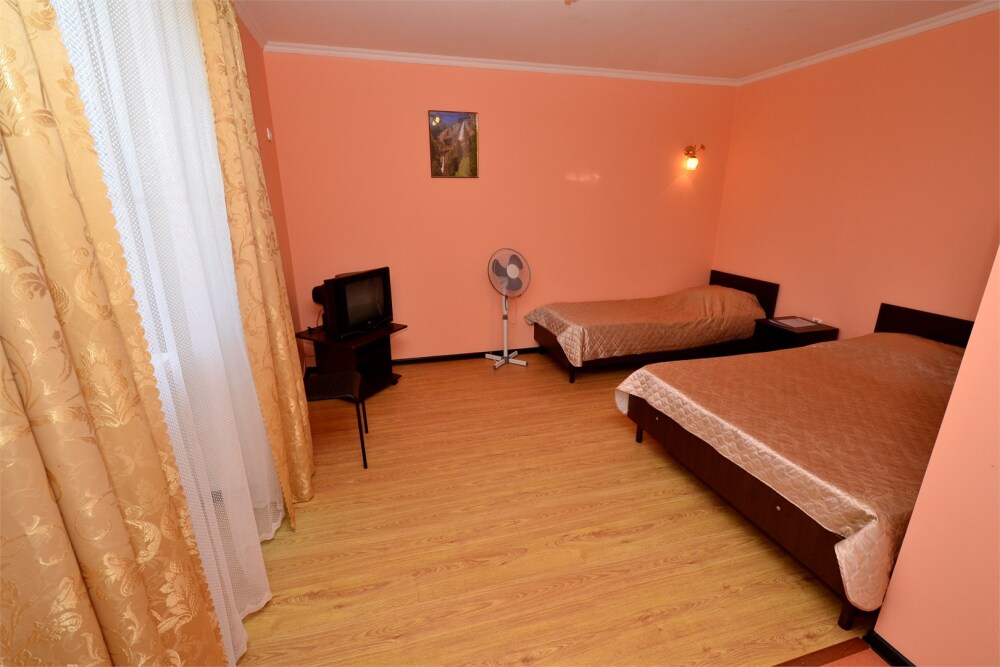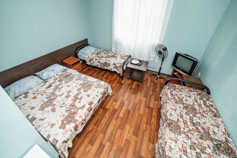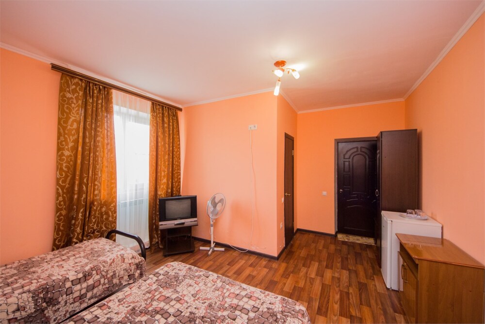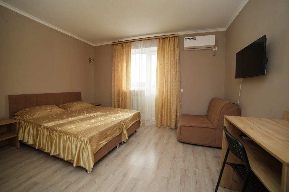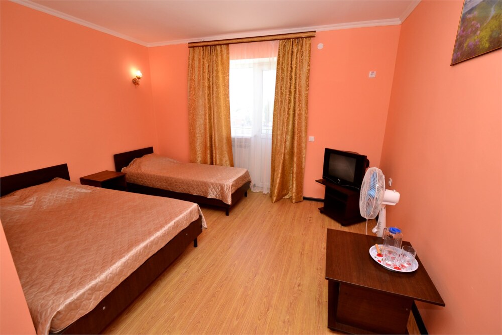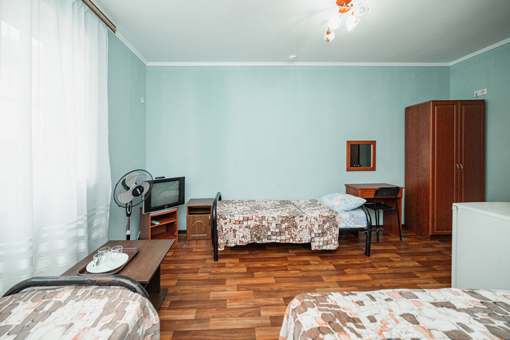 В номере: 3 односпальные кровати (спрингбоксы), прикроватные тумбы, журнальный столик, мягкий пуфик, раскладное кресло-кровать, вешалка для одежды и тумба для обуви, жк-телевизор с плоским экраном, холодильник, электрический чайник, сплит-система для создания приятного микроклимата, санузел с душевой кабиной, фен.