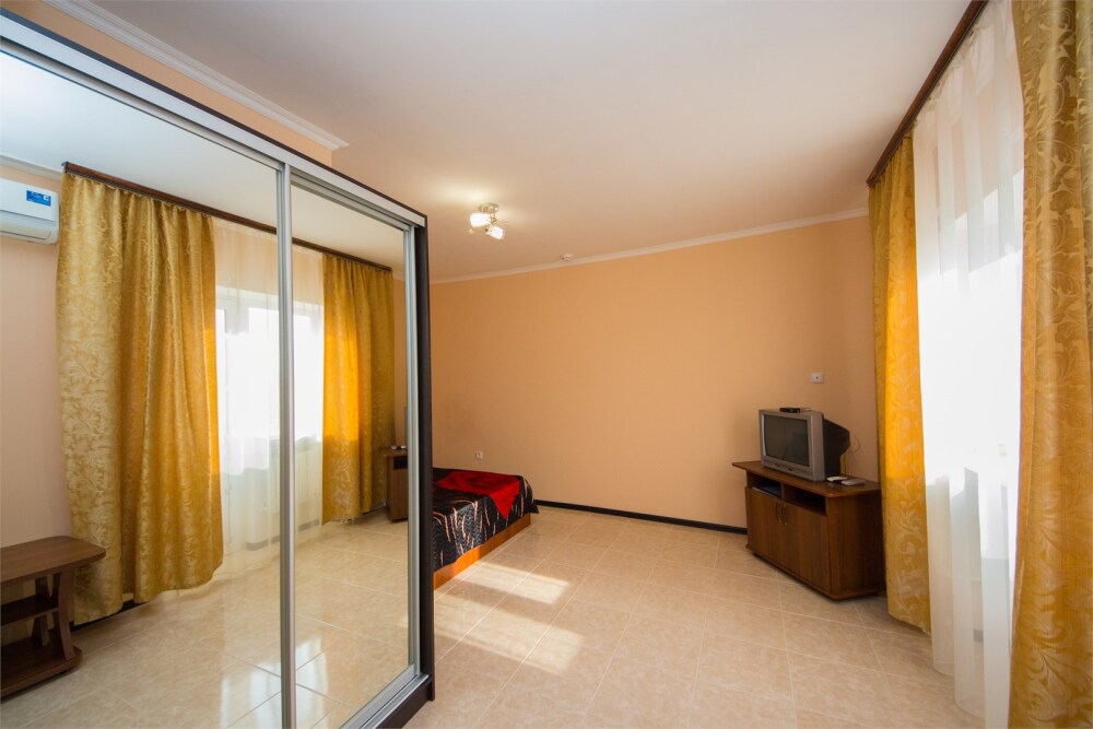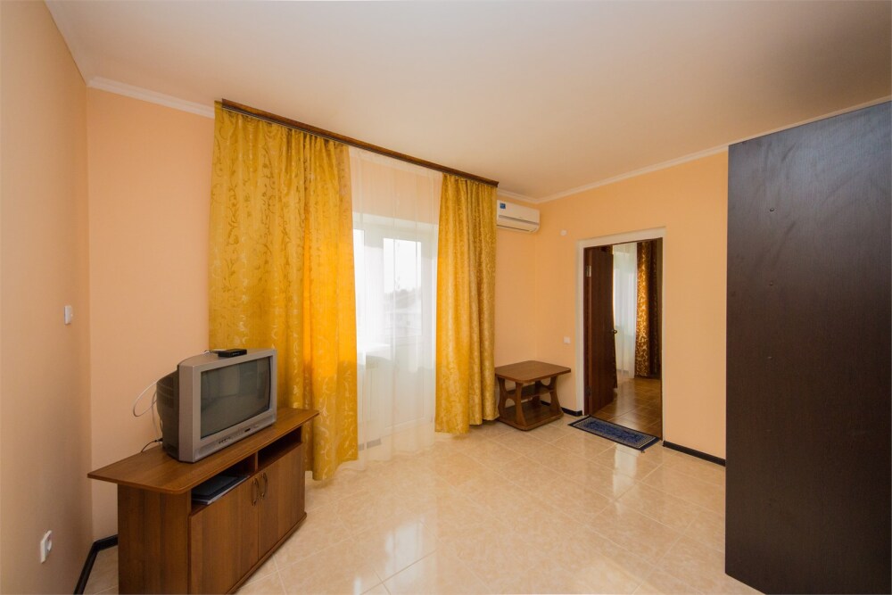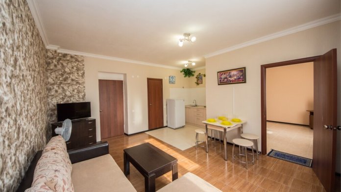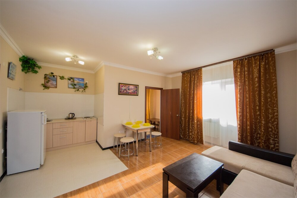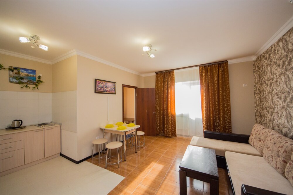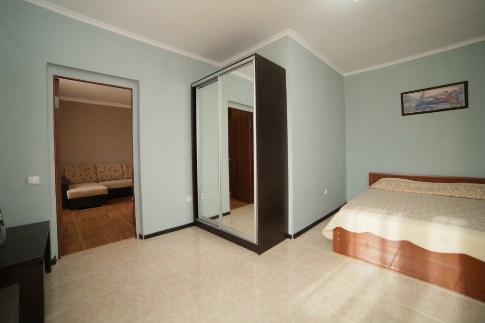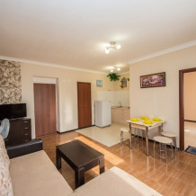 В номере 2 комнаты: гостиная, совмещённая с мини-кухней, и спальня с двуспальной кроватью. В гостиную ведёт просторная прихожая с вешалкой для одежды и гладильной доской. Для удобства гостей в номере 2 кондиционера, 2 телевизора и 2 балкона. В санузле душевая кабина, биде и стиральная машина-автомат. Мини-кухня укомплектована набором посуды для приготовления и приёма пищи.
