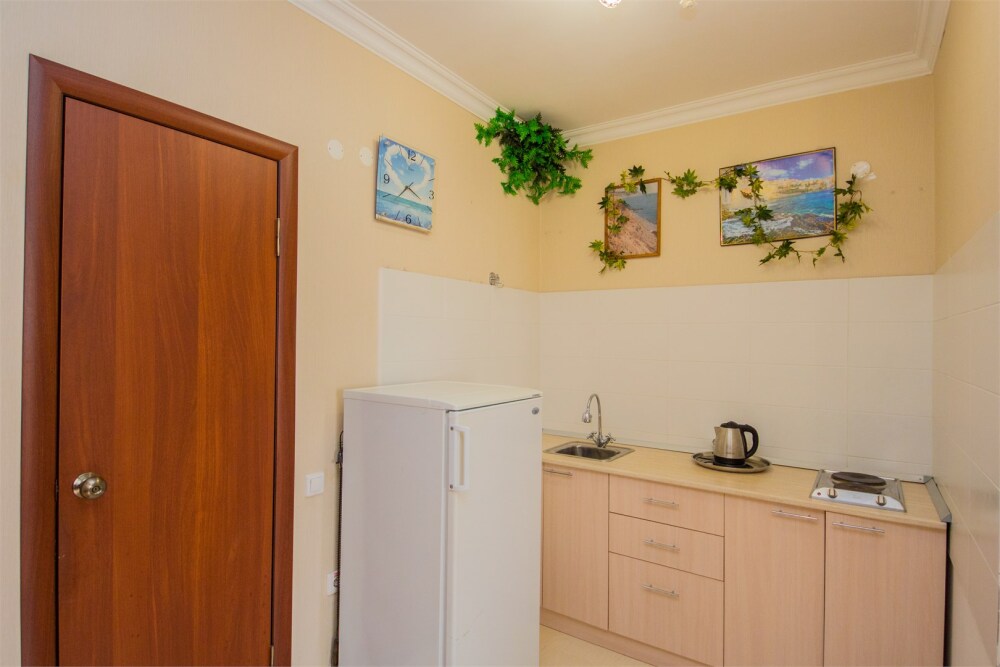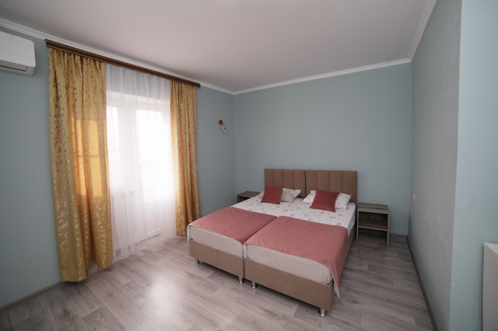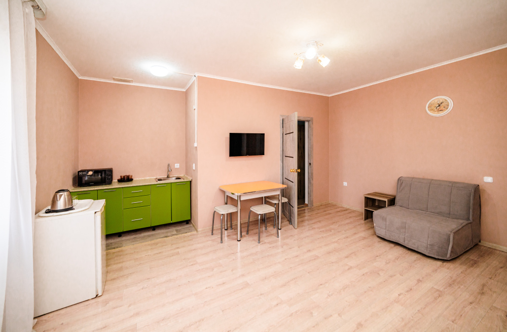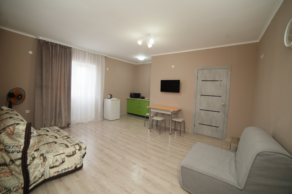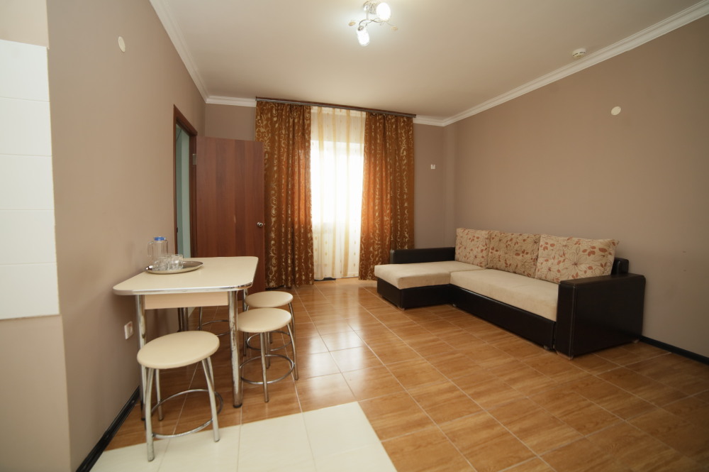 В номере 2 комнаты: гостиная, совмещённая с мини-кухней, и спальня с двуспальной кроватью. В гостиную ведёт просторная прихожая с вешалкой для одежды и гладильной доской. Для удобства гостей в номере 2 кондиционера, 2 телевизора и 2 балкона. В санузле душевая кабина, биде и стиральная машина-автомат. Мини-кухня укомплектована набором посуды для приготовления и приёма пищи.