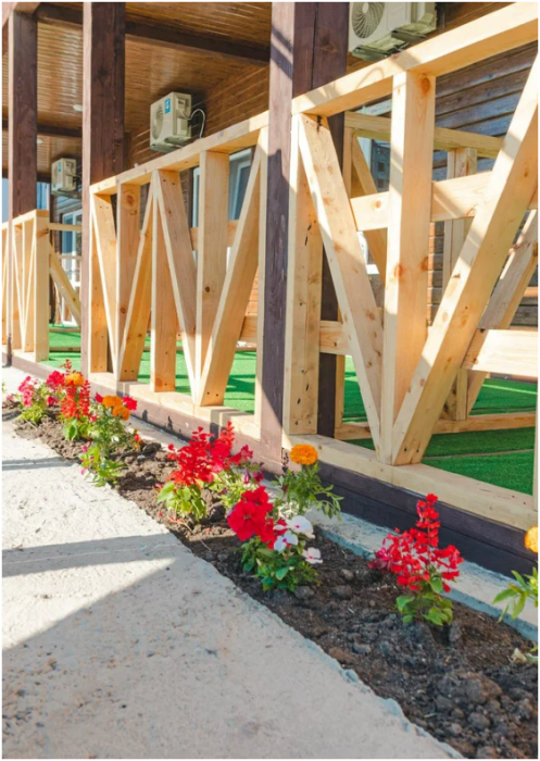 Все номера имеют выход на террасу, застеленную ковролином. На террасах для удобства наших гостей установлена пластиковая мебель для отдыха и сушилки для белья.