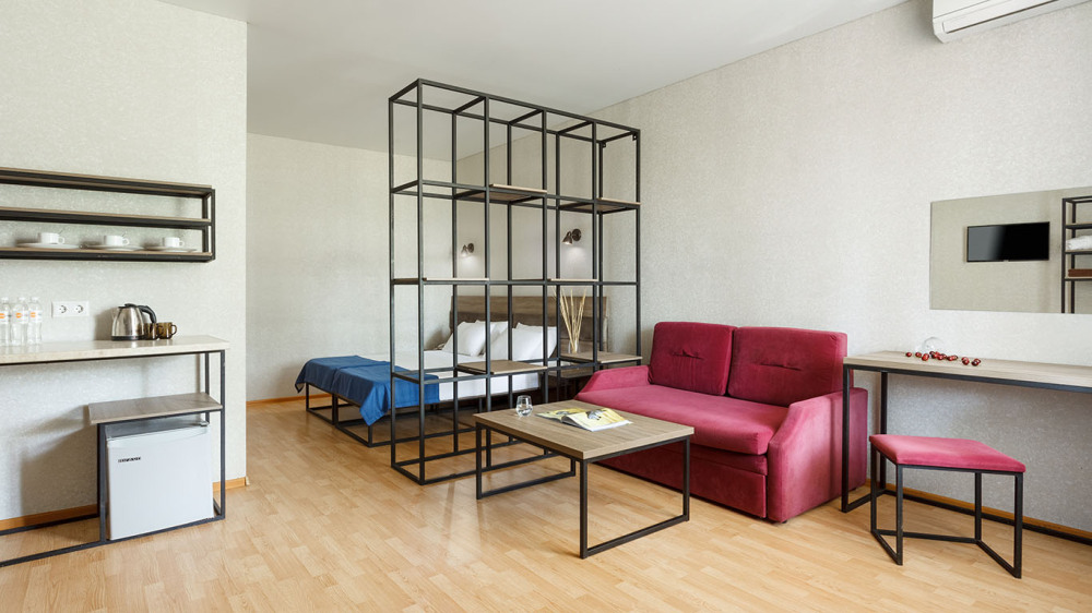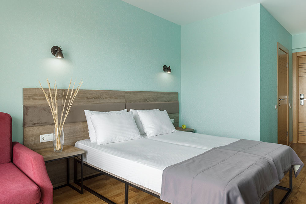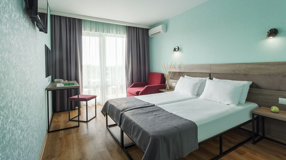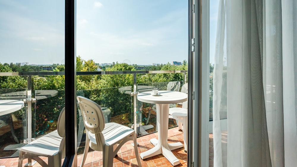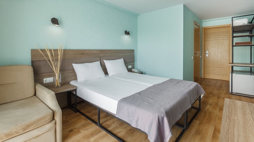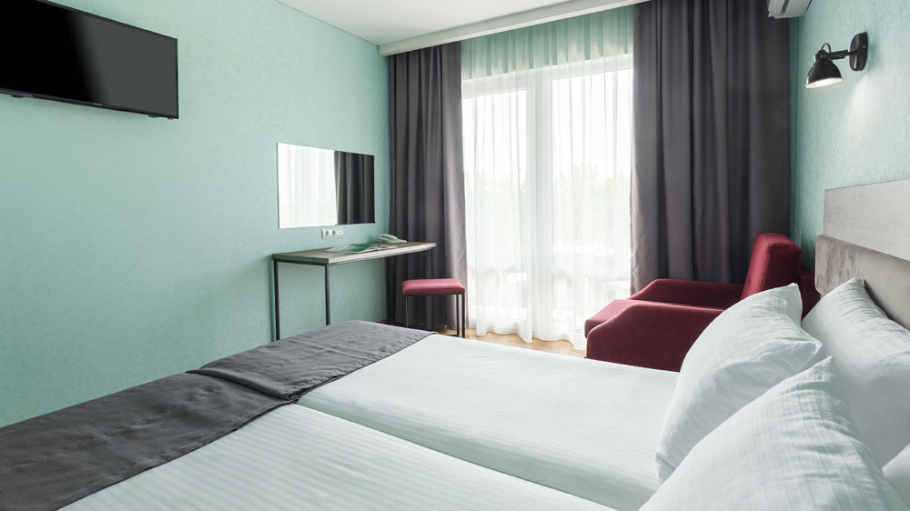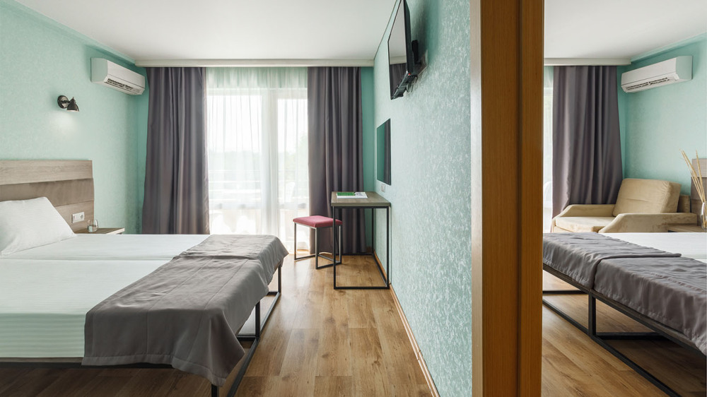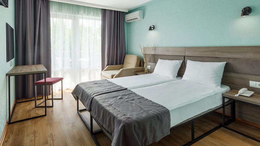 В номере: две раздельные или одна двуспальная кровать (бокс-спринг), ТВ, холодильник, эл.чайник, кондиционер (сплит-система), телефон, сейф, балкон с летней мебелью и сушилкой для белья.