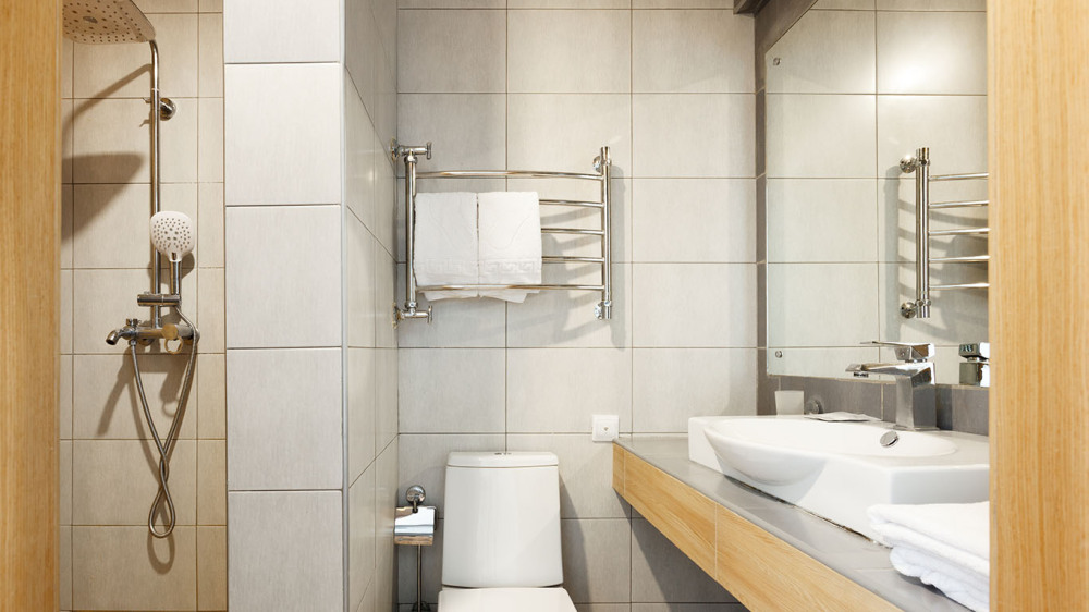 В ванной комнате: душ, раковина, унитаз, зеркало, фен, банные принадлежности и гостиничная парфюмерия.