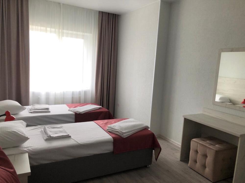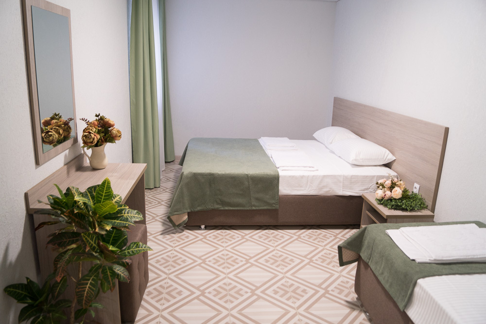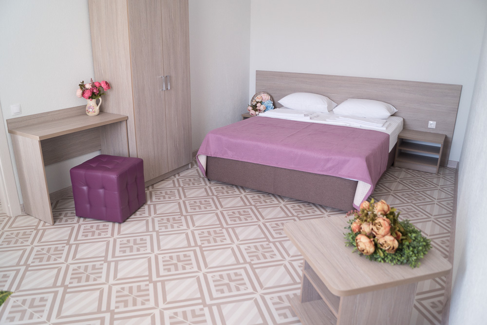 3 номера СТАНДАРТЫЕ. (Находятся на 1-3 этажах) Номера 22м. кв. (Прихожая, с вешалкой и подчемоданником, большая двуспальная кровать, кресло трансформер(90х200), шкаф, туалетный столик с пуфом и зеркалом, прикроватные тумбочки. Холодильник, чайник, посуда (тарелки, стаканы, кружки, ложки, вилки, ножи, разделочная доска. Сплит система(кондиционер), Совмещенный с/у с душевой. Номера без балконов.
