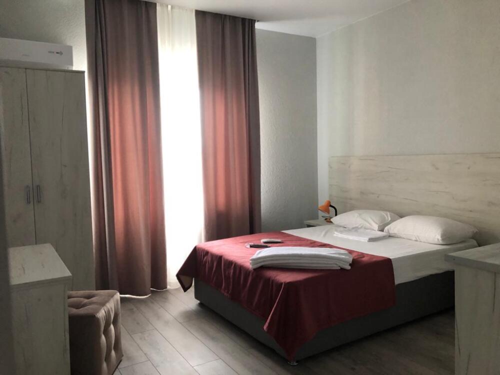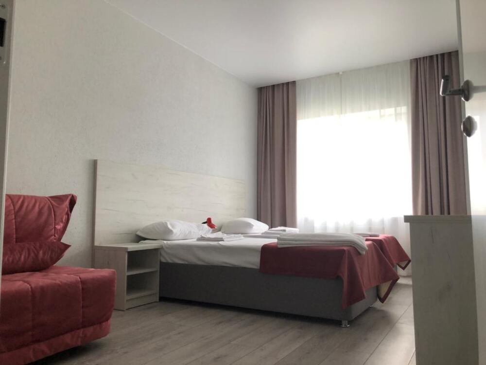 СТУДИО. (Находятся на 1-3 этажах). Номера 22 м. кв. (Прихожая с вешалкой и подчемоданником, комната с кухней, холодильник, чайник, столик со стульями и пуфом, шкаф, прикроватные тумбочки. Дополнительная раскладная кровать по требованию. Сплит система(кондиционер). В номерах большие двуспальные кровати(180х200). Совмещенный с/у с душевой. 3 номера СТУДИО с балконами