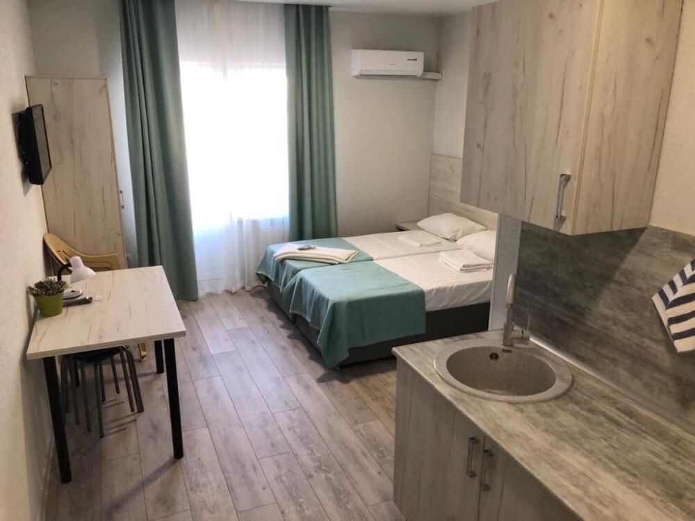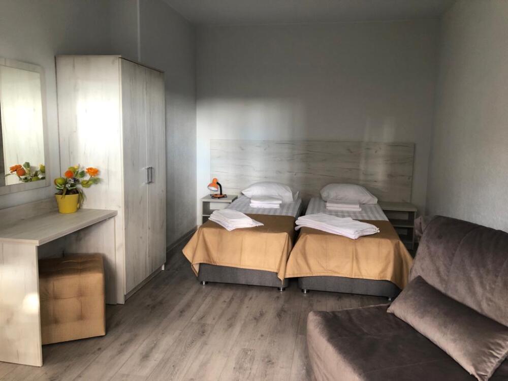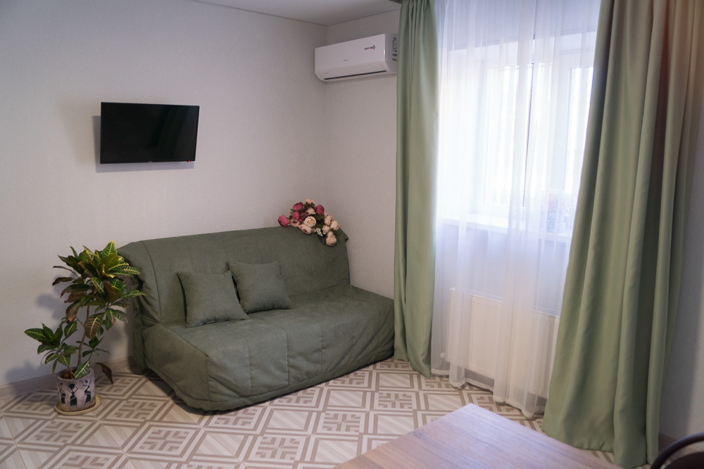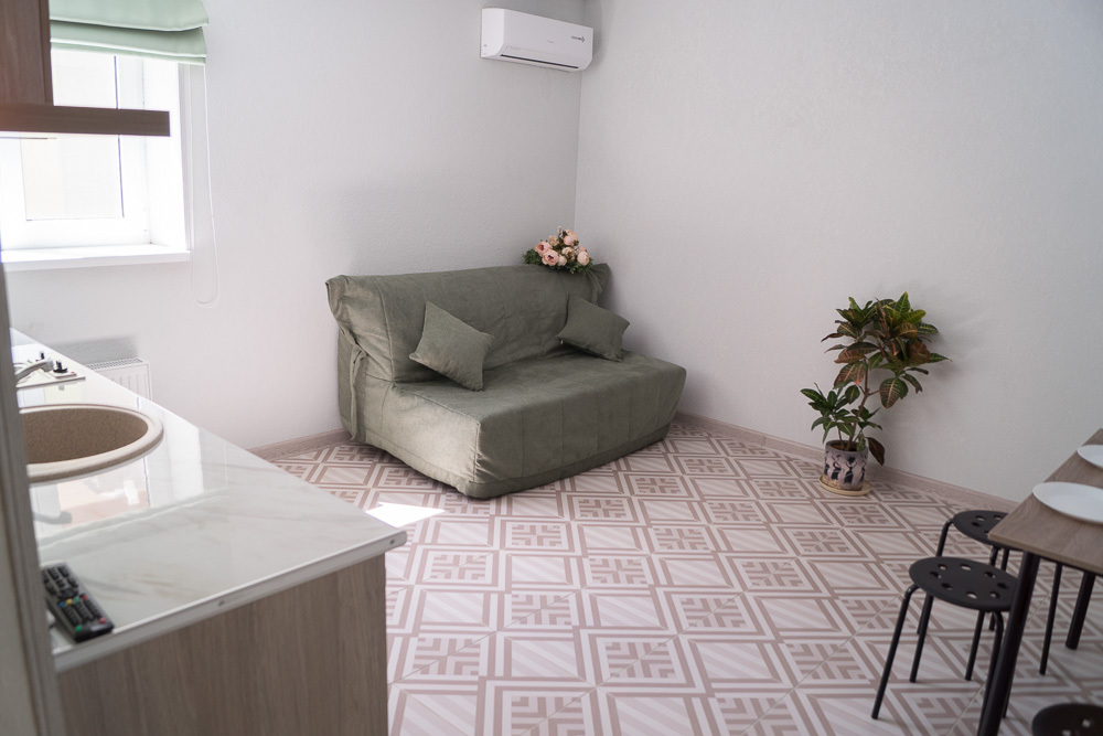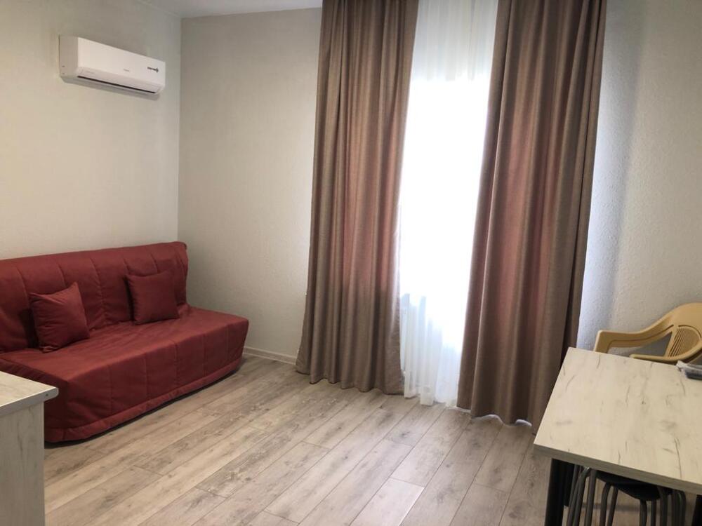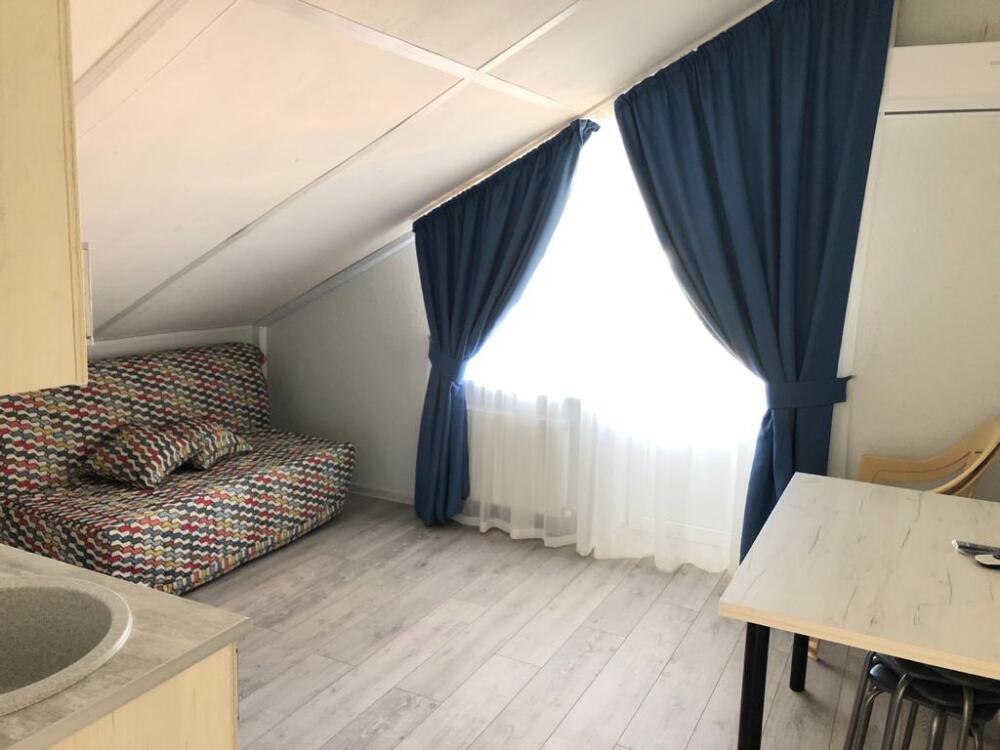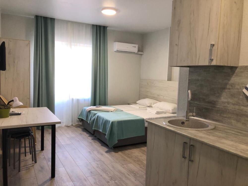 СТУДИО. (Находится на нулевом этаже). Номера 22 м. кв. (Прихожая с вешалкой и подчемоданником, комната с кухней, холодильник, чайник, столик со стульями и пуфом, шкаф, прикроватные тумбочки. Дополнительная раскладная кровать по требованию. Сплит система(кондиционер). В номере 2 односпальные кровати(90х200). Совмещенный с/у с душевой.
