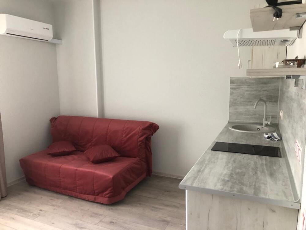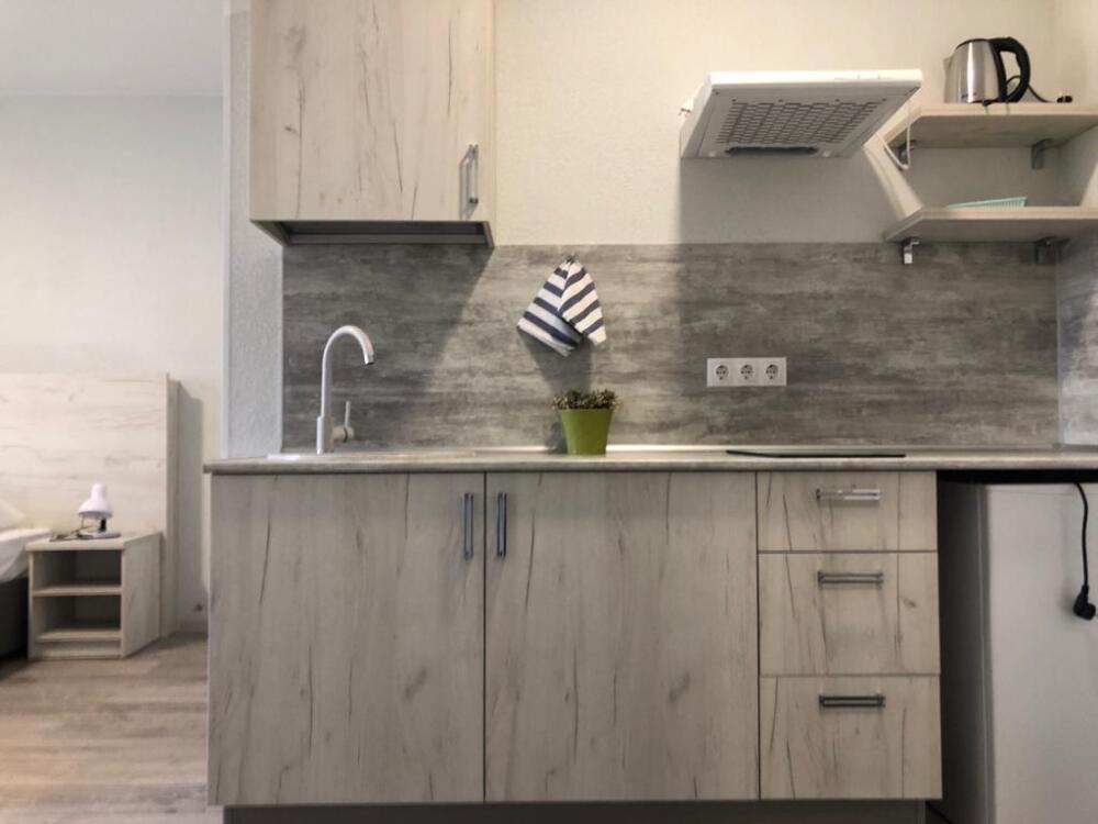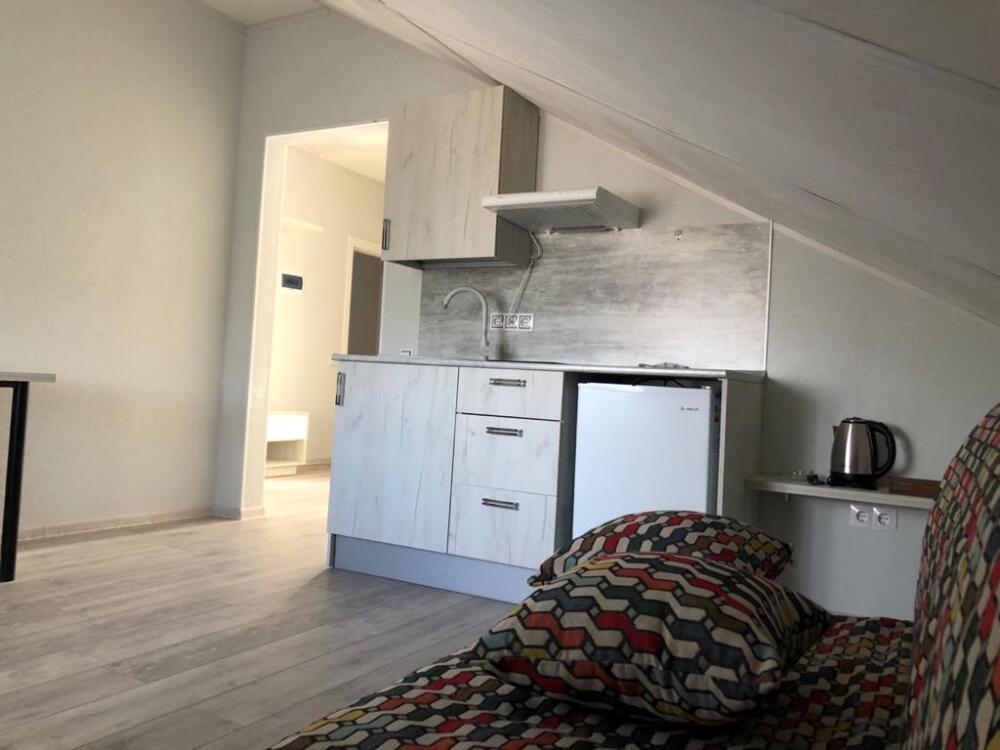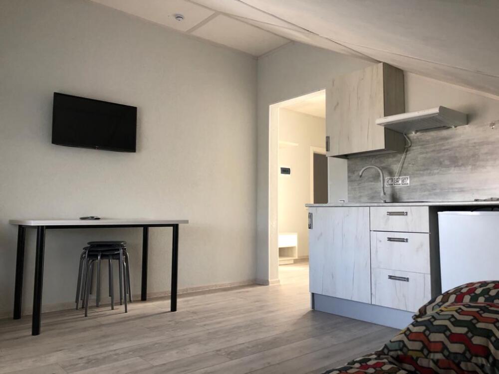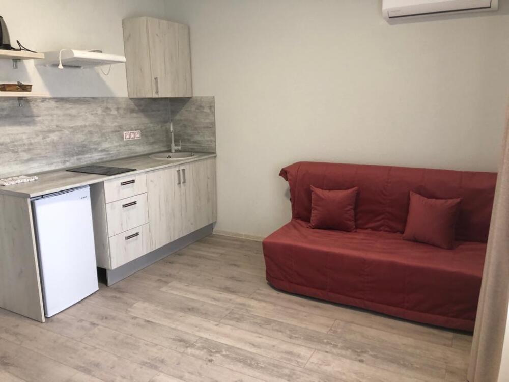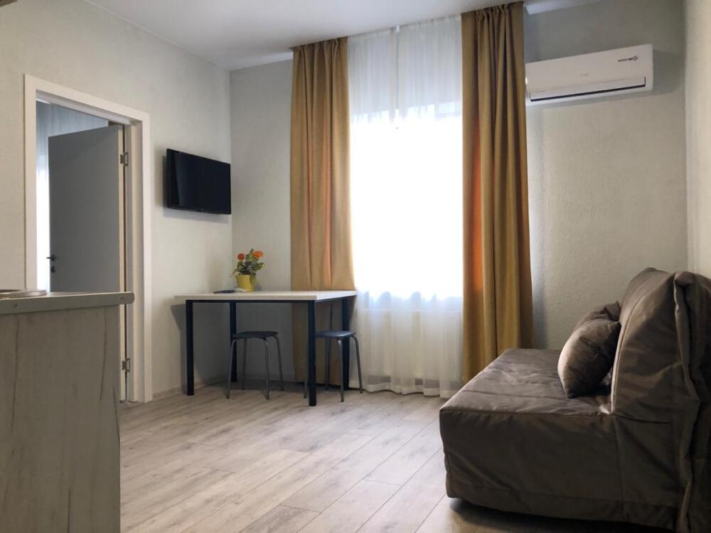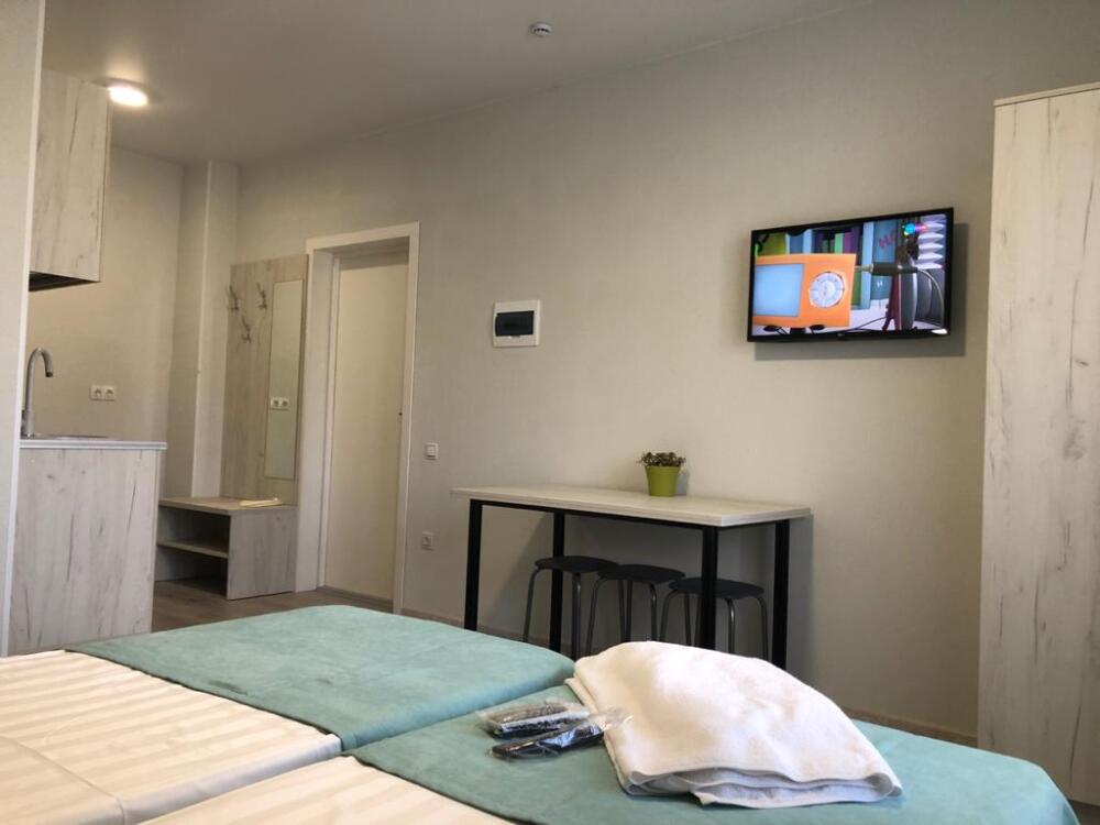 СТУДИО. (Находится на нулевом этаже). Номера 22 м. кв. (Прихожая с вешалкой и подчемоданником, комната с кухней, холодильник, чайник, столик со стульями и пуфом, шкаф, прикроватные тумбочки. Дополнительная раскладная кровать по требованию. Сплит система(кондиционер). В номере 2 односпальные кровати(90х200). Совмещенный с/у с душевой.