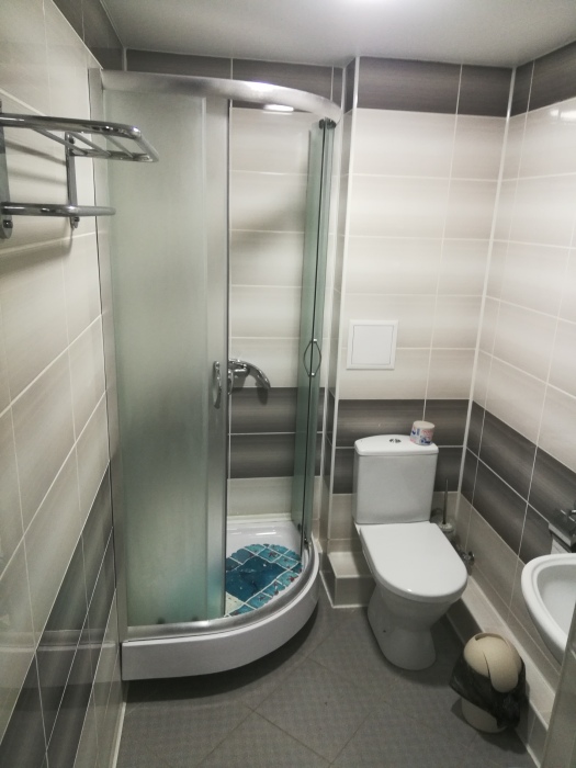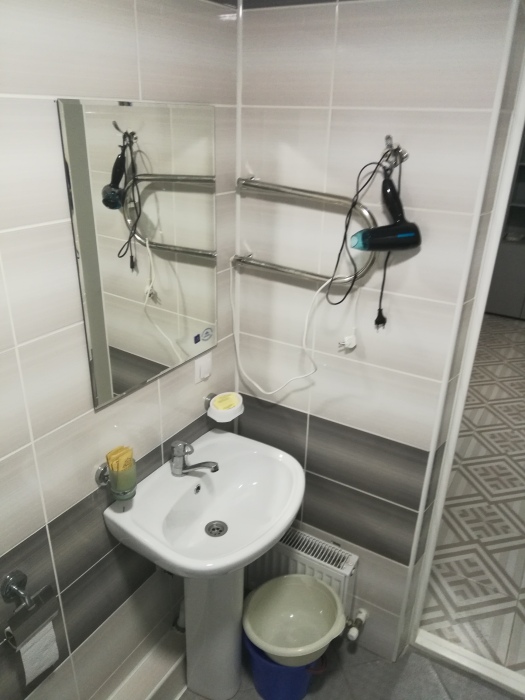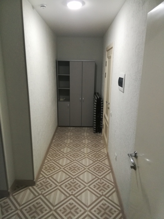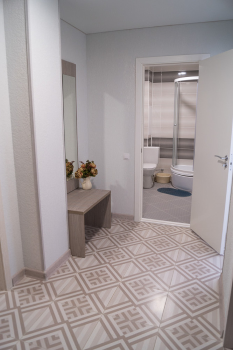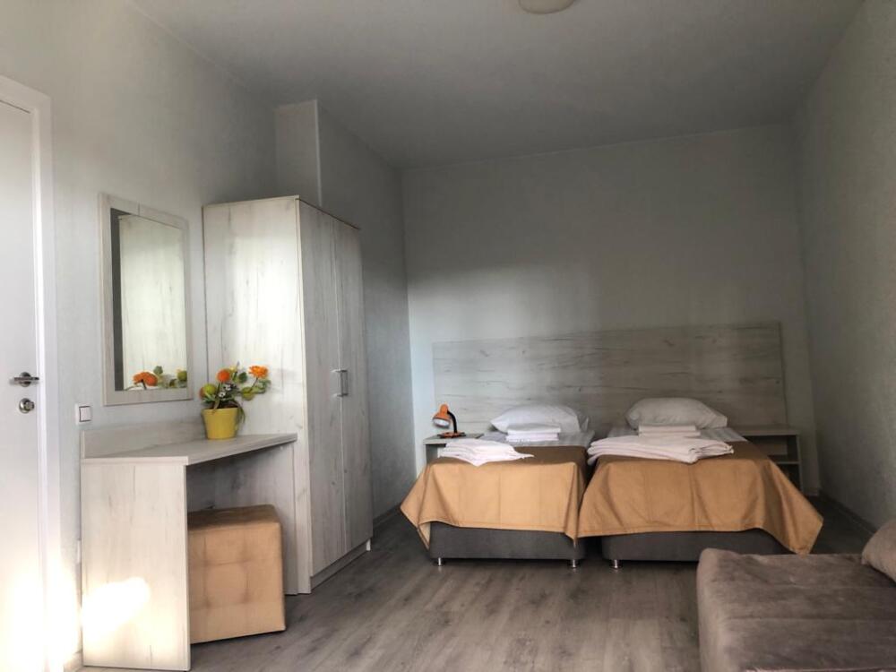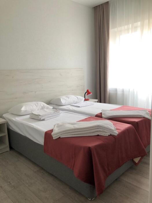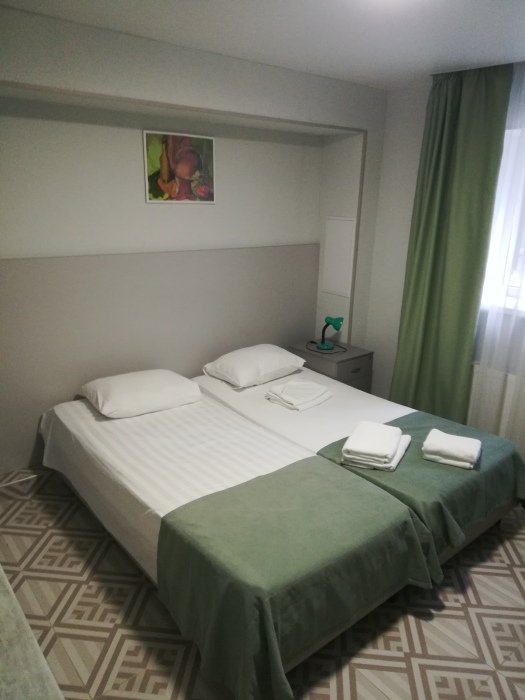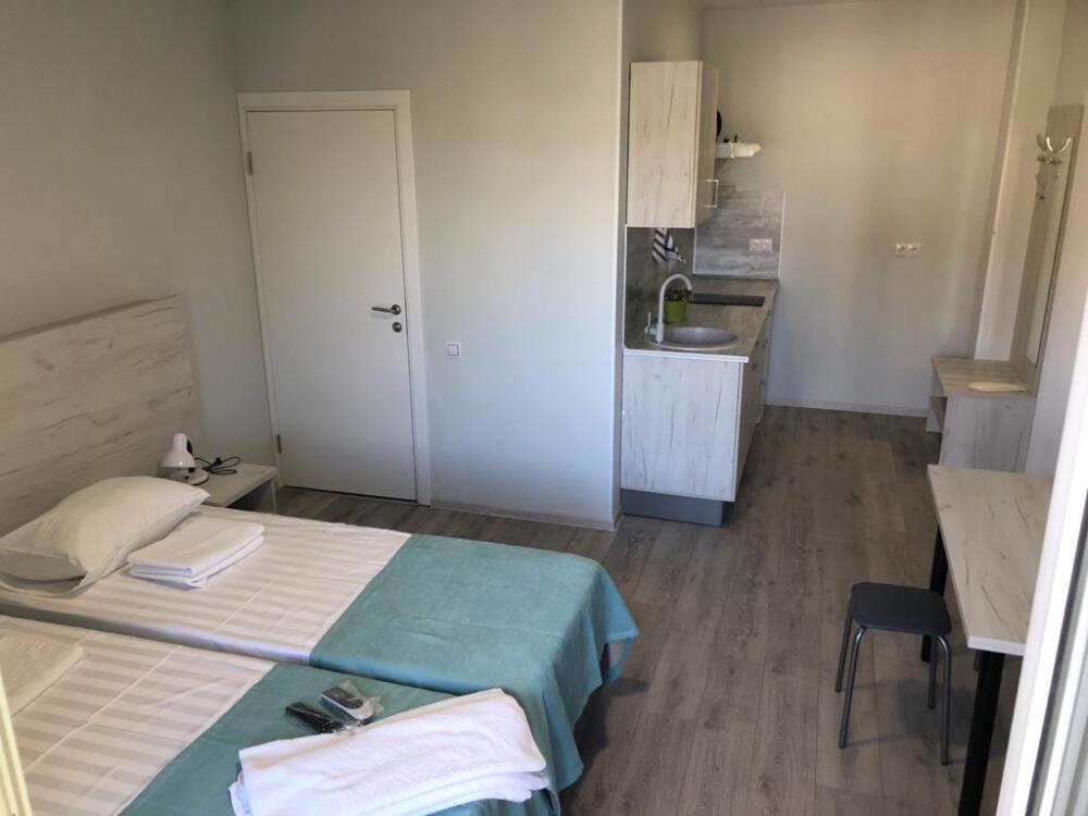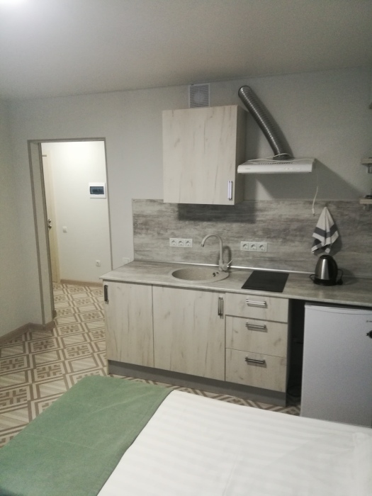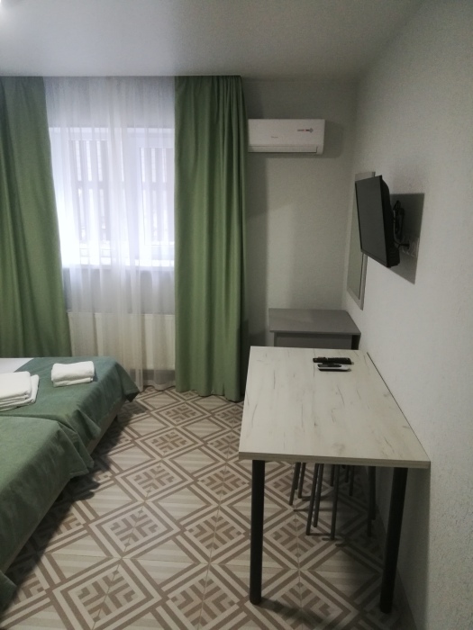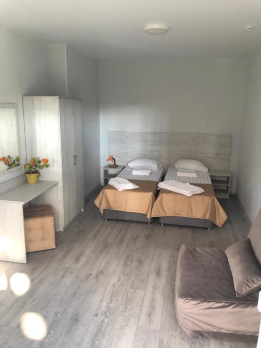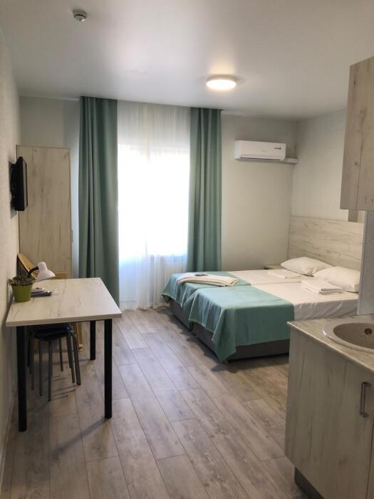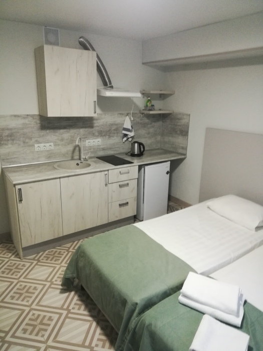 1 номер СТУДИО. (Находится на нулевом этаже). Номера 22 м. кв. (Прихожая с вешалкой и подчемоданником, комната с кухней, холодильник, чайник, столик со стульями и пуфом, шкаф, прикроватные тумбочки. Дополнительная раскладная кровать по требованию. Сплит система(кондиционер). В номере 2 односпальные кровати(90х200). Совмещенный с/у с душевой.