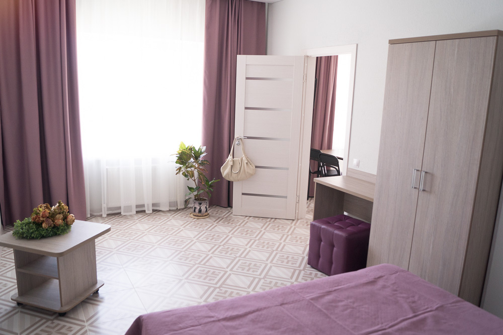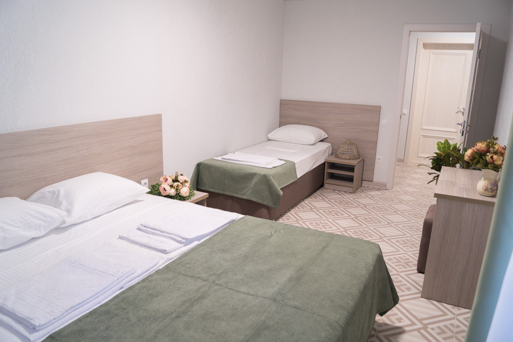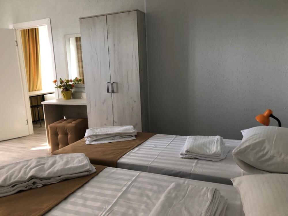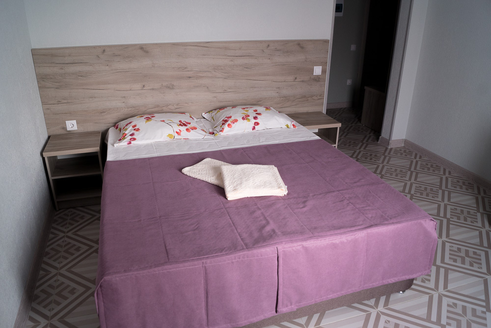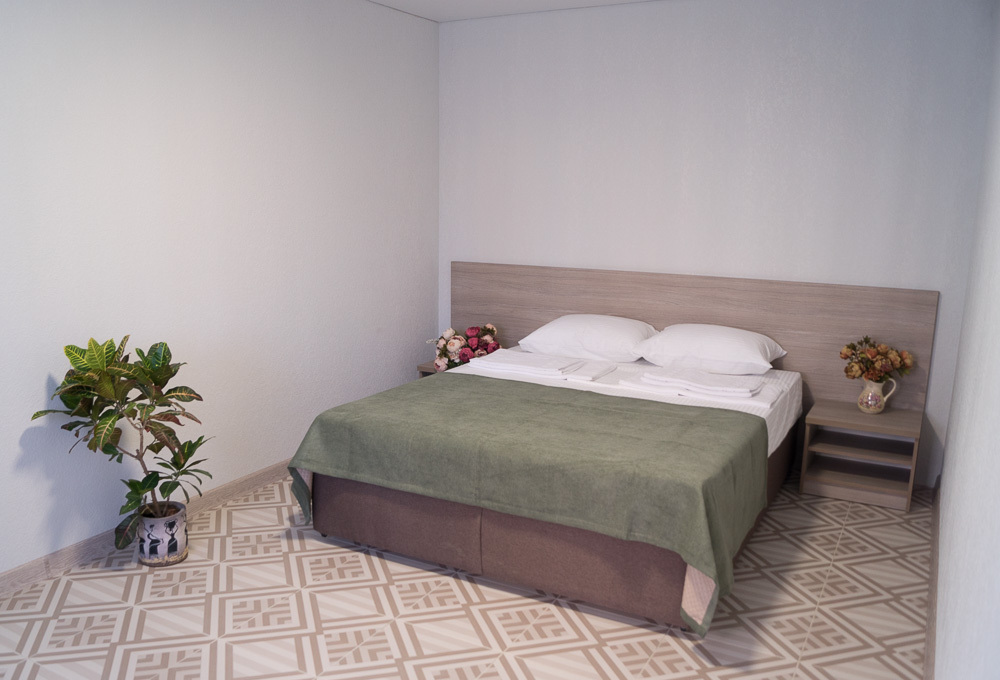 16 номеров АПАРТАМЕНТЫ С КУХНЕЙ. (Находятся на 1-3 этажах). Номера от 35 до 50 м. кв. (Прихожая, кухня гостиная с полностью меблированной кухней для полного приготовления обедов, чашки, ложки, поварешки, кастрюли, сковорода, чайник, холодильник, диван трансформер(200х200). И отдельная комната с большой двуспальной кроватью(200х200), или двумя раздельными кроватями(90х200), в некоторых номерах-кресло трансформер(90х200), туалетный столик с зеркалом и пуфом, шкаф для одежды, прикроватные тумбочки. Сплит система(кондиционер)Совмещенный с/у с душевой. 14 апартаментов с кухней имеют один или два балкона. Номера рассчитаны на 4-5 взрослых гостей.