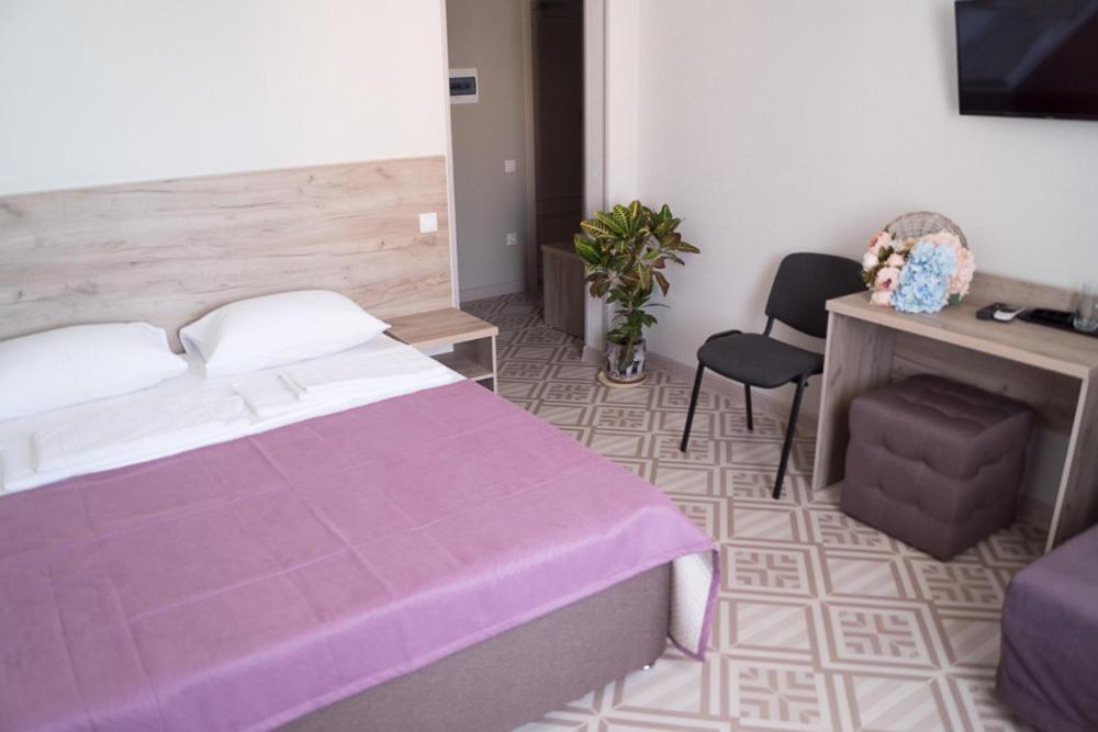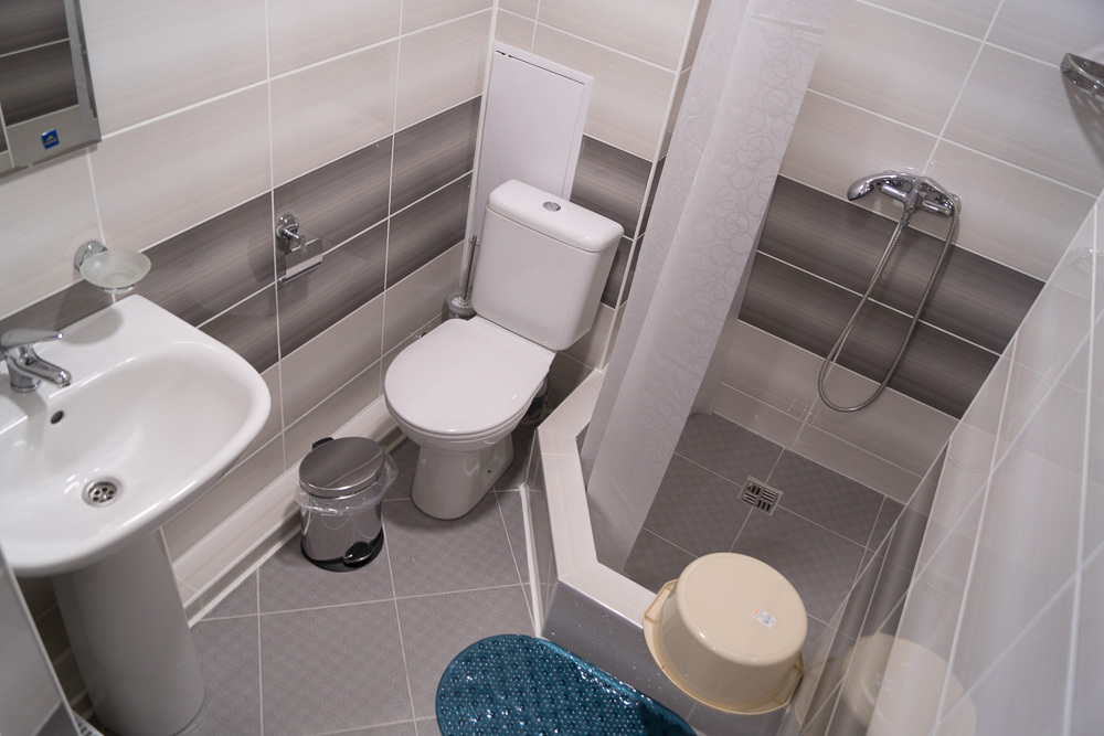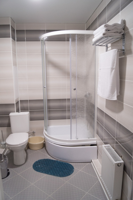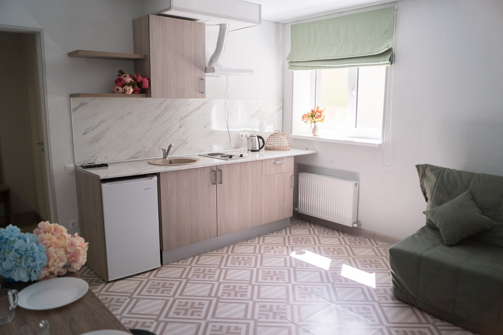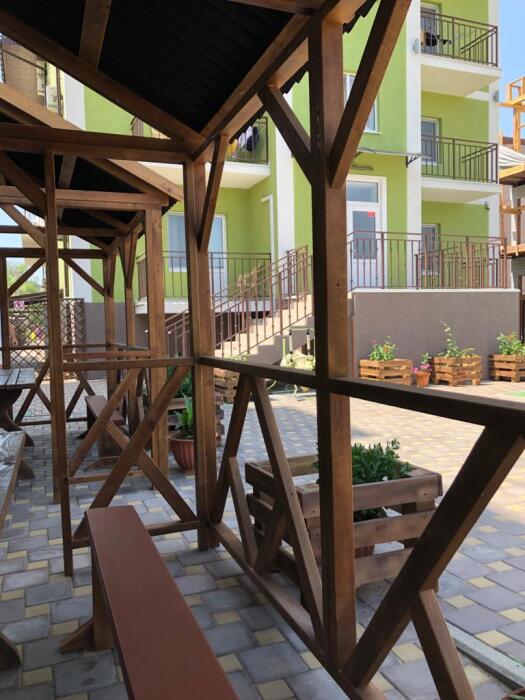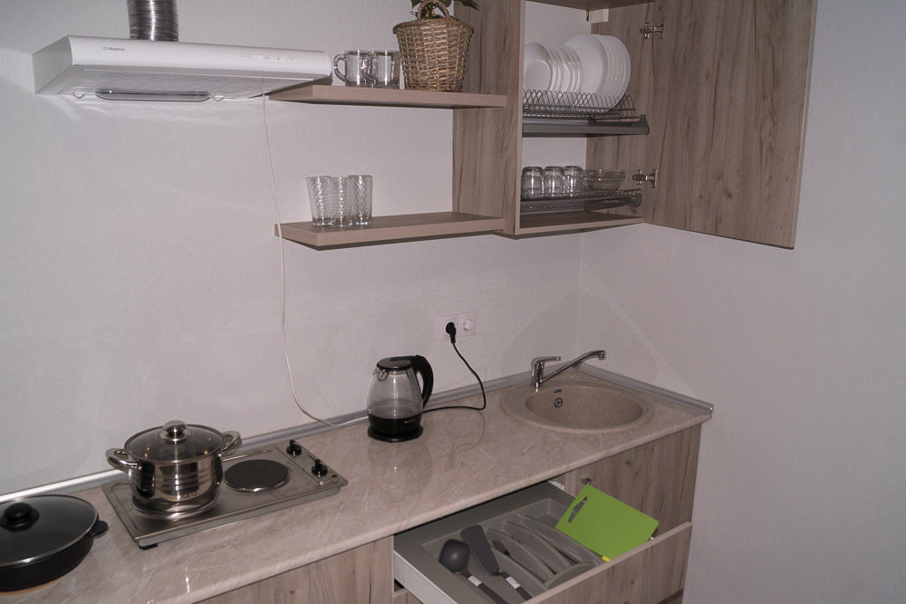 16 номеров АПАРТАМЕНТЫ С КУХНЕЙ. (Находятся на 1-3 этажах). Номера от 35 до 50 м. кв. (Прихожая, кухня гостиная с полностью меблированной кухней для полного приготовления обедов, чашки, ложки, поварешки, кастрюли, сковорода, чайник, холодильник, диван трансформер(200х200). И отдельная комната с большой двуспальной кроватью(200х200), или двумя раздельными кроватями(90х200), в некоторых номерах-кресло трансформер(90х200), туалетный столик с зеркалом и пуфом, шкаф для одежды, прикроватные тумбочки. Сплит система(кондиционер)Совмещенный с/у с душевой. 14 апартаментов с кухней имеют один или два балкона. Номера рассчитаны на 4-5 взрослых гостей.