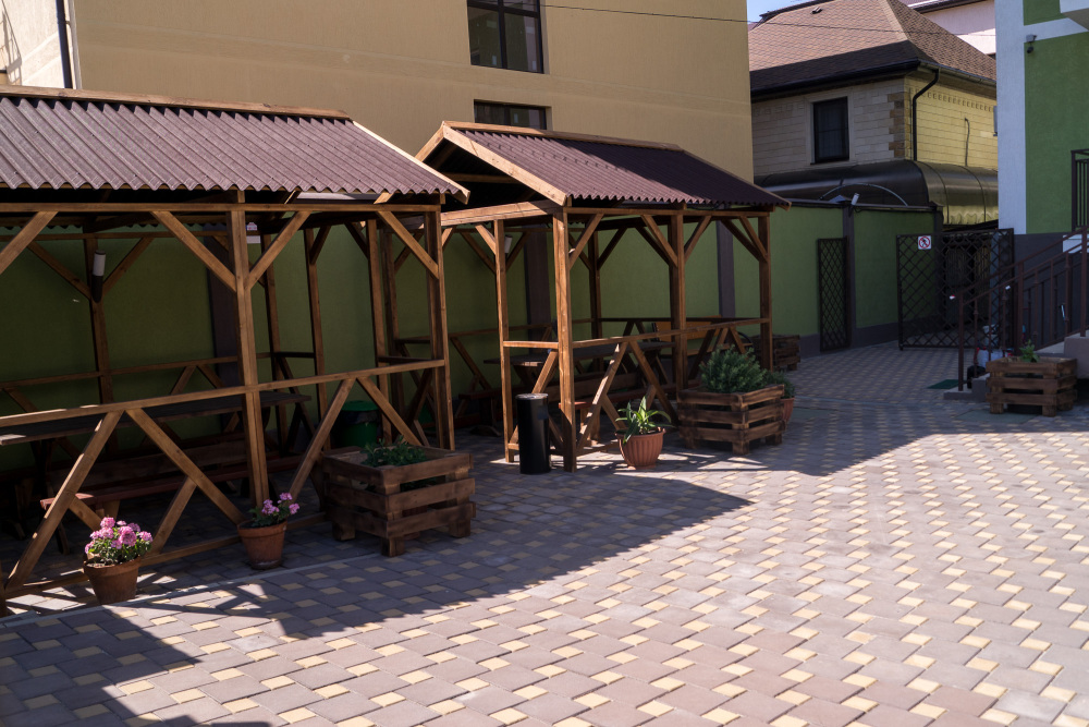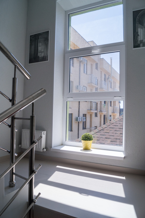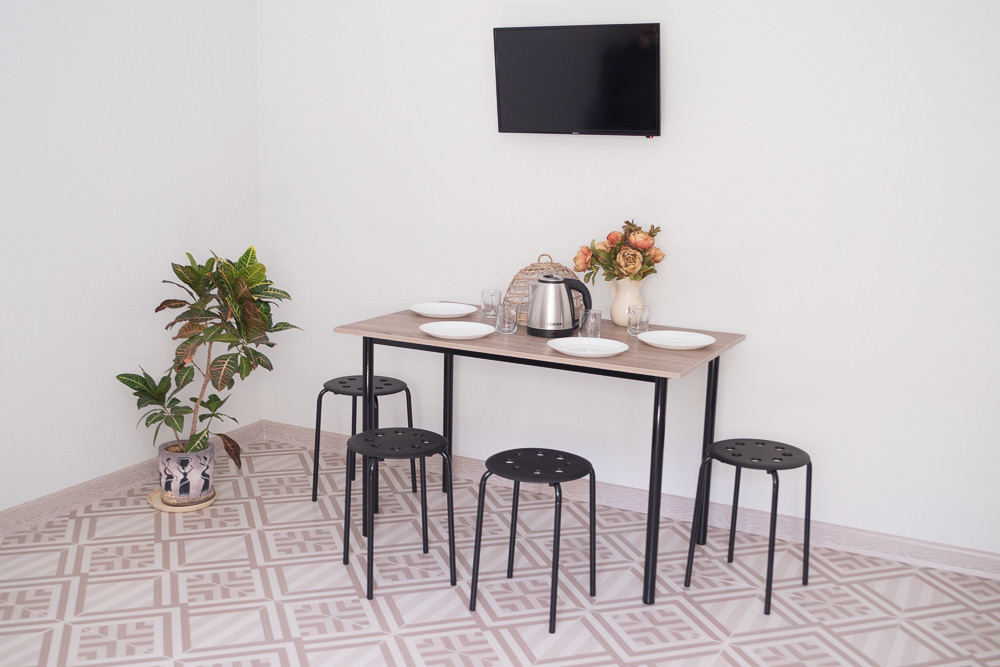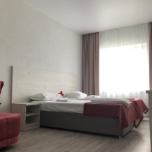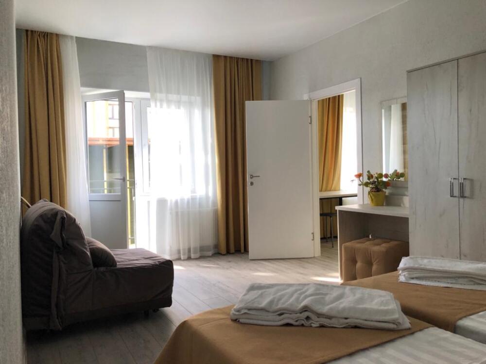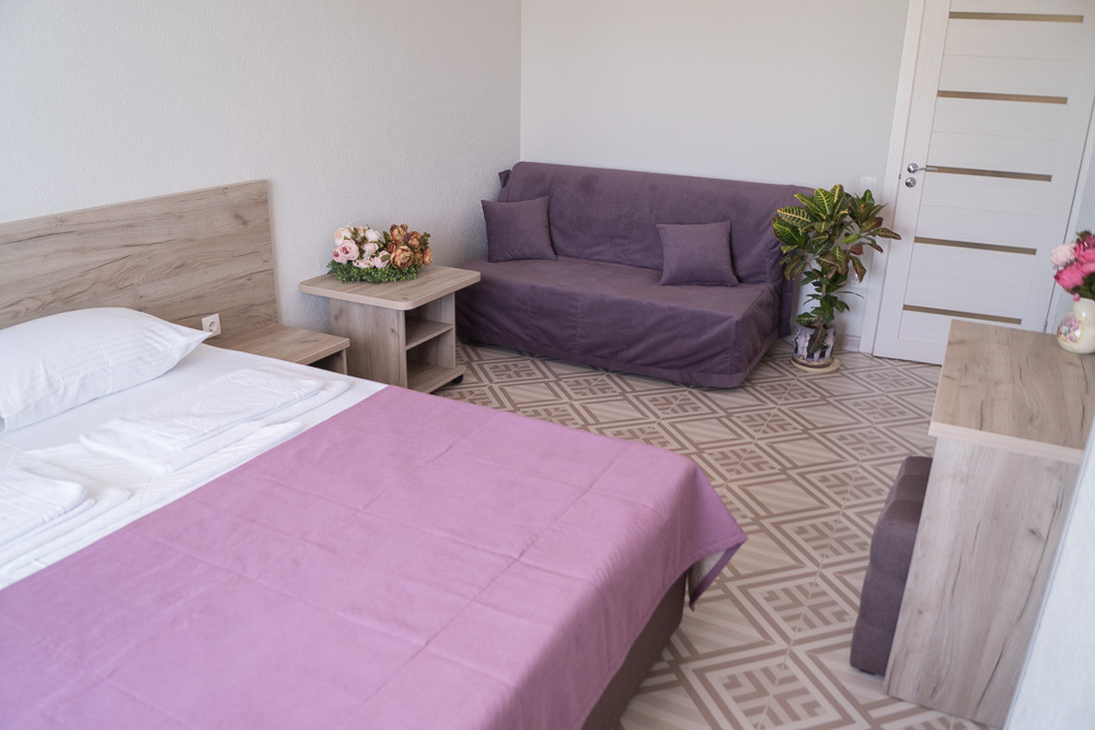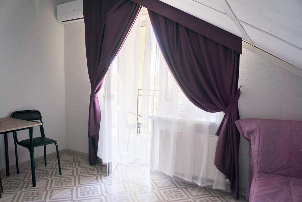 4 номера СТУДИО. (Находятся на 1-3 этажах). Номера 22 м. кв. (Прихожая с вешалкой и подчемоданником, комната с кухней, холодильник, чайник, столик со стульями и пуфом, шкаф, прикроватные тумбочки. Дополнительная раскладная кровать по требованию. Сплит система(кондиционер). В номерах большие двуспальные кровати(180х200). Совмещенный с/у с душевой. 3 номера СТУДИО с балконами.