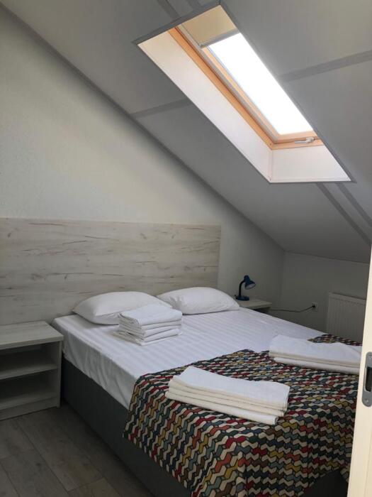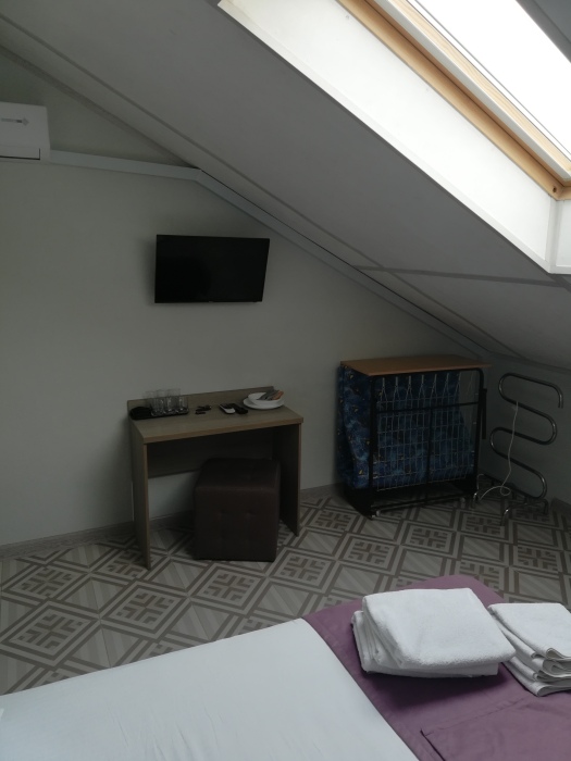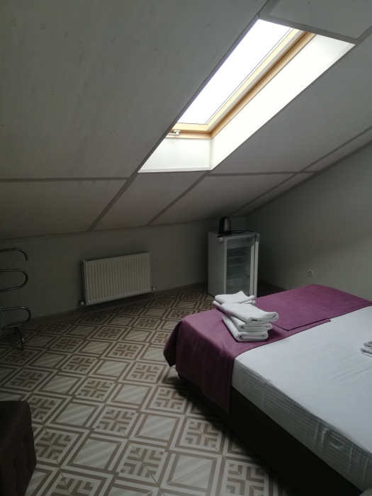1 номер СТАНДАРТНЫЙ НА МАНСАРДНОМ ЭТАЖЕ. Номер 22м. кв. (Прихожая, с вешалкой и подчемоданником, большая двуспальная кровать, кресло трансформер(90х200), шкаф, туалетный столик с пуфом и зеркалом, прикроватные тумбочки. Холодильник, чайник, посуда (тарелки, стаканы, кружки, ложки, вилки, ножи, разделочная доска. Сплит система(кондиционер), Совмещенный с/у с душевой. Номер без балкона.