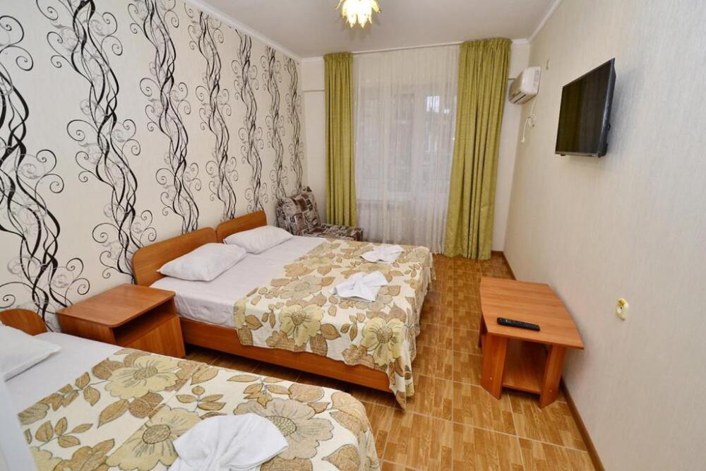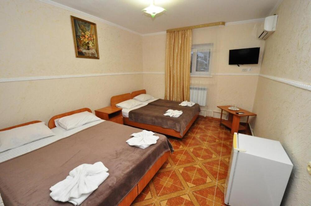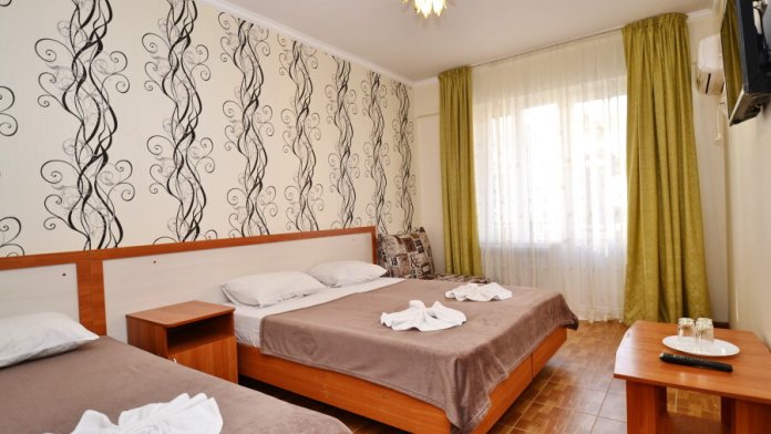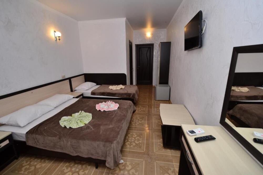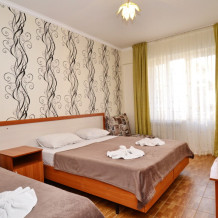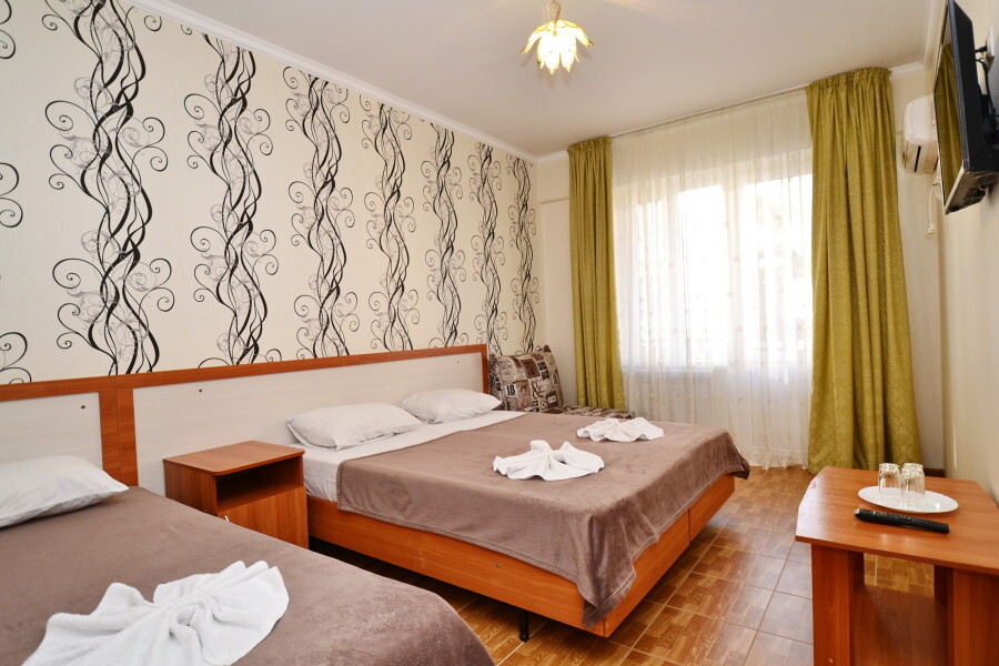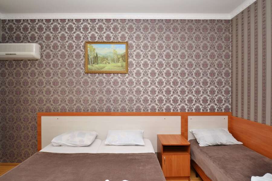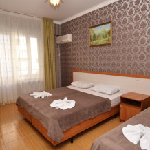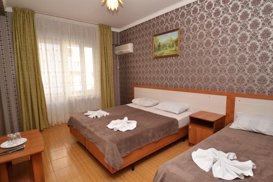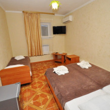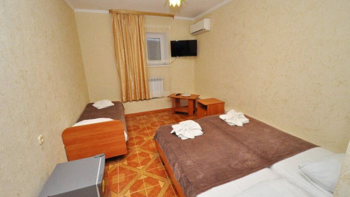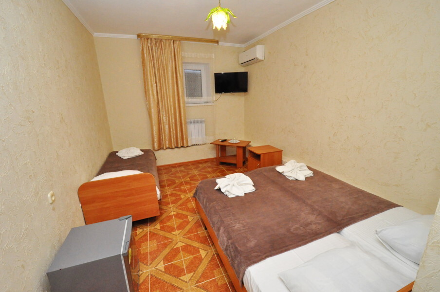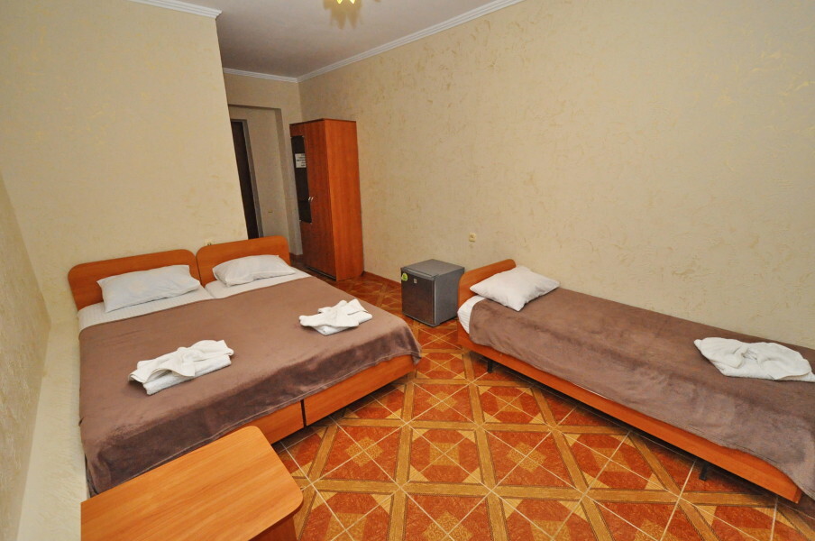 В номере: двуспальная кровать (или 2 односпальные кровати), односпальная кровать, прикроватные тумбочки, шкаф для одежды, жк телевизор, сплит-система, холодильник, стол, зеркало. Есть своя отдельная ванная комната с санузлом, где душ, туалет, фен (по запросу), ванные принадлежности (мыло и туалетная бумага), полотенца лицевые и банные. Так же в каждом номере есть стол и стулья на балконе. По запросу выдаем чайник. Номера находятся как на 1 этаже, так и на 2 этаже, на 3 этаже, на 4 этаже. Этажность при заселении по факту, а не по запросу.
