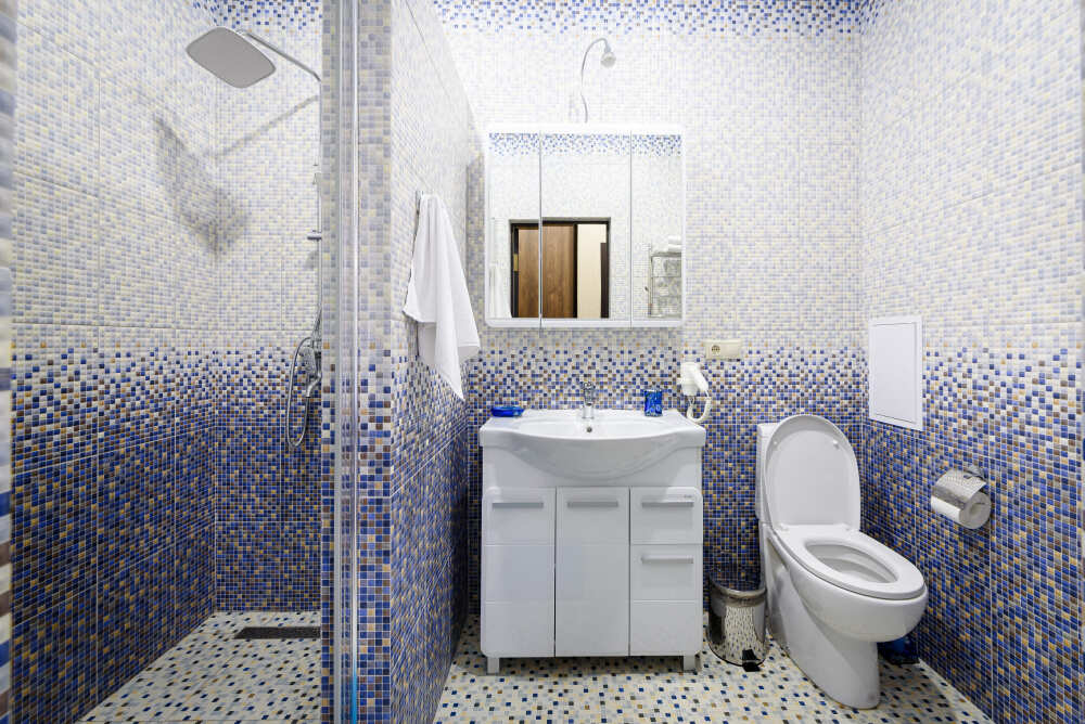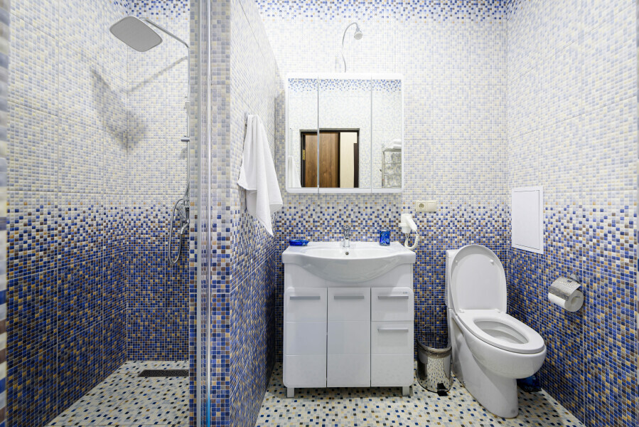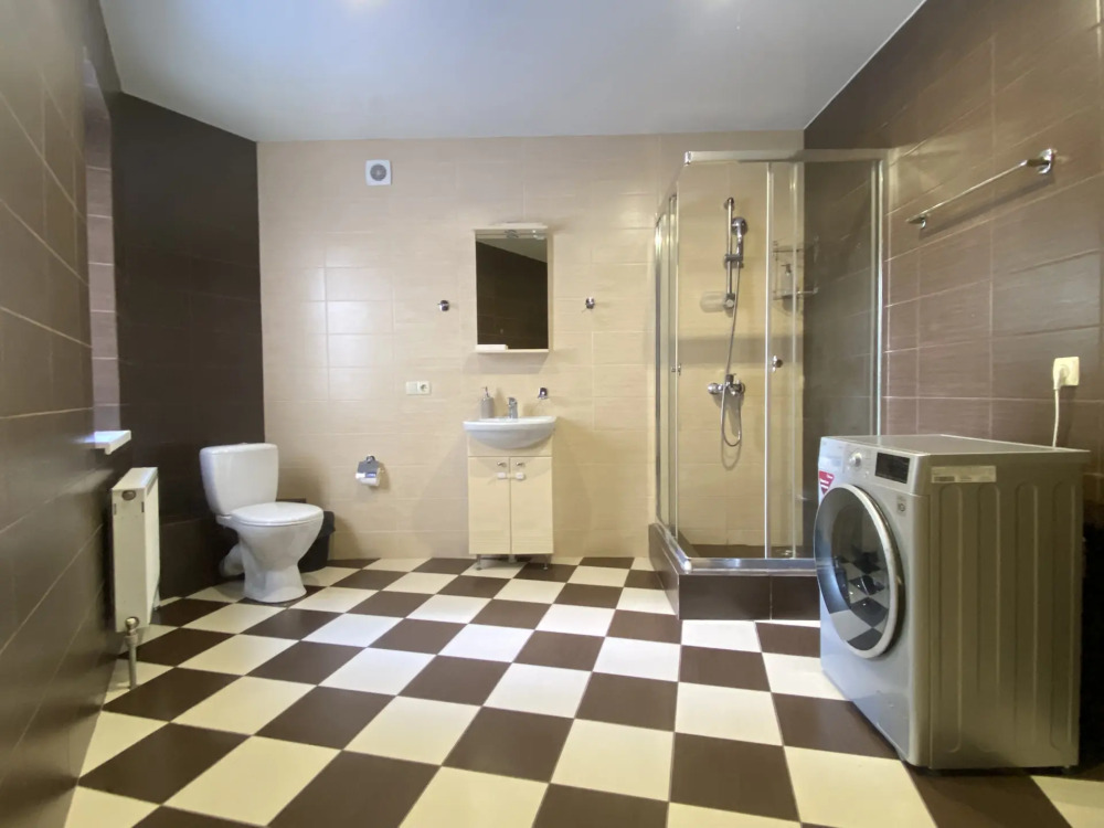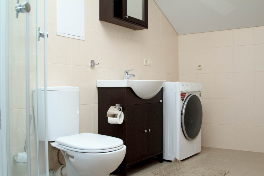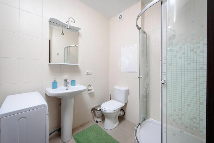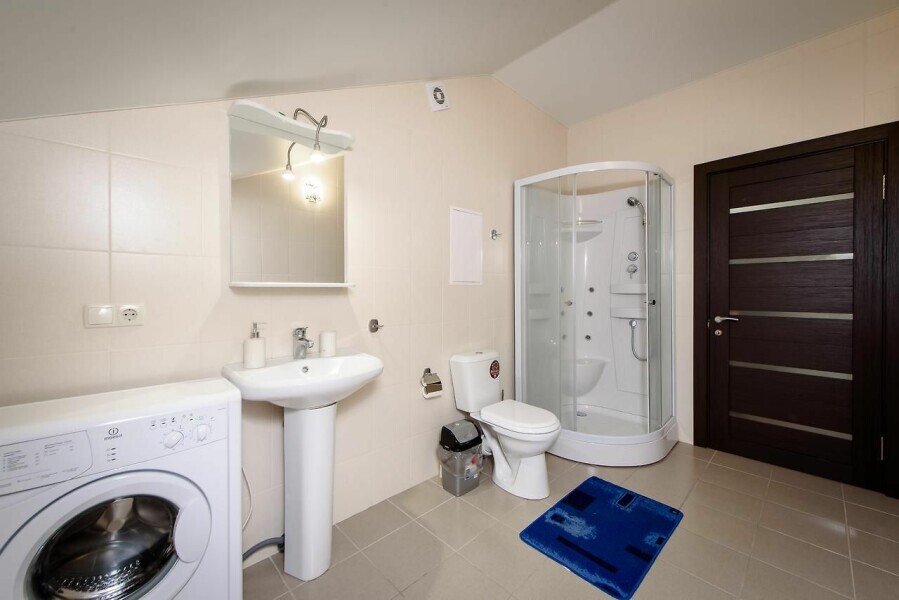 Санузел, душевая кабина, стиральная машина, фен, тапочки, шампунь и гель для душа.