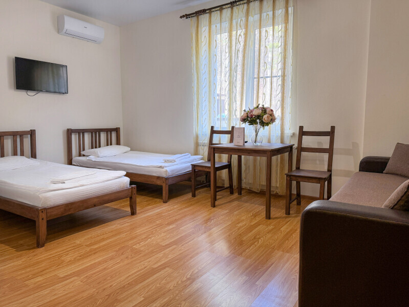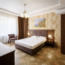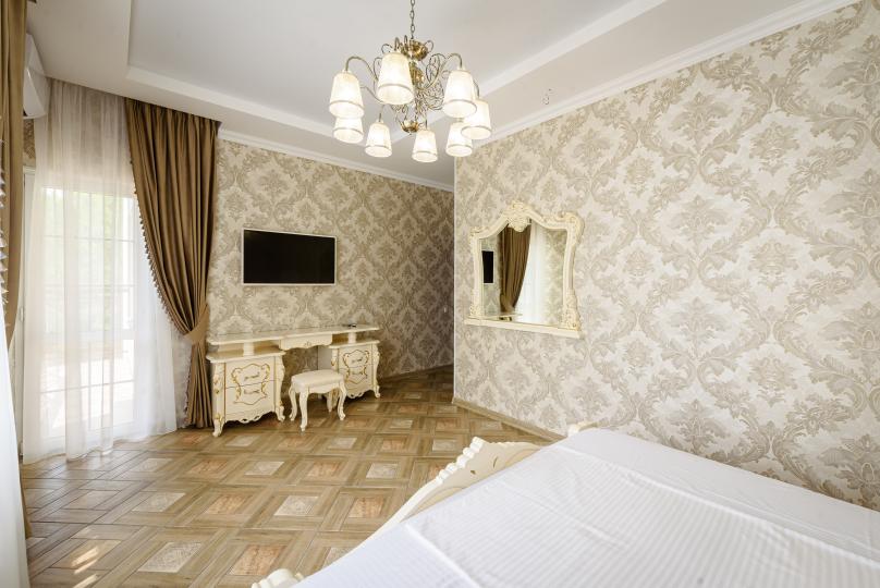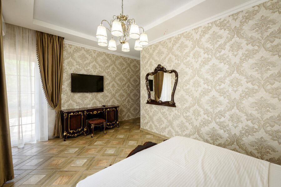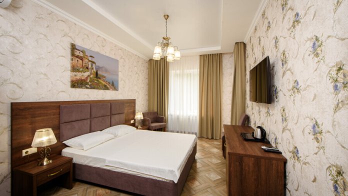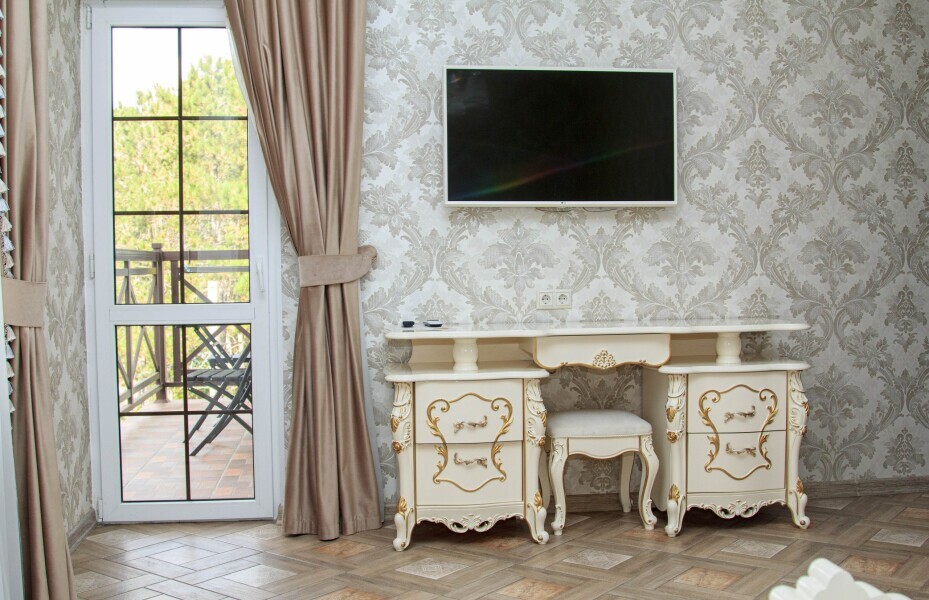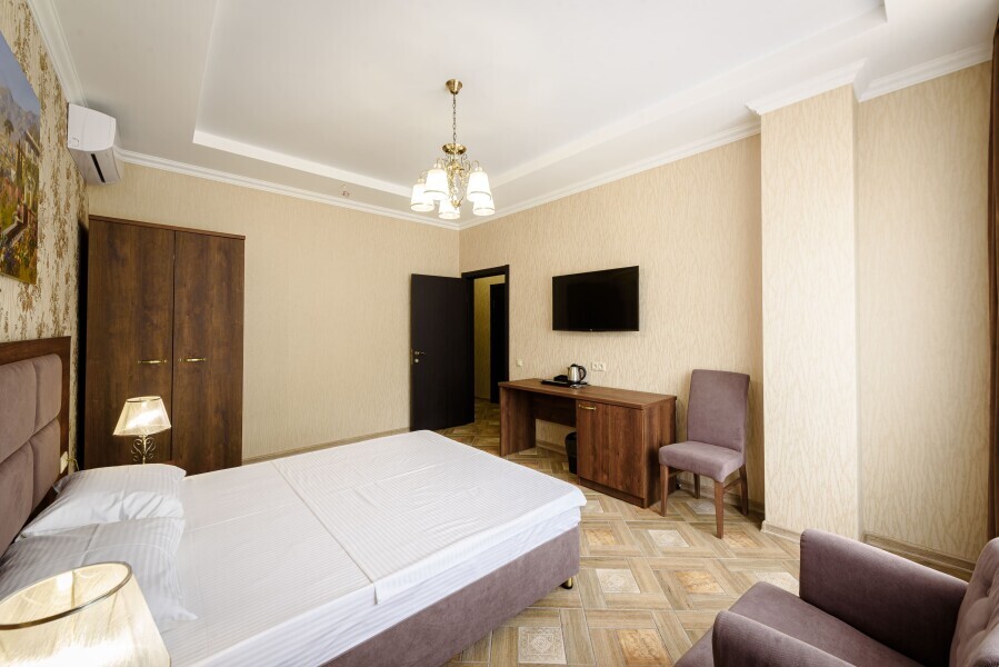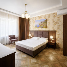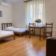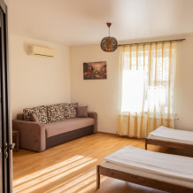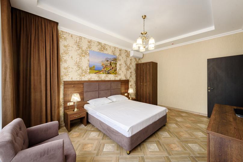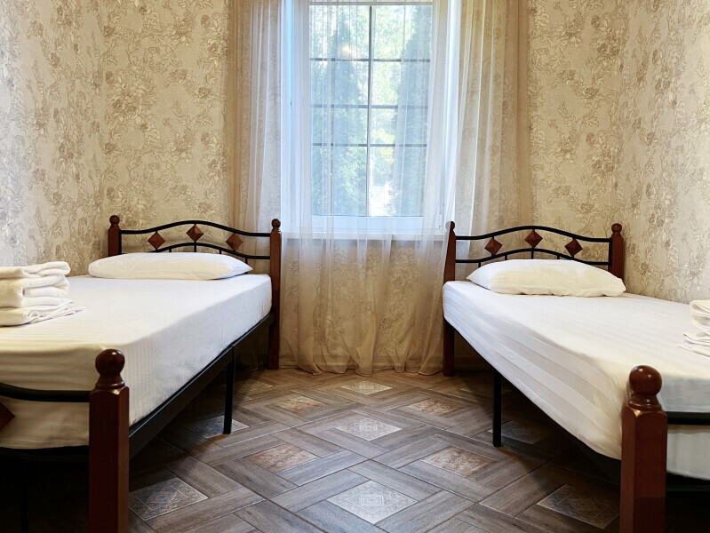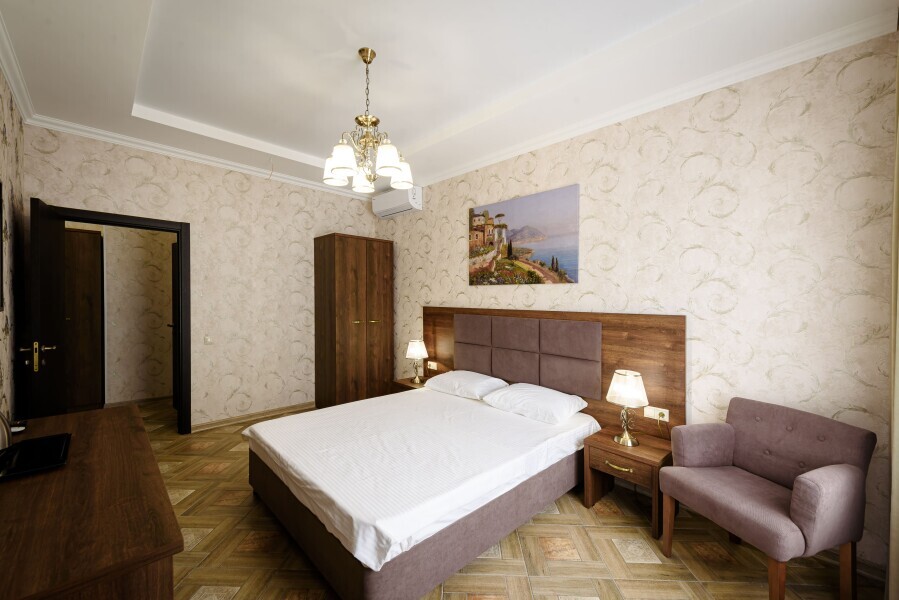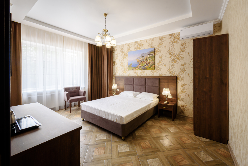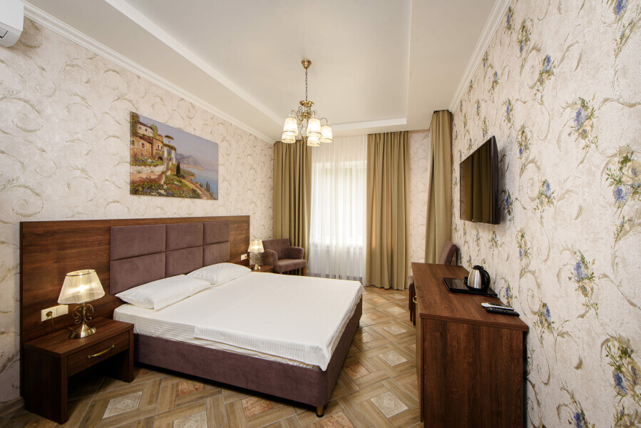 Двухкомнатный номер 35м² на 1, 2 или 3 этаже с балконом, видом на сосновый лес (некоторые номера с частичным видом на озеро Абрау), вместимостью до 4 гостей.Двухспальная кровать, шкаф, рабочий стол, кресло, холодильник, чайник, чайная пара, кондиционер, москитные сетки, спутниковое TV, wi-fi. Две односпальные кровати во второй комнате. Санузел, душ, фен, тапочки, шампунь, гель для душа, мыло и крем для рук и тела, зубные наборы. Подогреваемый бассейн, бесплатная парковка, детская площадка, кафе.