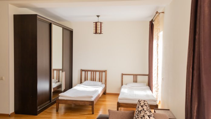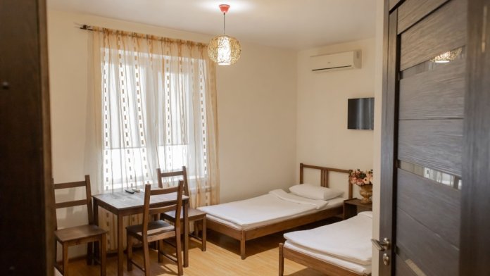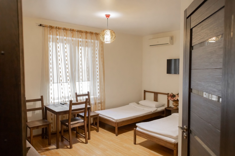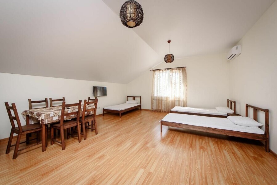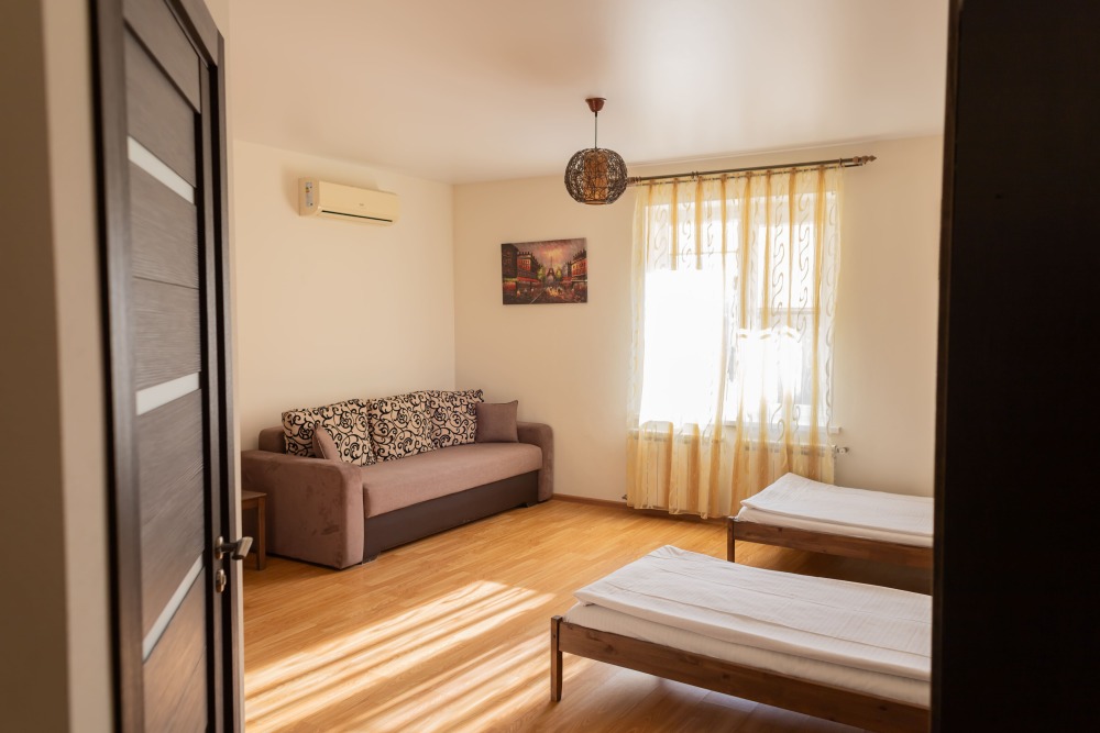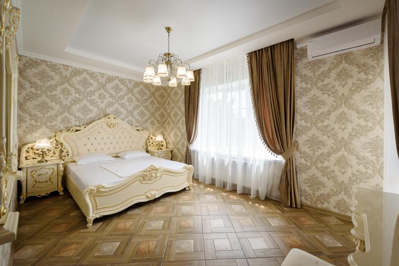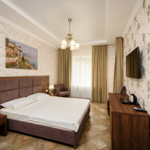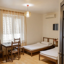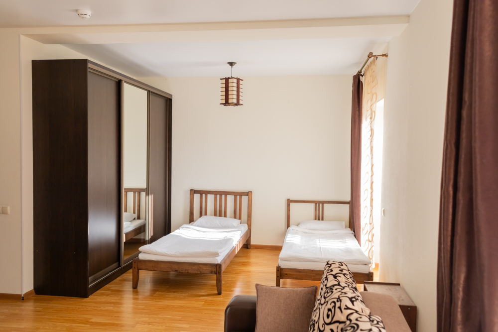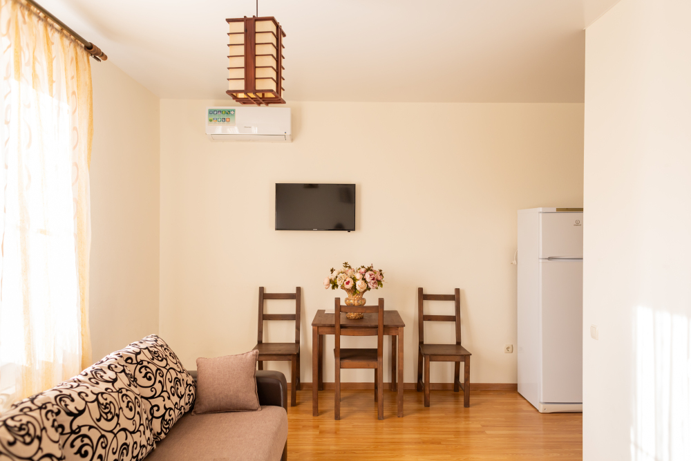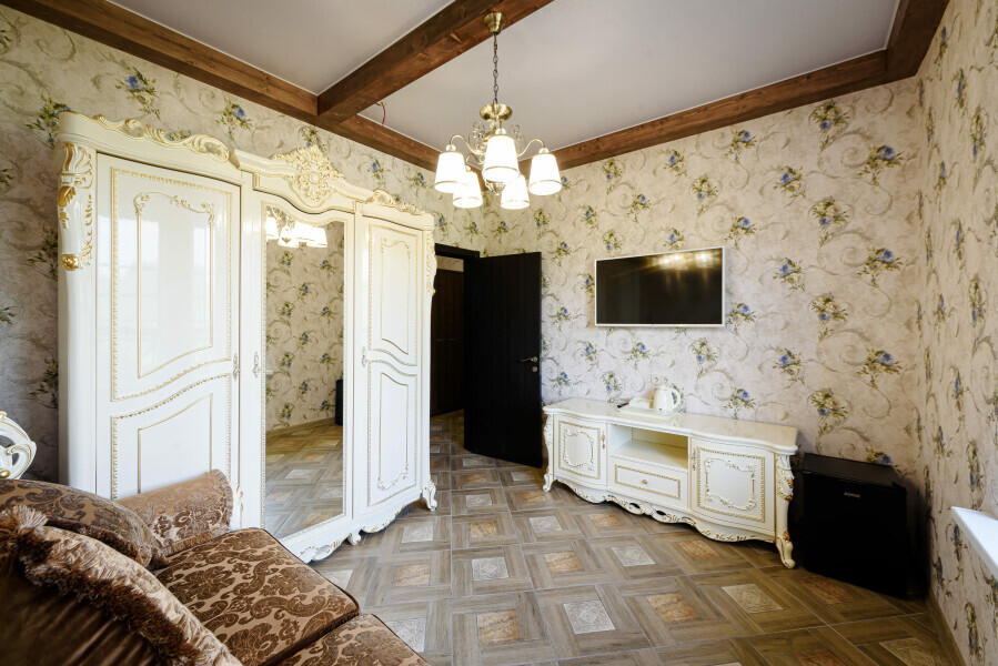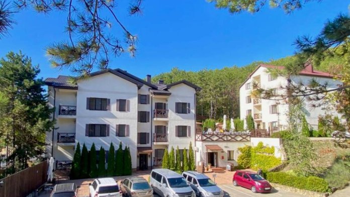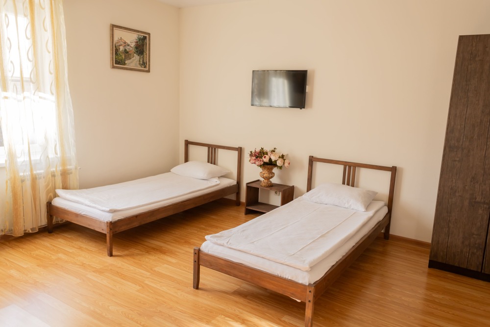 Двухкомнатный номер 35м² на 1, 2 или 3 этаже с балконом, видом на сосновый лес (некоторые номера с частичным видом на озеро Абрау), вместимостью до 4 гостей.Двухспальная кровать, шкаф, рабочий стол, кресло, холодильник, чайник, чайная пара, кондиционер, москитные сетки, спутниковое TV, wi-fi. Две односпальные кровати во второй комнате. Санузел, душ, фен, тапочки, шампунь, гель для душа, мыло и крем для рук и тела, зубные наборы. Подогреваемый бассейн, бесплатная парковка, детская площадка, кафе.