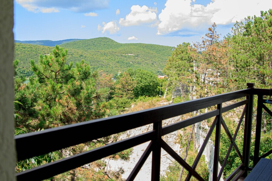 Двухкомнатный номер 42 м² на 2 или 3 этаже с большим балконом, видом на озеро Абрау и заповедный сосновый лес, до 4 гостей.