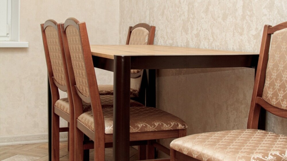 Кухонный гарнитур с варочной панелью, холодильник, большой стол, стулья, чайник, посуда на 6 персон (тарелки, чашки, ложки, вилки, ножи, доска разделочная, кастрюля, сковорода).