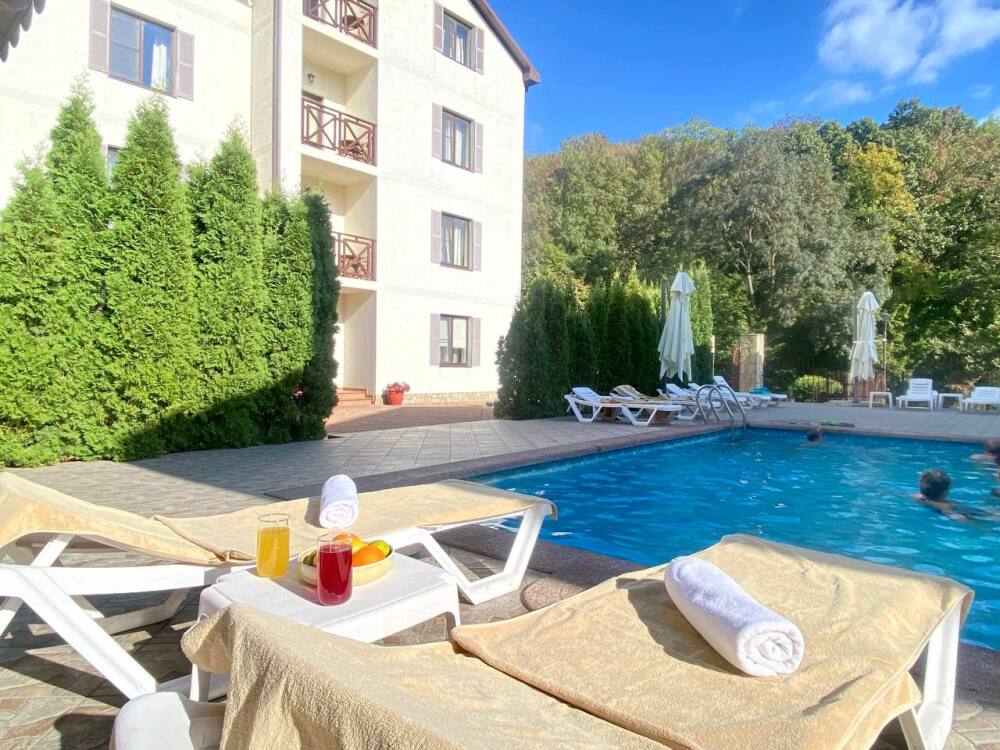 Номер площадью 35м² на 2 или 3 этаже верхнего корпуса с видом на бассейн, лес, вместимостью до 4 гостей.