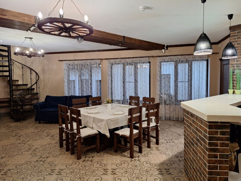 На первом этаже - гостиная с обеденным столом, раскладной диван, кухня, санузел.