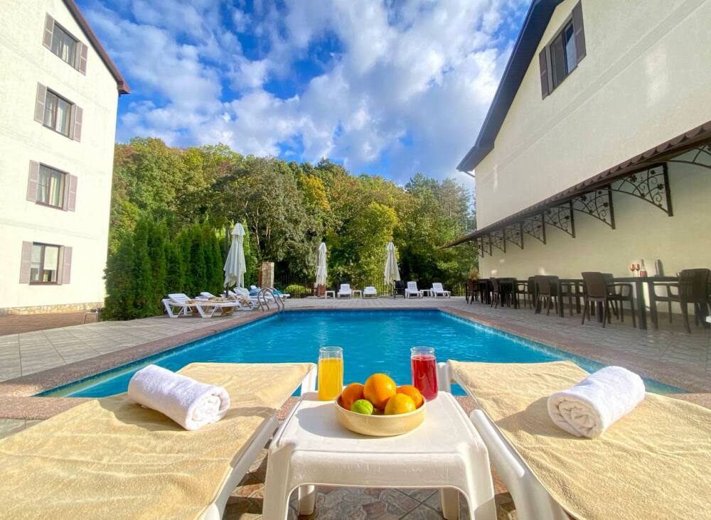 Подогреваемый бассейном, бесплатная парковка, детская площадка, кафе.