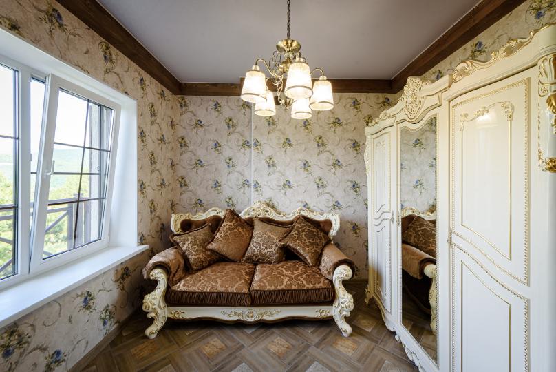 Номер площадью 27м² на 2 или 3 этаже верхнего корпуса с видом на двор и лес, вместимостью до 4 гостей.